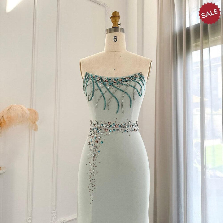 This Dreamy Vow Turquoise Crystal Luxury dress is perfect for any special occasion. Featuring a stunning mermaid silhouette and intricate crystal detailing, it exudes elegance and sophistication. Crafted from high-quality materials, this dress offers both style and comfort. Elevate your look with this truly luxurious piece.