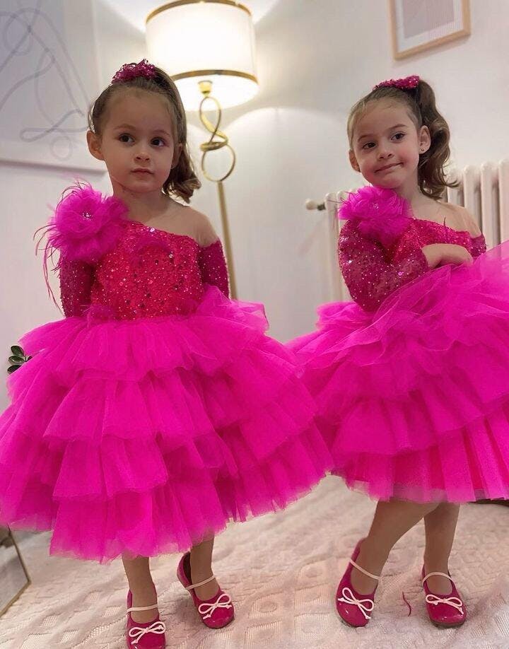Sequins Fuchsia Girl Dress Knee Length Arabic Princess Party Gown J238