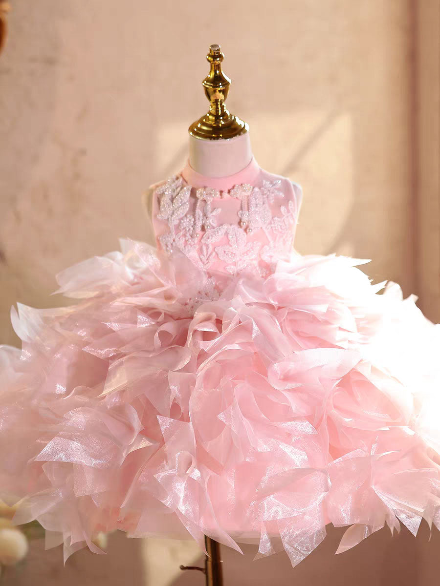 Luxury Pink Layered Ruffle Flower Girl Dress Kids Birthday Party D250