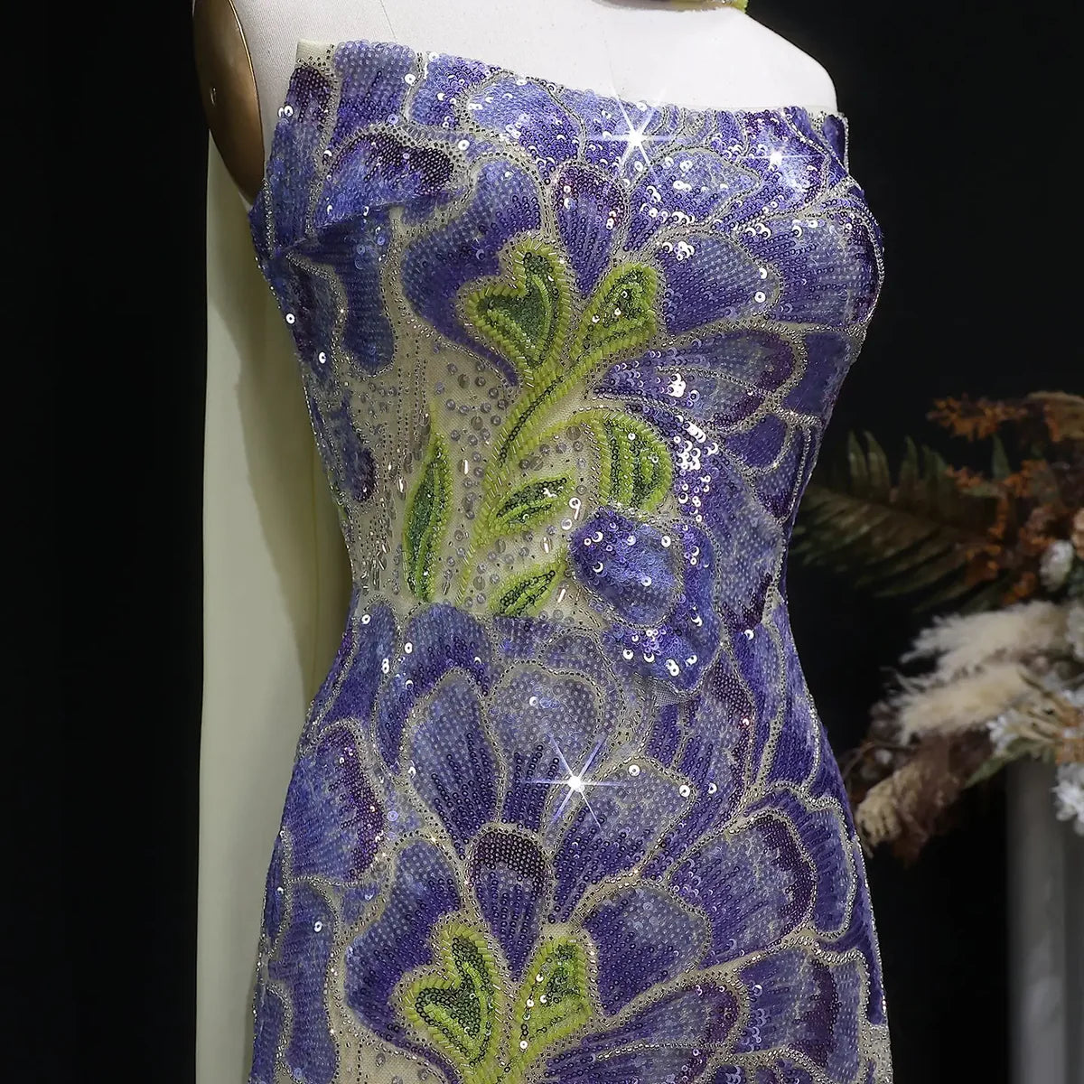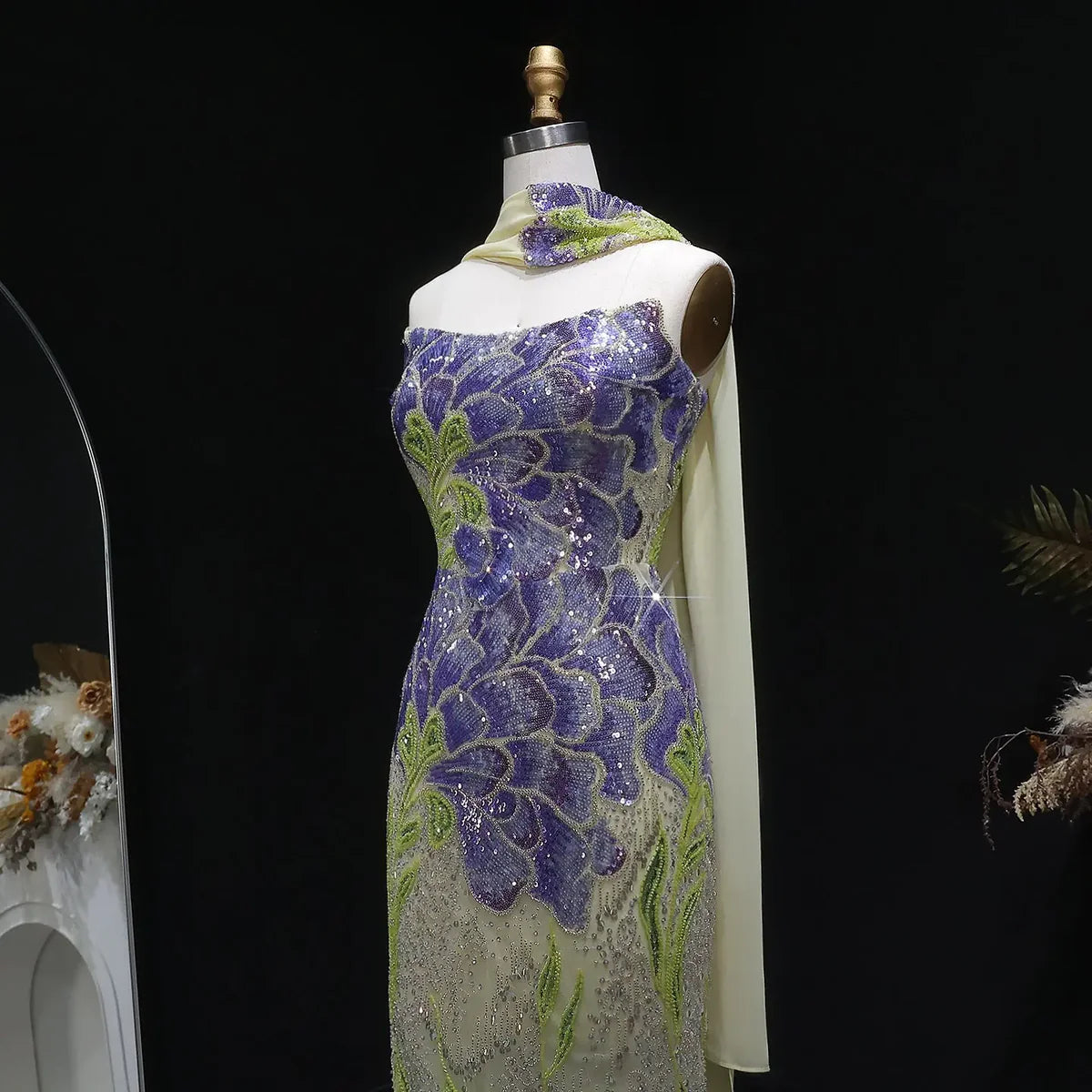 Elegant Purple Green Beaded Sequin Evening Dress with Cape SS511