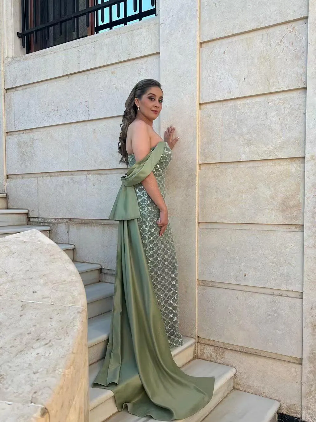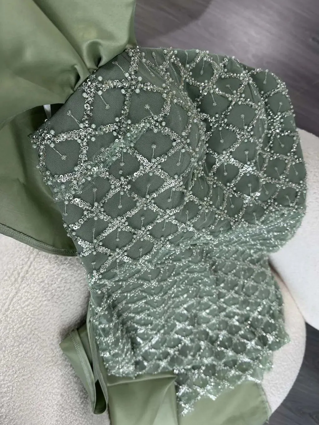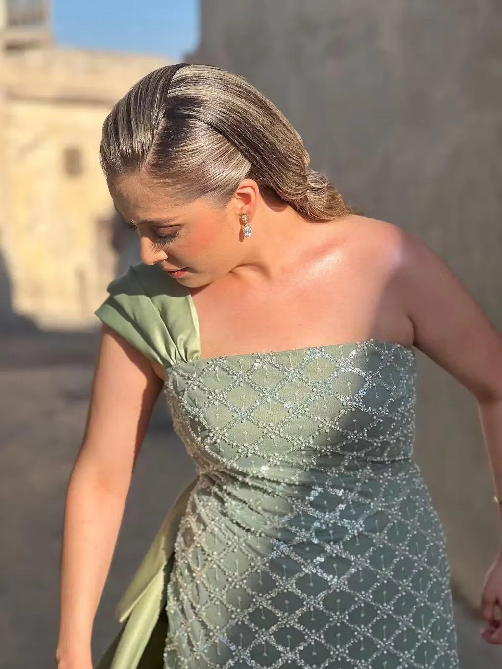 Stun in this elegant Sage Green One Shoulder Sheath Arabic Evening Dress SS626. Designed with a one shoulder neckline and sheath silhouette, it is adorned with intricate arabic beading and embroidery. Perfect for any evening event, this dress will make you stand out with its unique and sophisticated style.