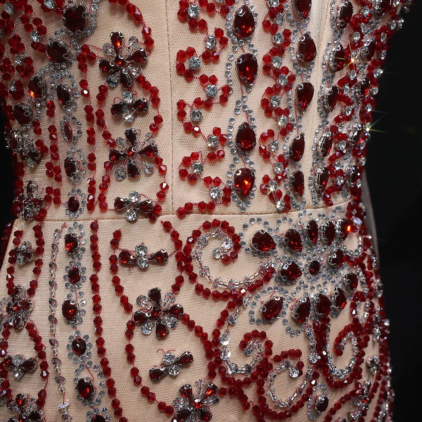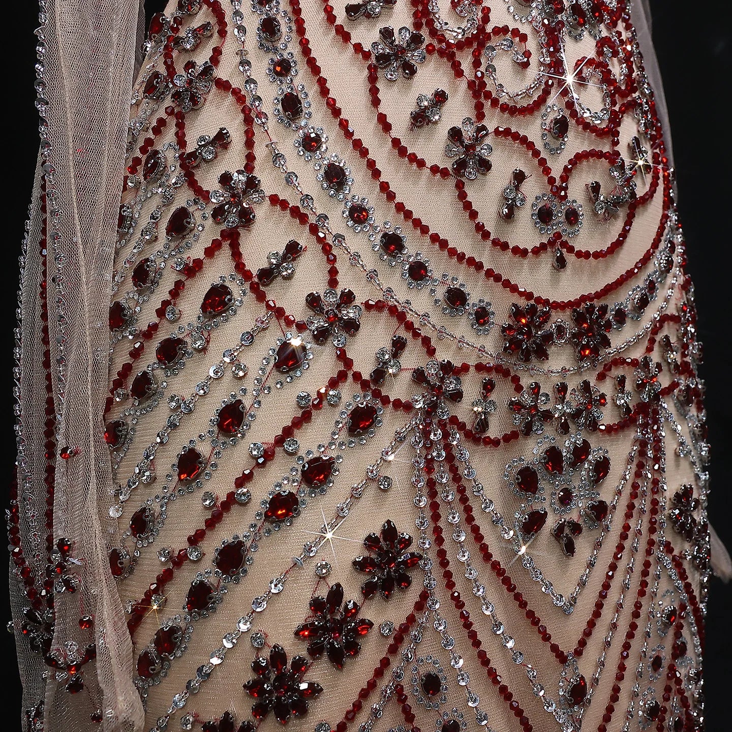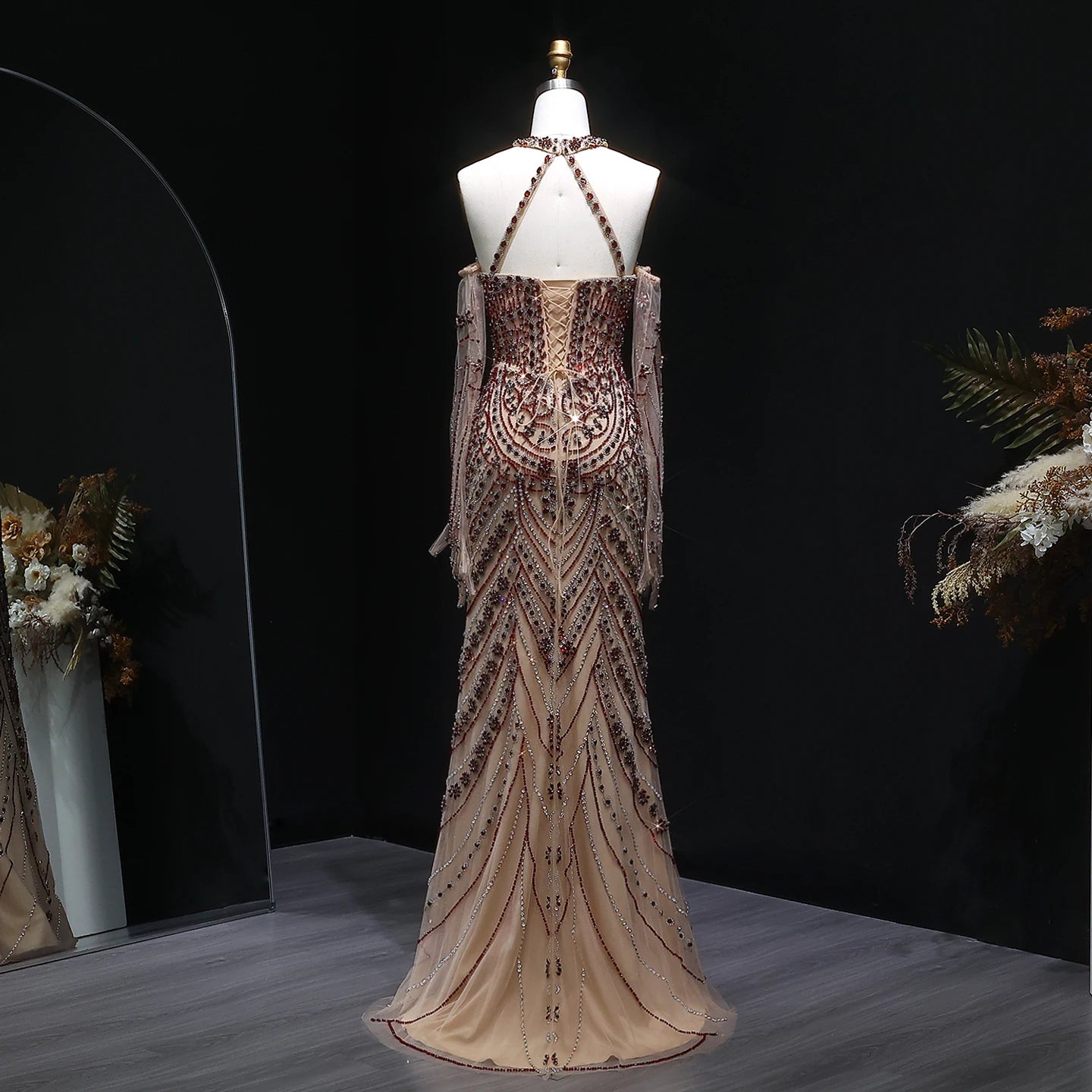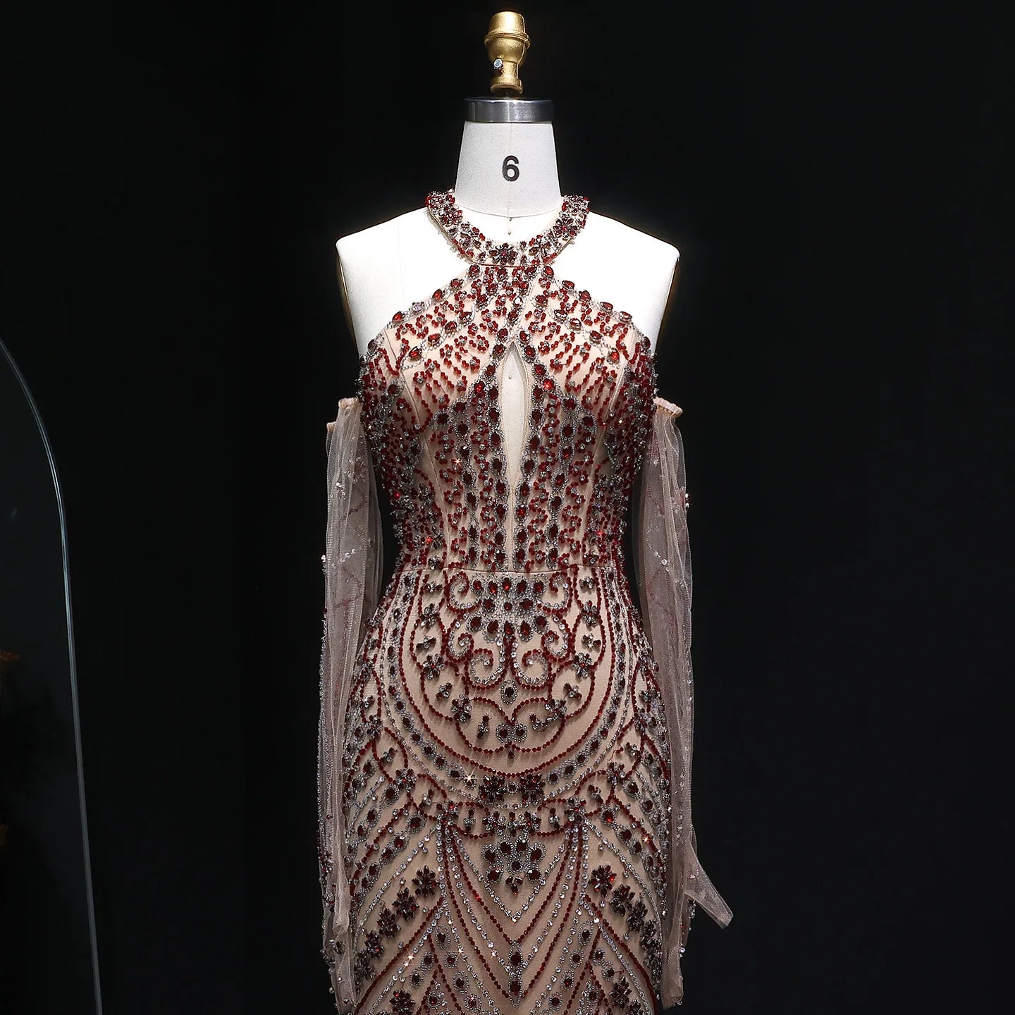The Elegant Beaded Halter Evening Gown SS118 features meticulous beadwork that enhances its sophisticated design. The halter neckline creates a flattering silhouette, while the matching gloves add a cohesive and polished finishing touch. This ensemble combines classic elegance with refined detail, perfect for upscale evening occasions.