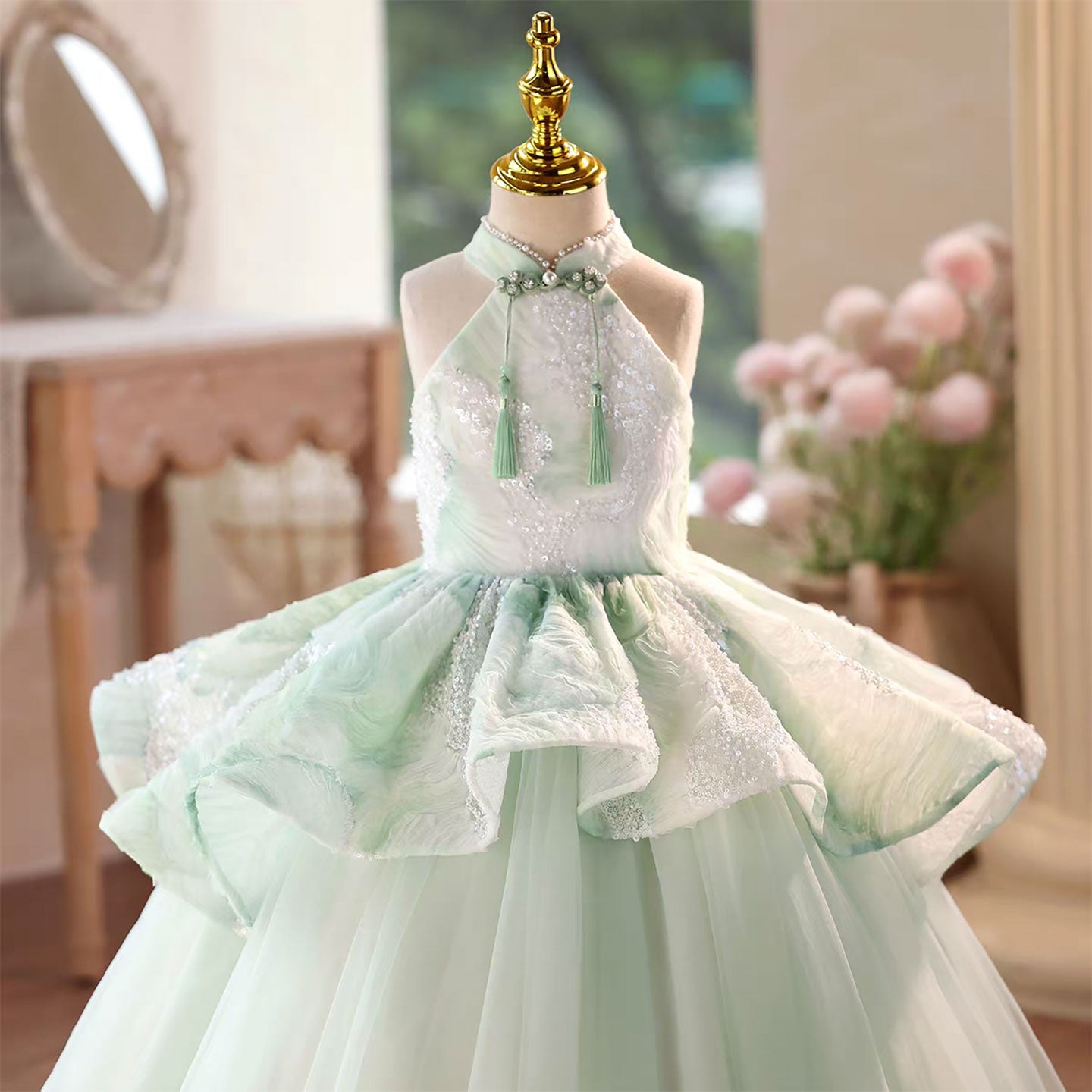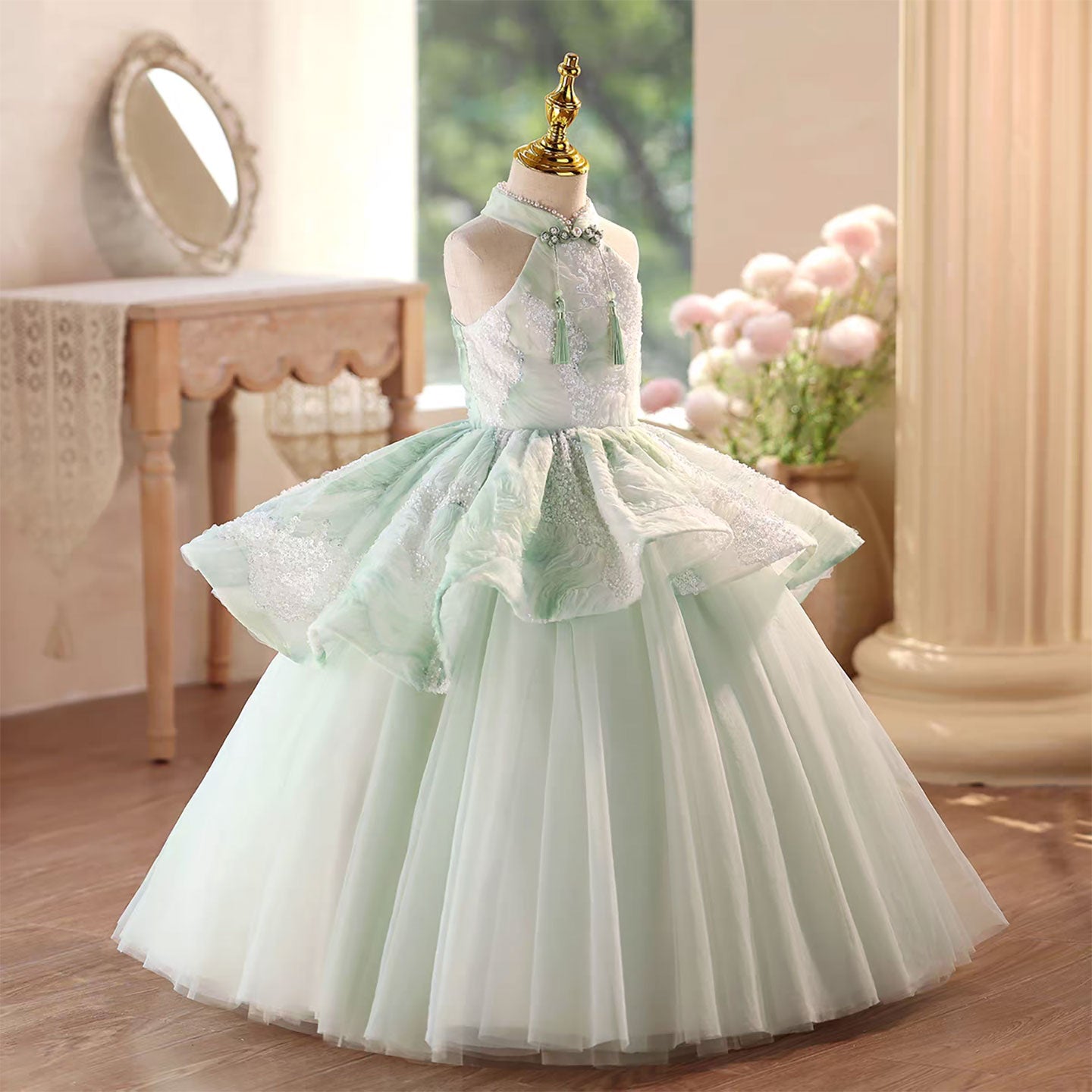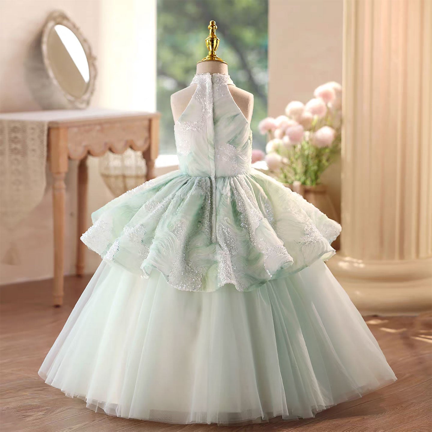 Green Flower Girl Dress with Delicate Beading Floor Length D102