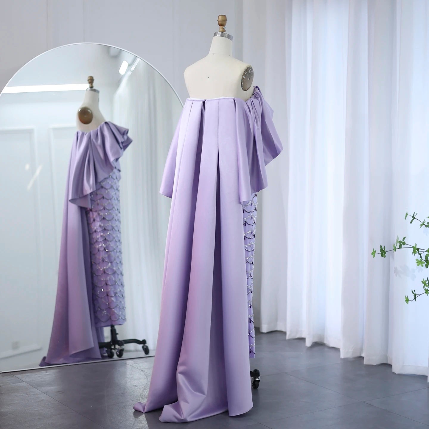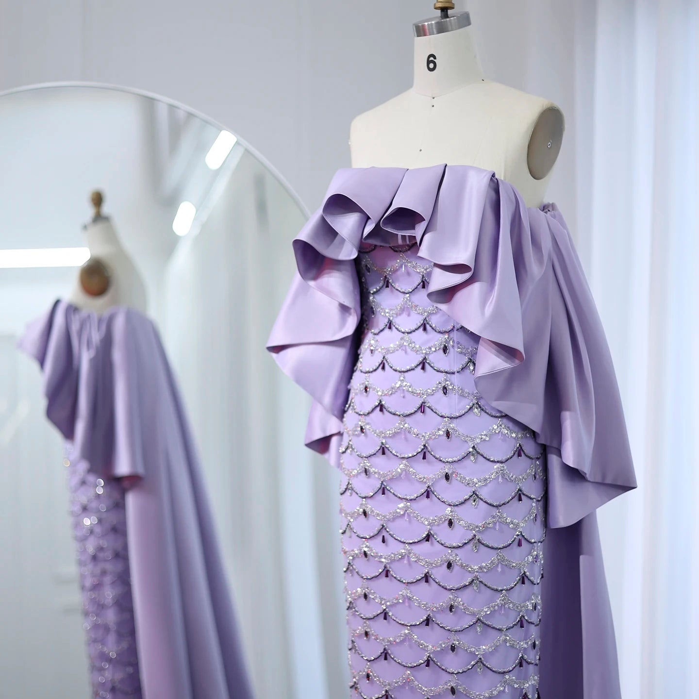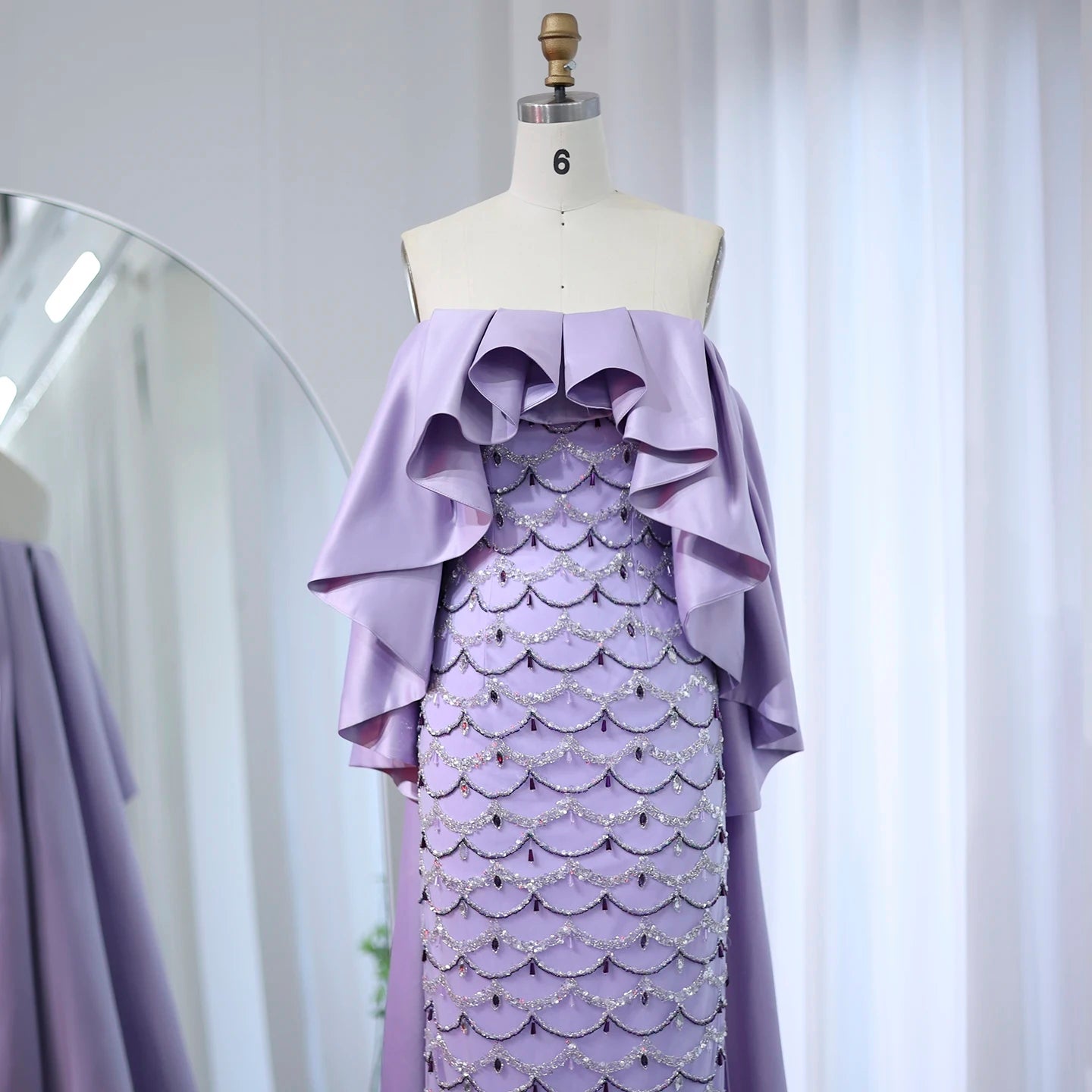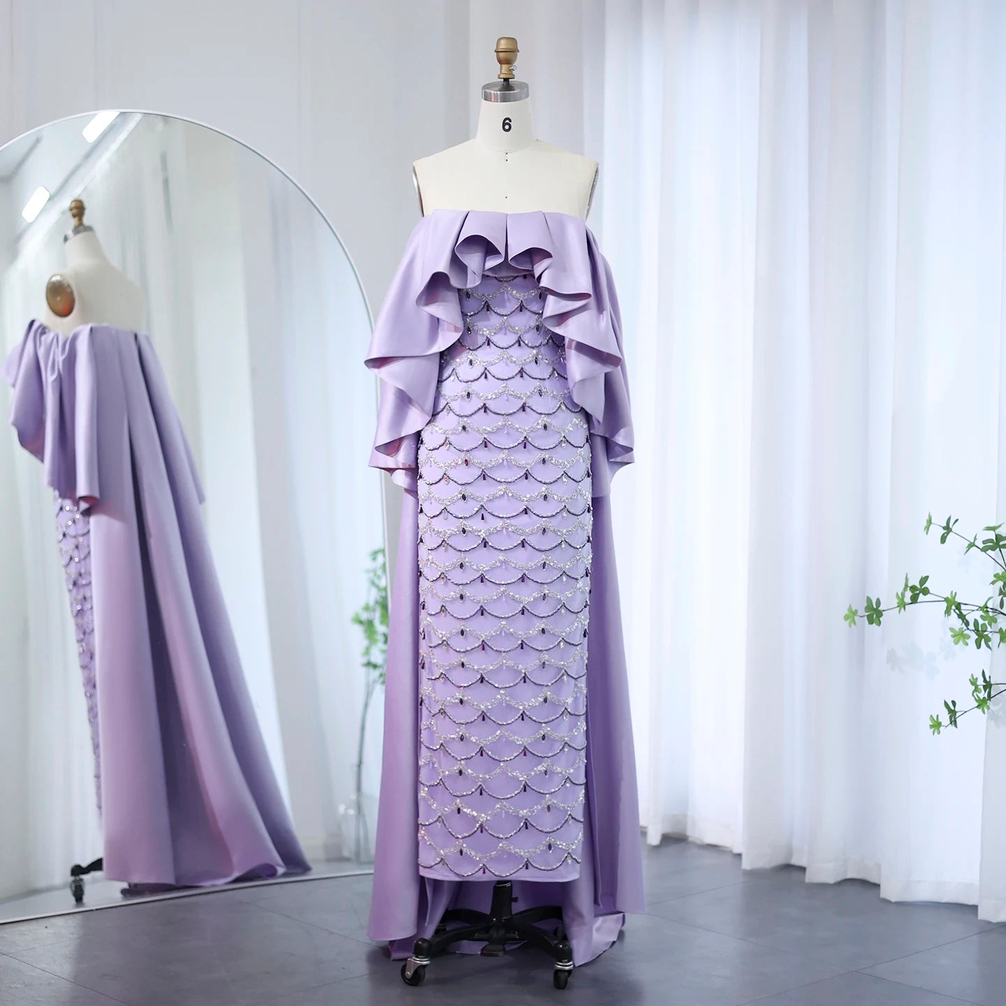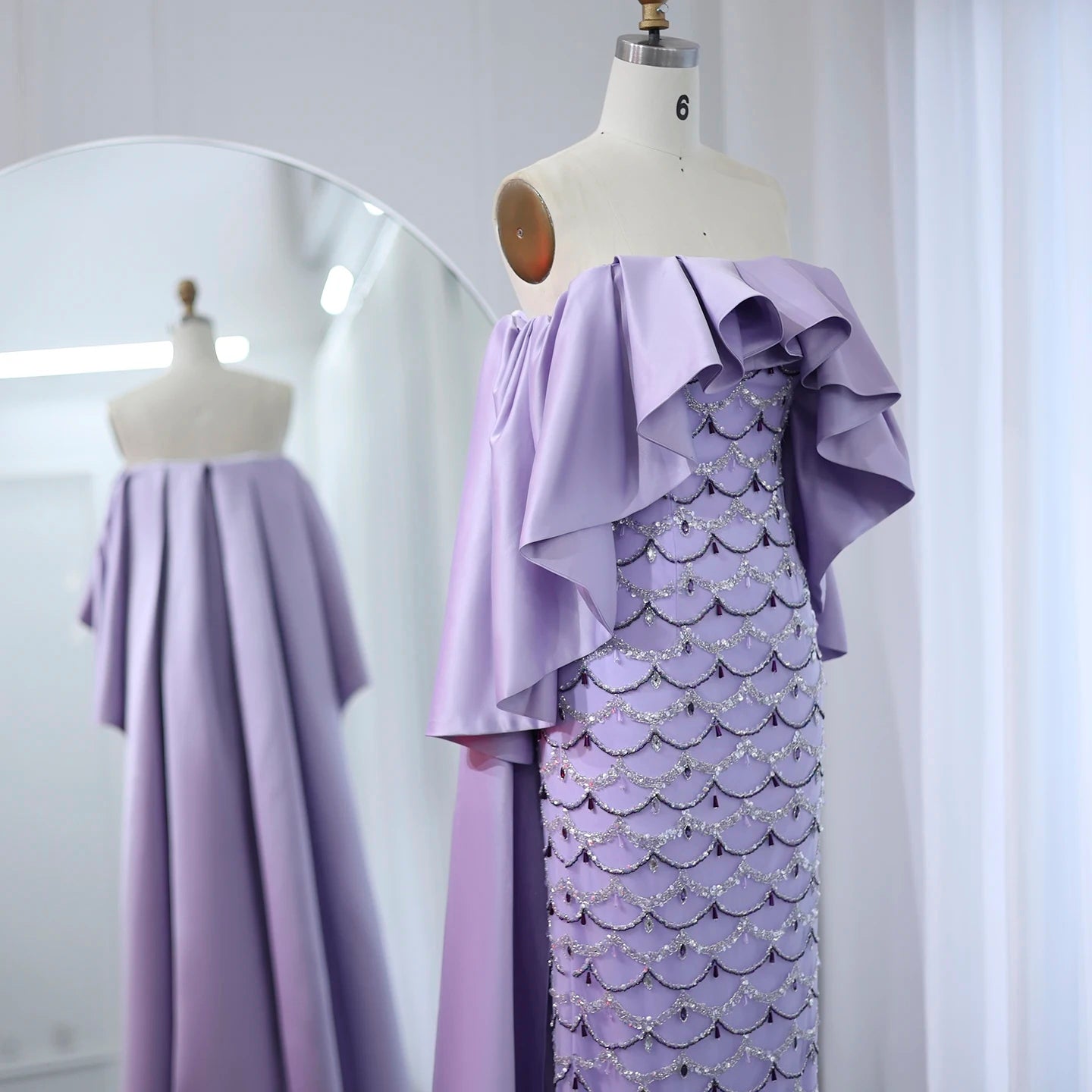 This elegant lavender evening gown features intricate beadwork that adds a refined shimmer to its graceful design. Complemented by a sheer cape, the dress offers a sophisticated and ethereal silhouette perfect for formal occasions. The delicate fabric and detailed embellishments create a harmonious blend of luxury and subtlety, ensuring you stand out with timeless elegance. Ideal for weddings, galas, or upscale events, this gown combines classic charm with modern sophistication.