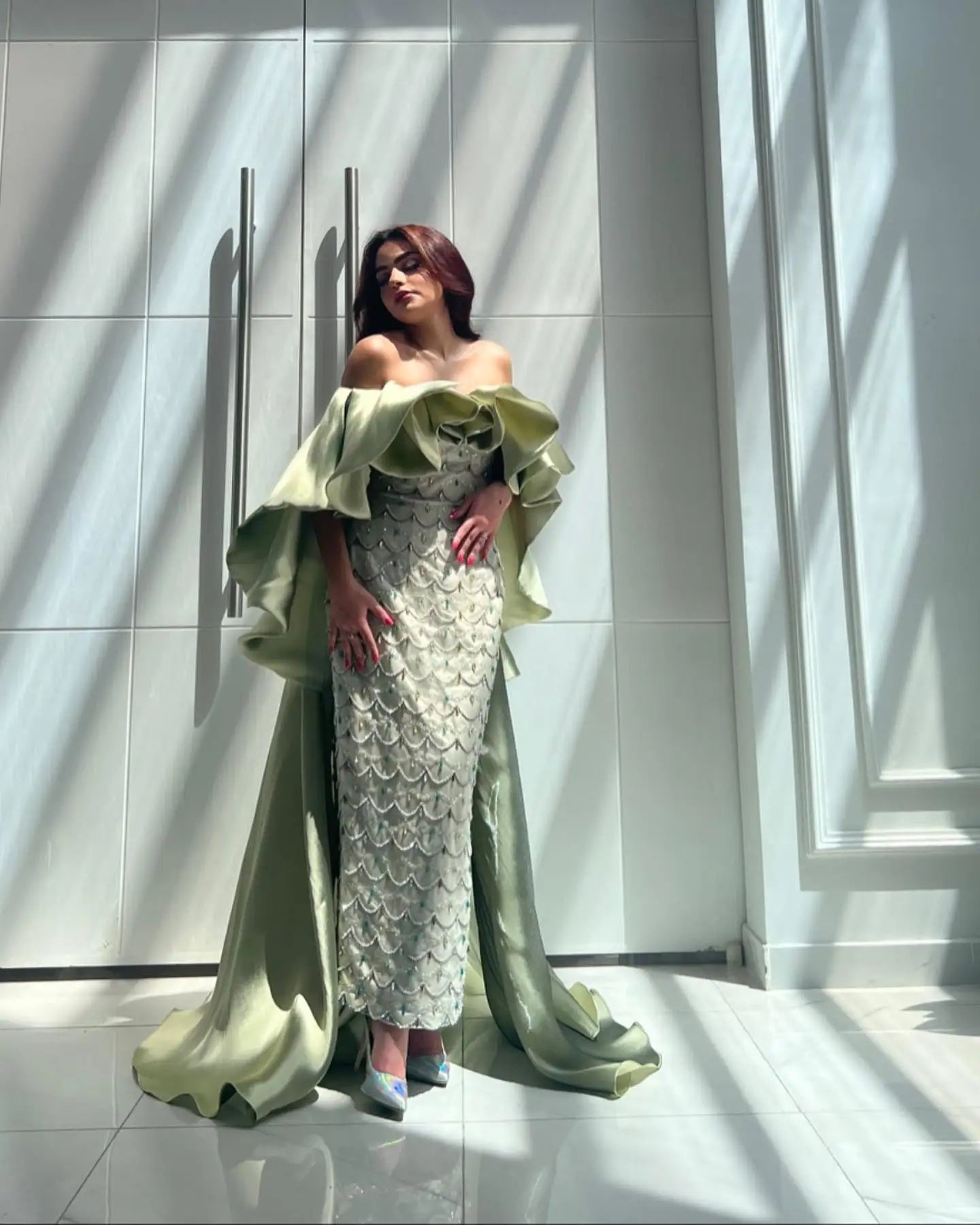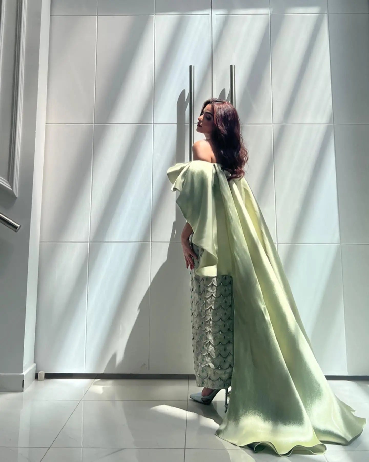 Luxury Sage Green Strapless Evening Dress with Cape SS383