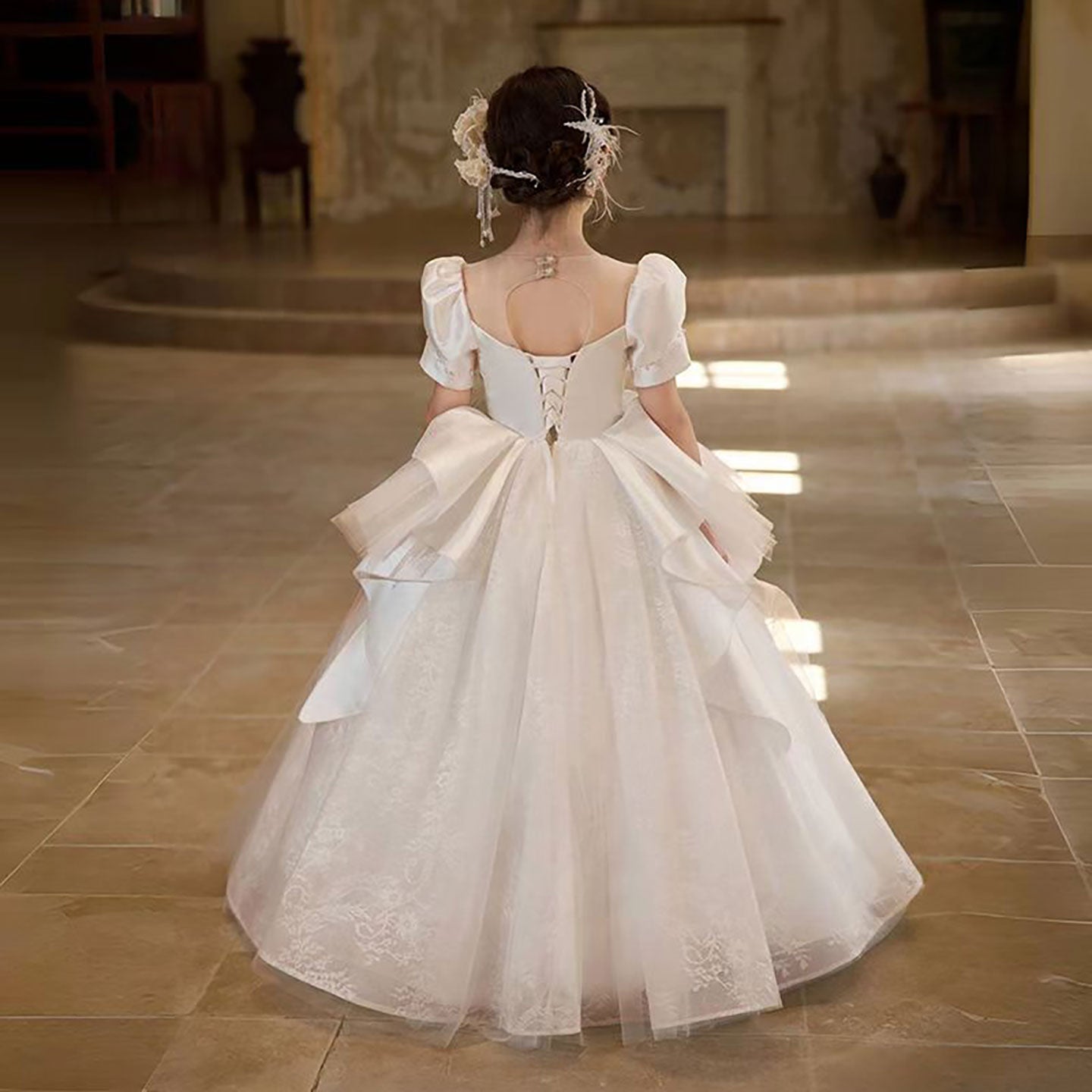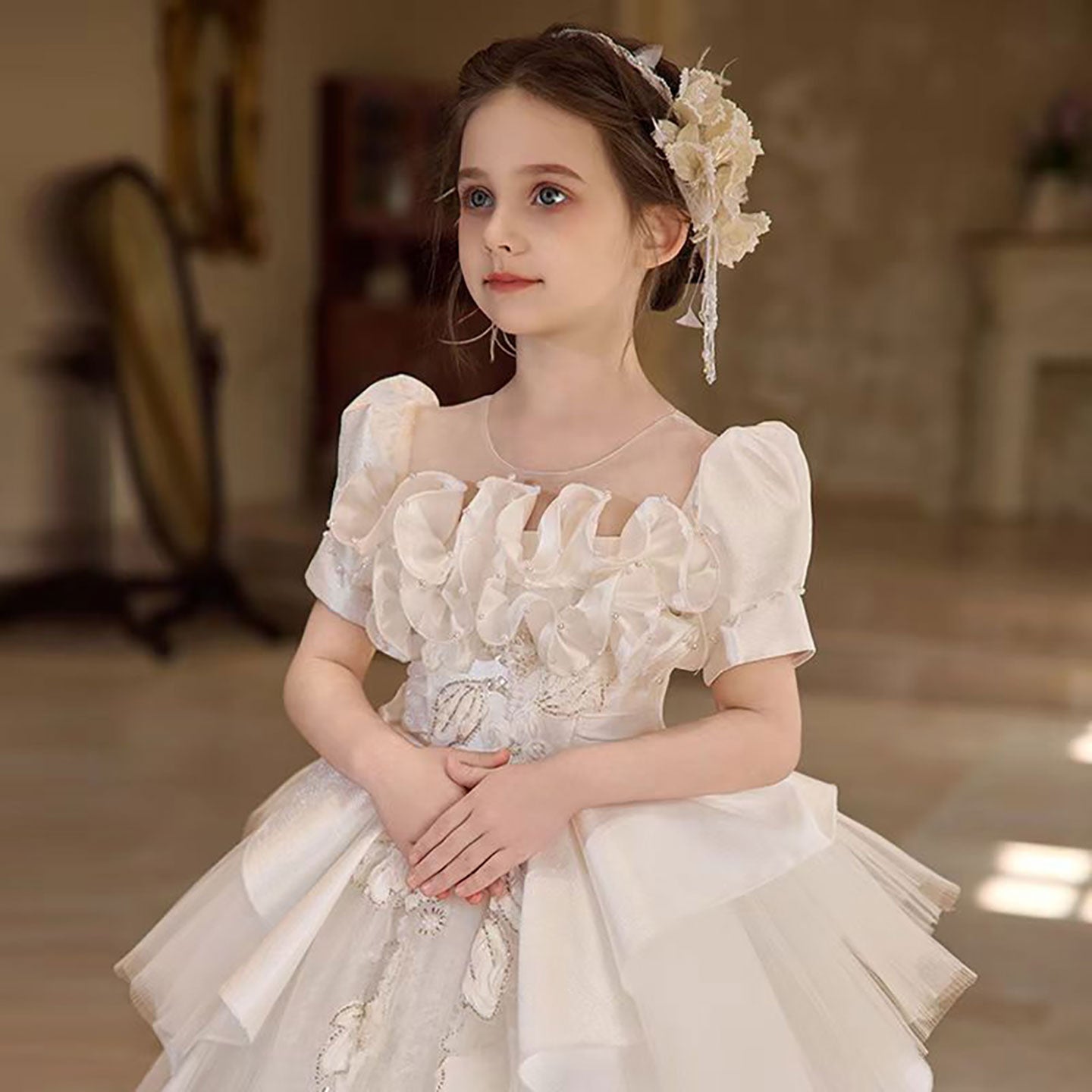 This exquisite white flower girl dress features delicate floral accents and shimmering silver beads, creating a refined princess look. Designed with meticulous craftsmanship, it offers a graceful silhouette that combines elegance and comfort. Perfect for weddings and formal events, this dress ensures your little one shines with timeless beauty and sophisticated detail.