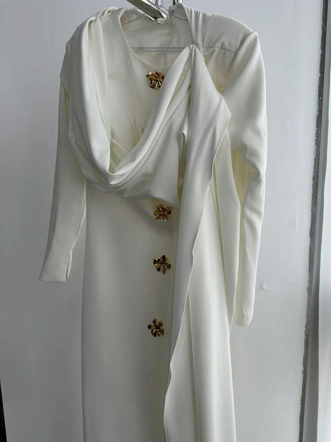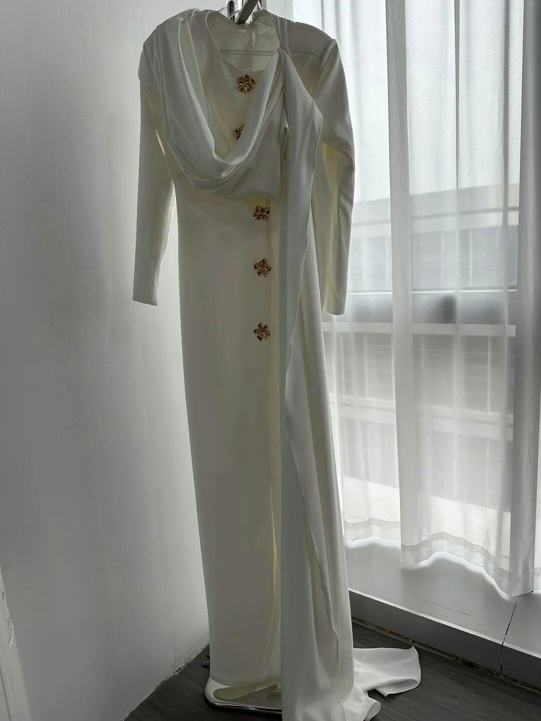 Crafted from luxurious off white satin, this Arabic evening dress exudes elegance and sophistication. The accompanying cape adds a touch of drama and versatility. Perfect for a formal event or special occasion, this dress is sure to make a statement.