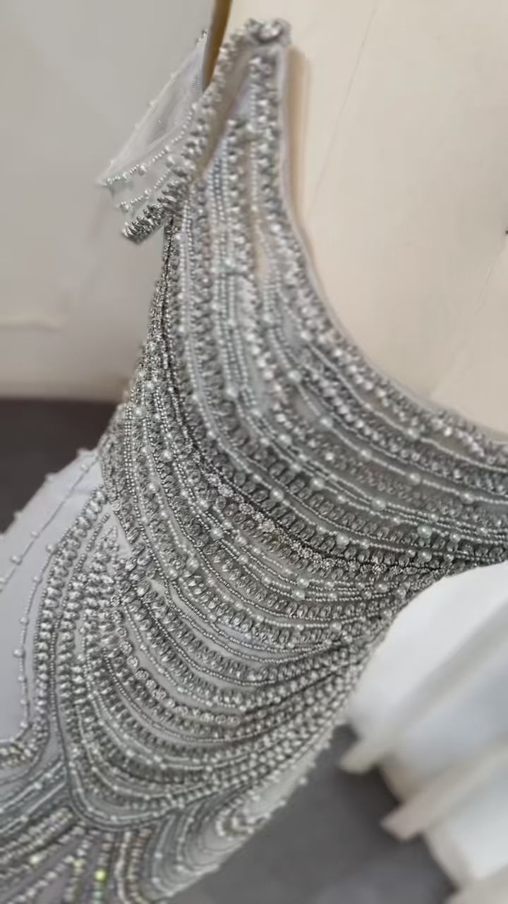 Elevate your evening attire with luxurious Crystal Silver Gray Mermaid Dubai Evening Dresses. This stunning gown features a figure-flattering mermaid silhouette and intricate crystal embellishments, perfect for weddings, proms, and other special occasions. Make a statement with Dreamy Vow.