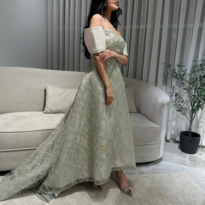 Elevate your elegance with Dreamy Vow's sage green evening dress. The A-line silhouette flatters any figure while the beaded midi length adds the perfect touch of glam. Designed for formal events, weddings, and parties, this dress exudes sophistication and grace. Made in Saudi Arabia with the finest materials.