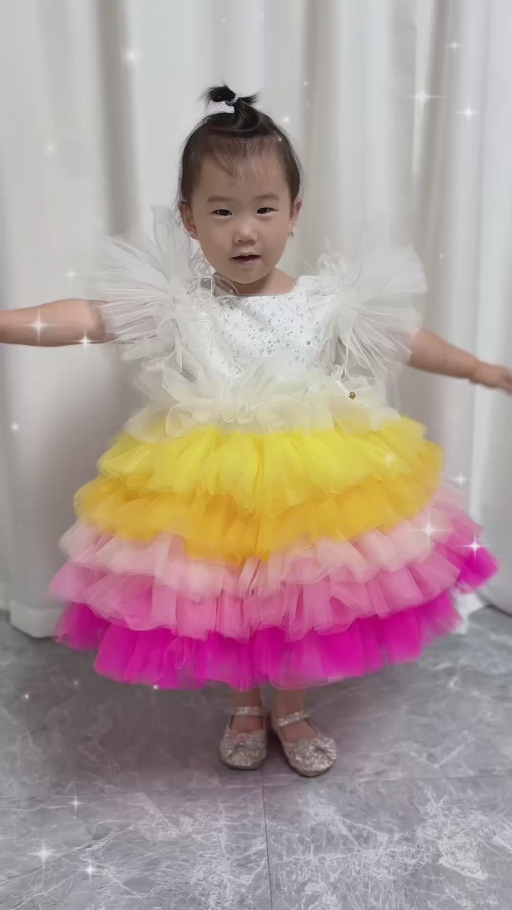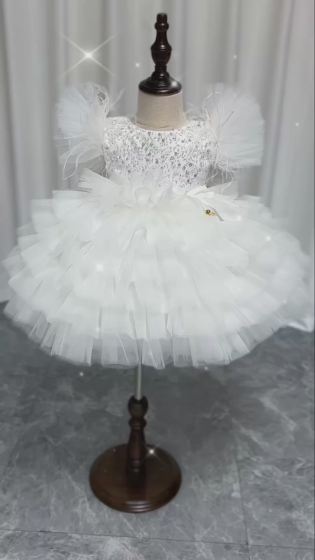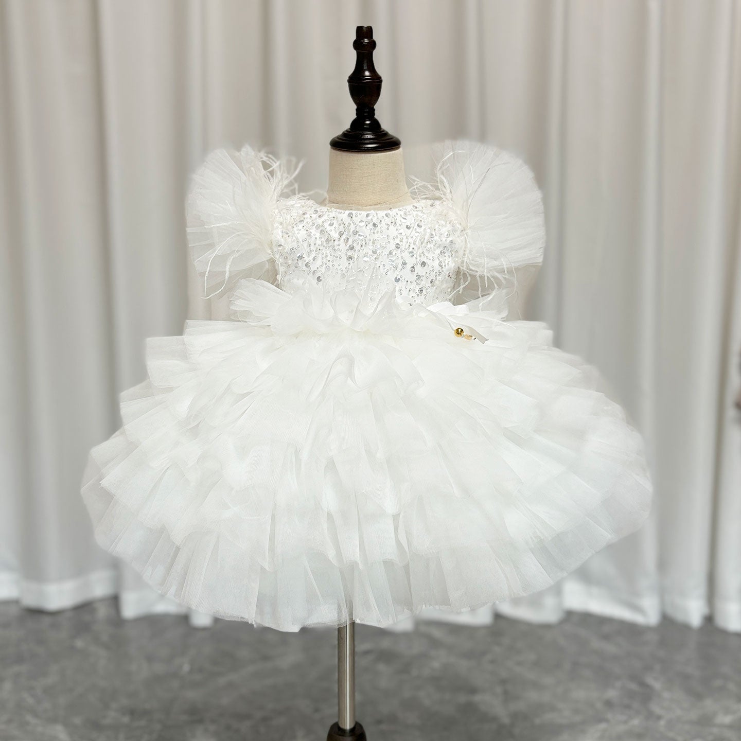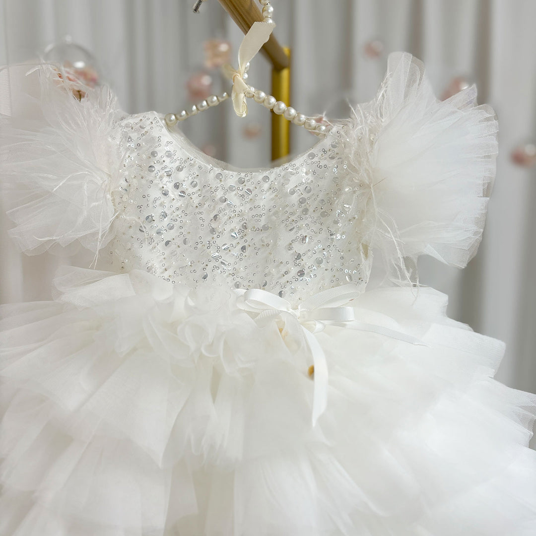 This knee-length baby birthday dress features stunning floral sequin detailing, perfect for making a lasting impression. The delicate and intricate design is sure to make your little one feel like a princess on her special day. Add a touch of elegance and charm to any occasion with DreamyVow J275.