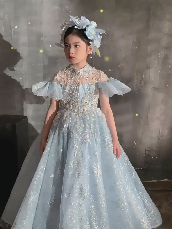 Introducing the Luxury Blue Beaded Birthday Girl Dress Puffy Sleeve J319. This elegant dress combines luxury and style for your little girl's special day. With intricate beading and puffy sleeves, she will feel like a princess. Make her birthday unforgettable with this beautiful dress.