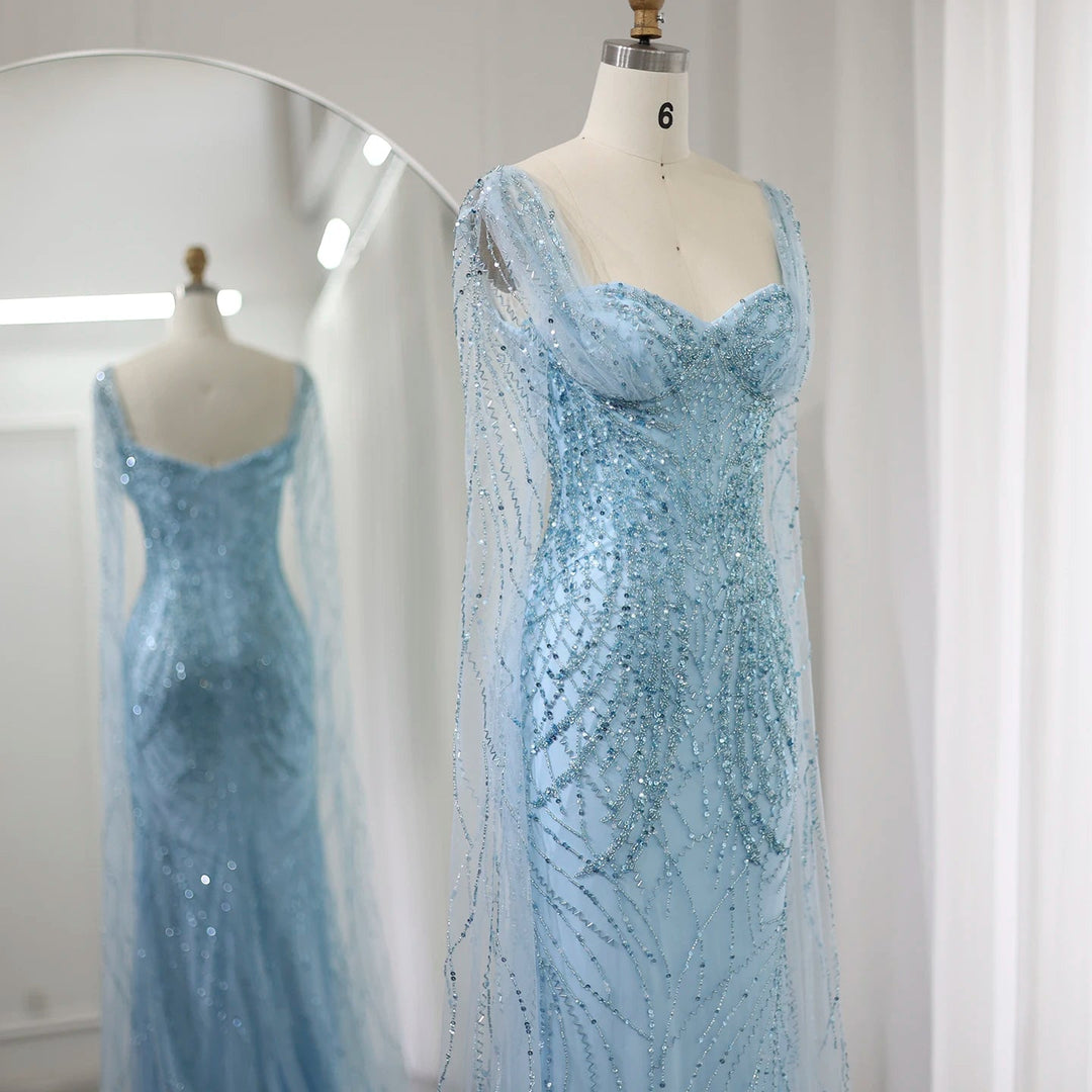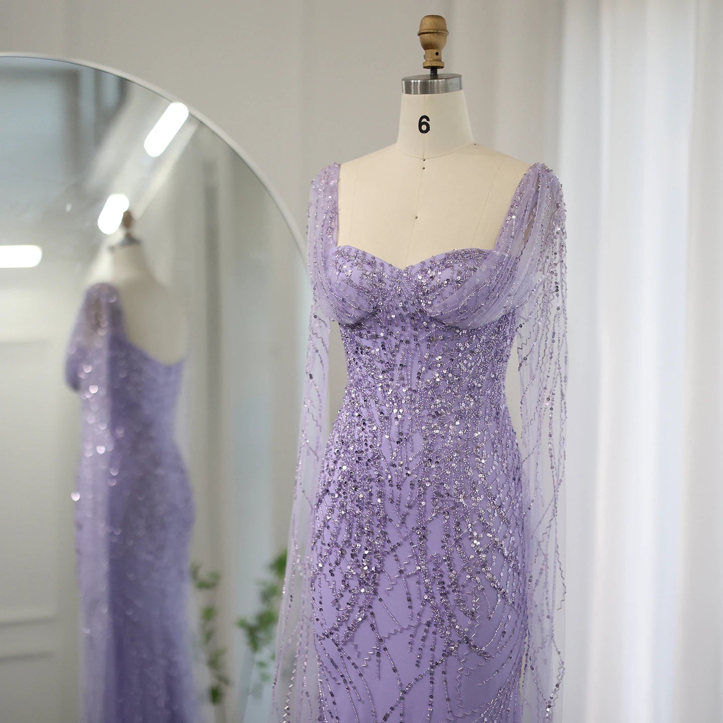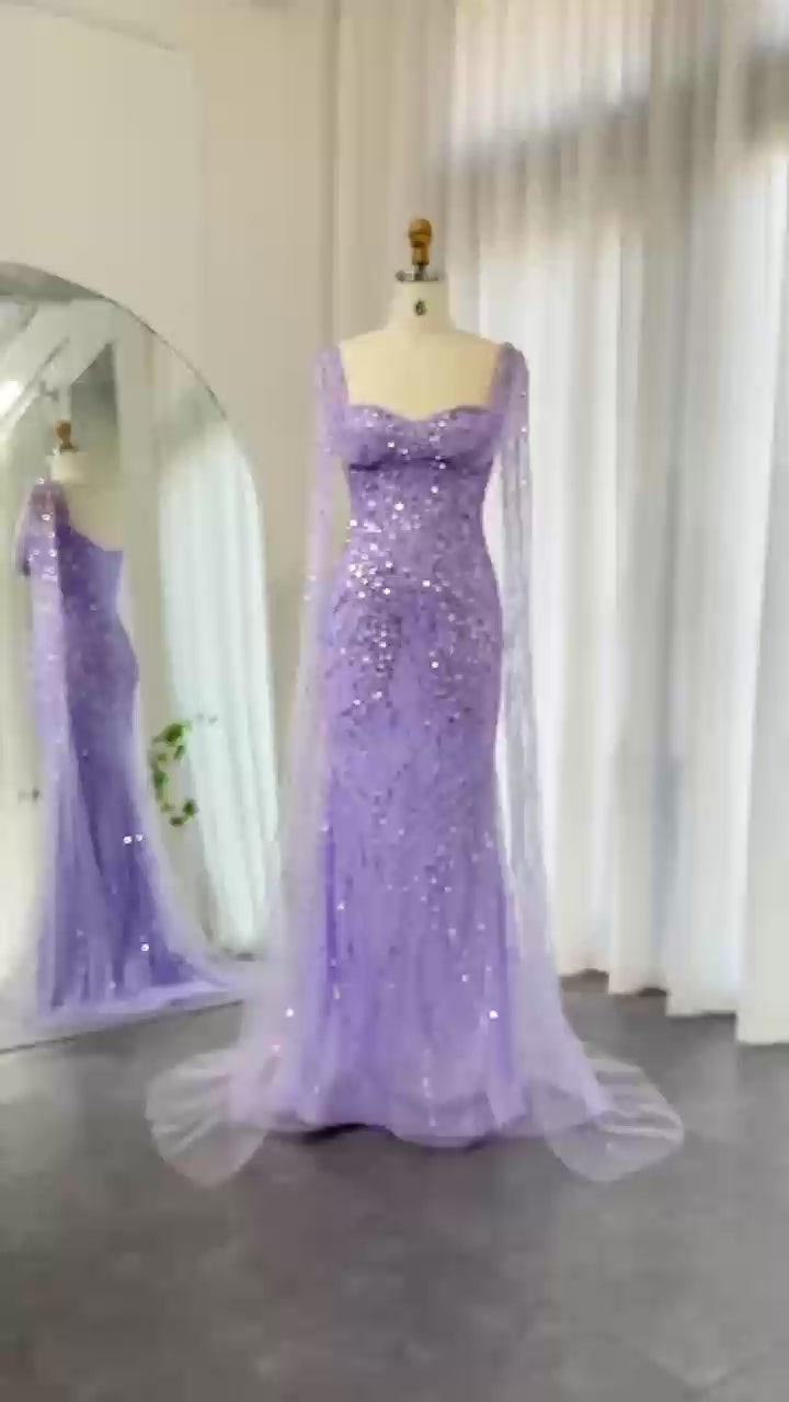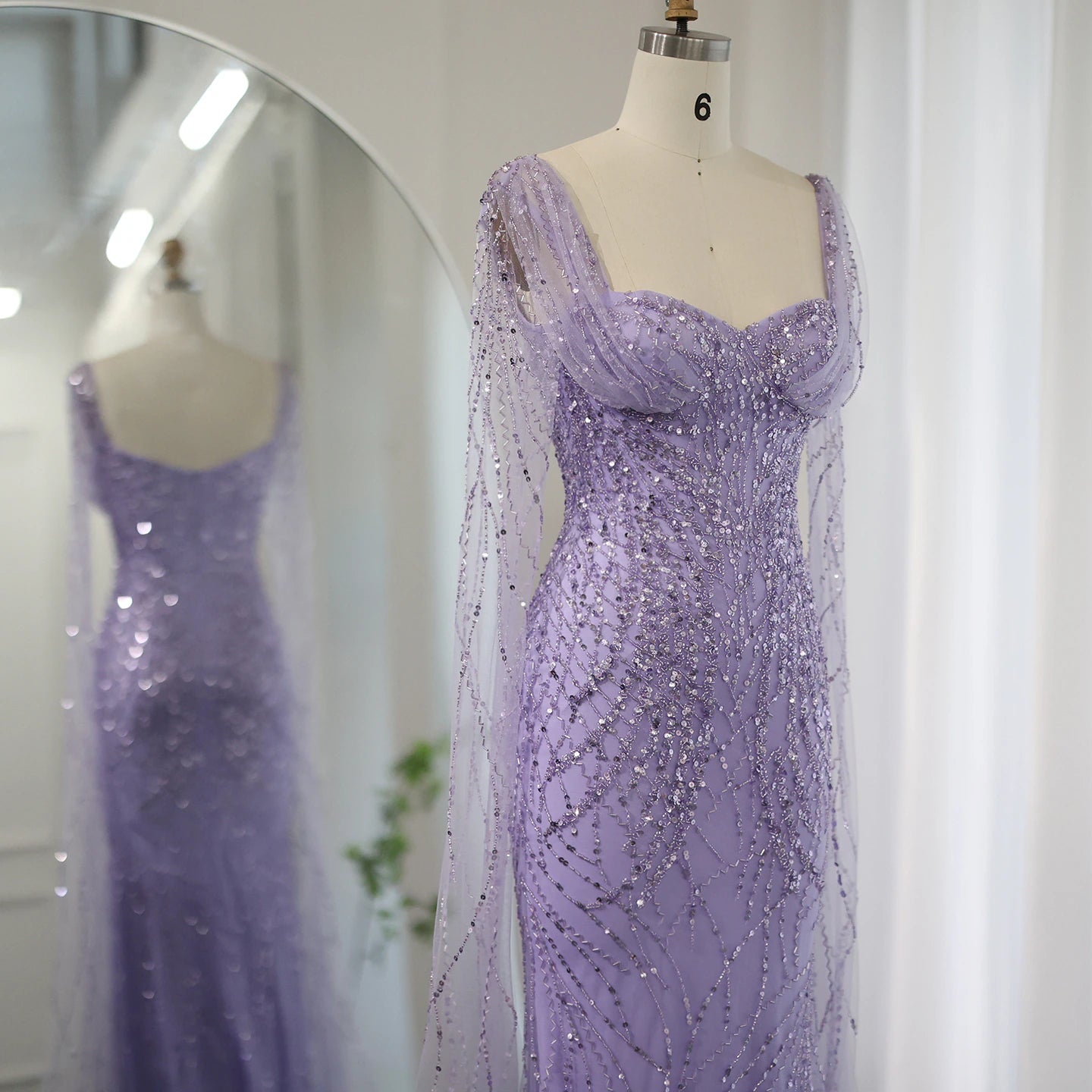 Indulge in luxurious elegance with the Dreamy Vow Lilac Mermaid dress. Featuring exquisite cape sleeves and elegant mermaid silhouette, this dress will make you feel like royalty. Perfect for formal events, weddings, and parties. Handcrafted with precision and attention to detail, this dress is truly a showstopper.