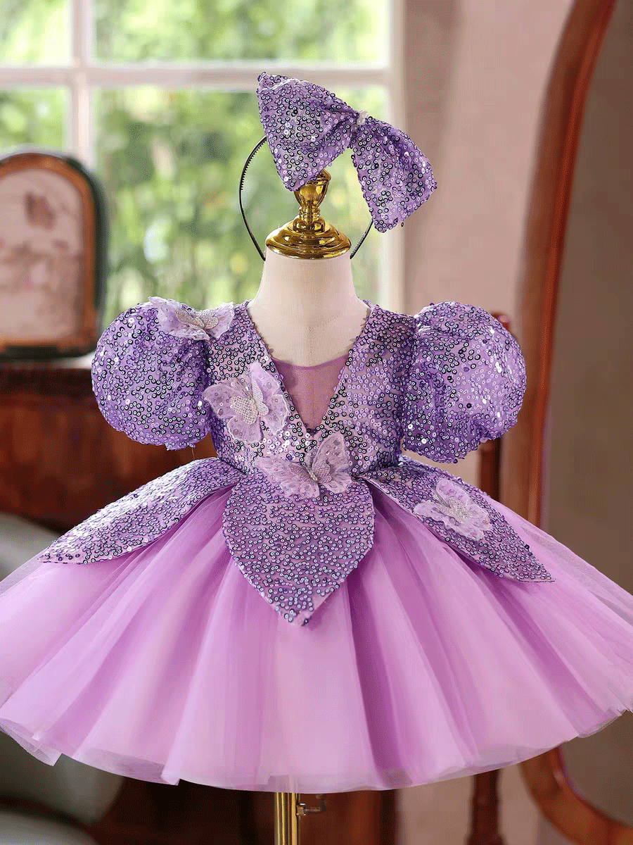 Luxury Purple Sequin Flower Girl Dress with Puff Sleeves Butterfly Details J881