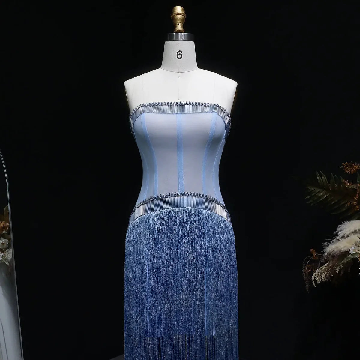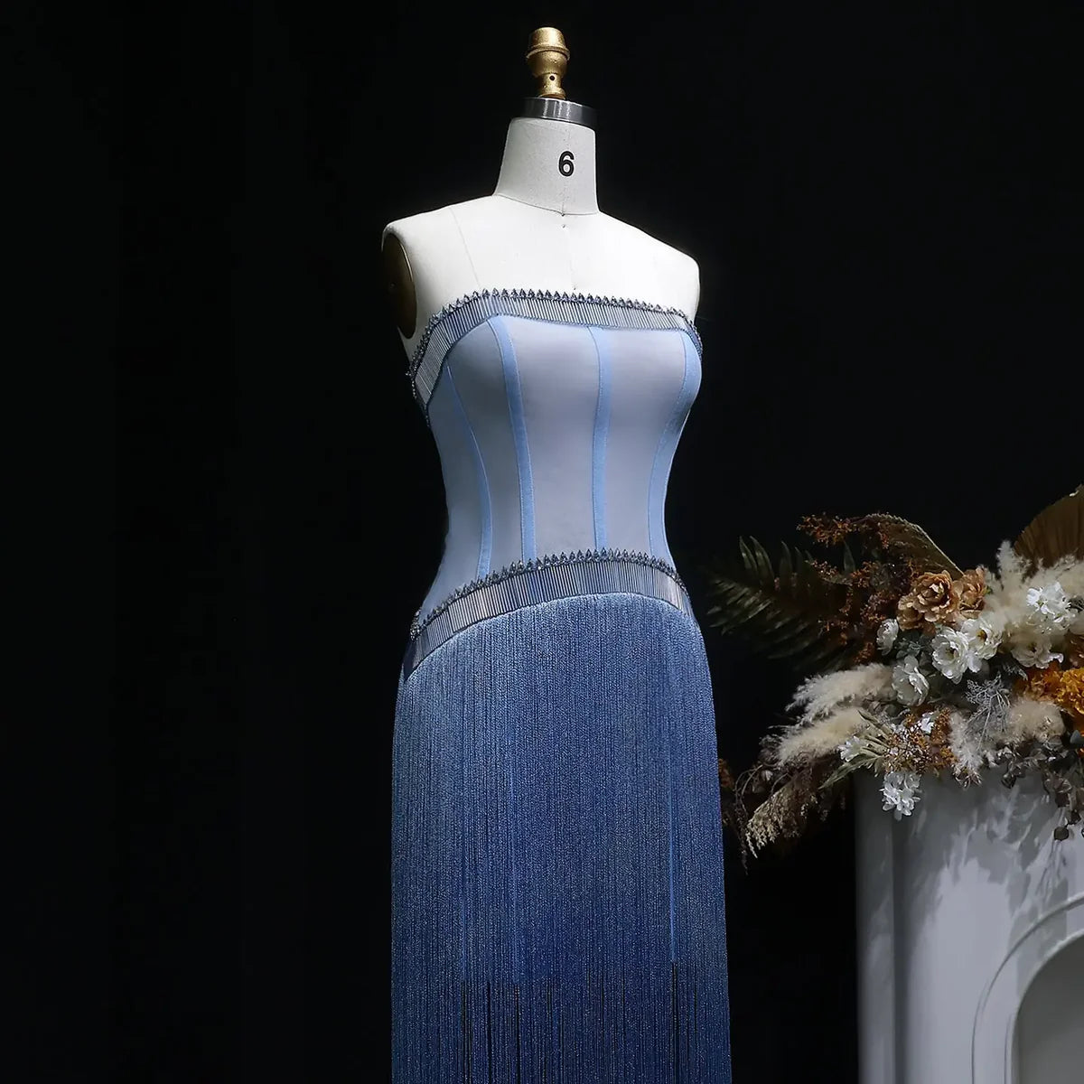 # Luxury Blue Strapless Crystal Fringe Evening Dress SS520 Elevate your evening with this stunning strapless gown, where sophisticated elegance meets contemporary glamour. The rich blue hue provides a timeless foundation, while cascading crystal fringe details create movement and luminosity with every step. The structured strapless neckline offers refined support and an elongated silhouette, making this piece ideal for galas, formal celebrations, and red-carpet moments. Meticulously crafted with premium materials, this dress combines architectural design with luxurious embellishment—a statement piece for the discerning bride or guest who demands both presence and poise.