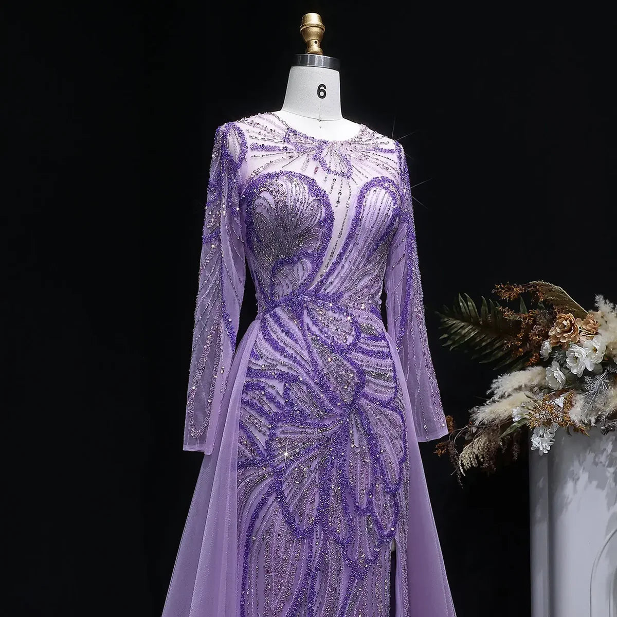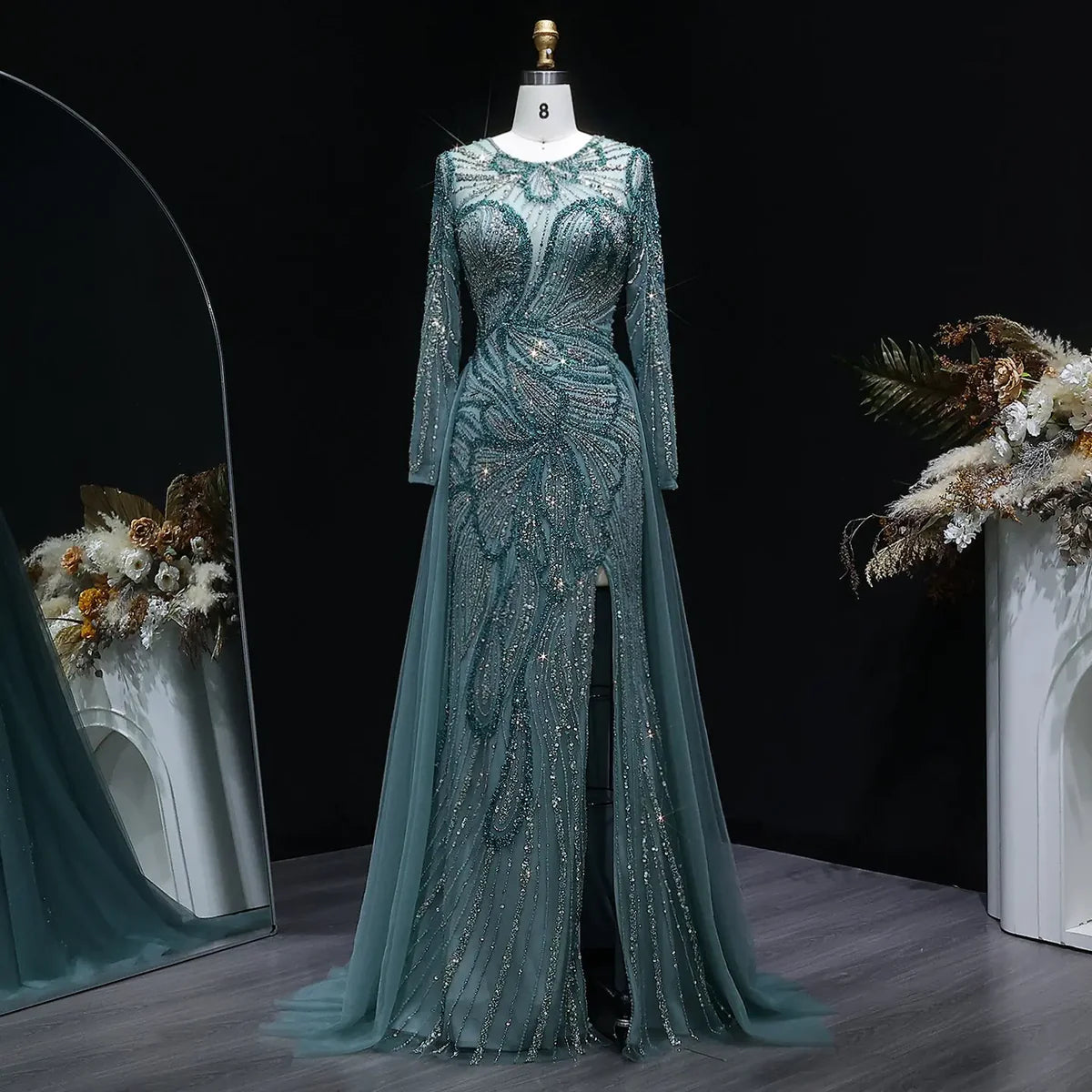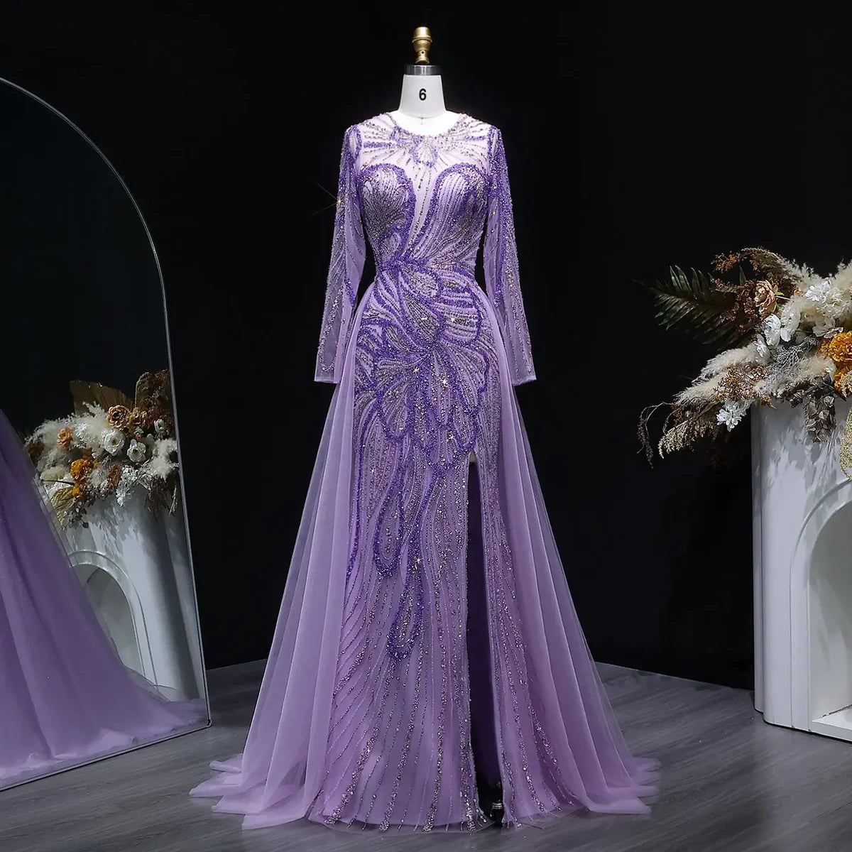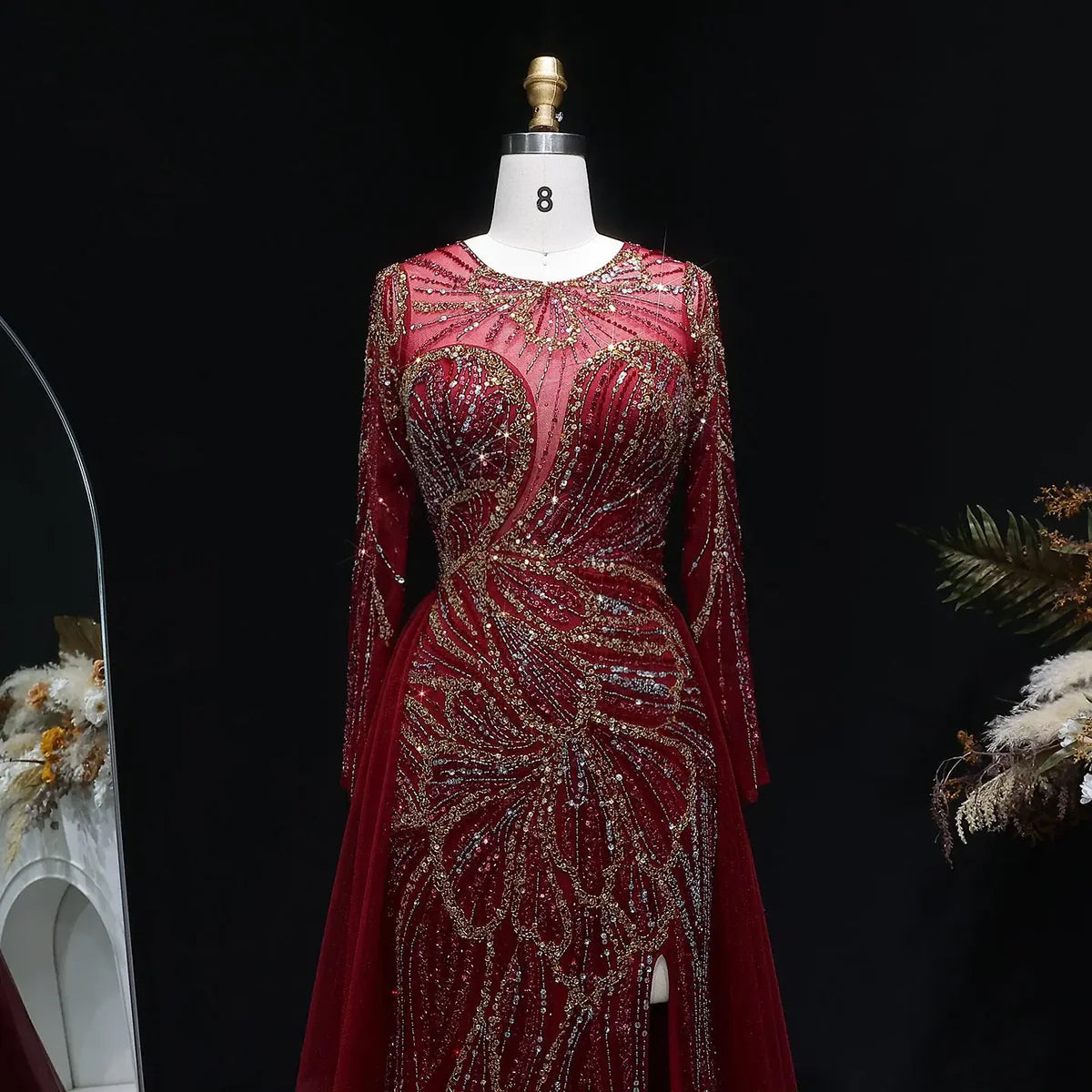 Luxury Wine Red Crystal Embellished Slit Evening Dress with Overskirt SS160