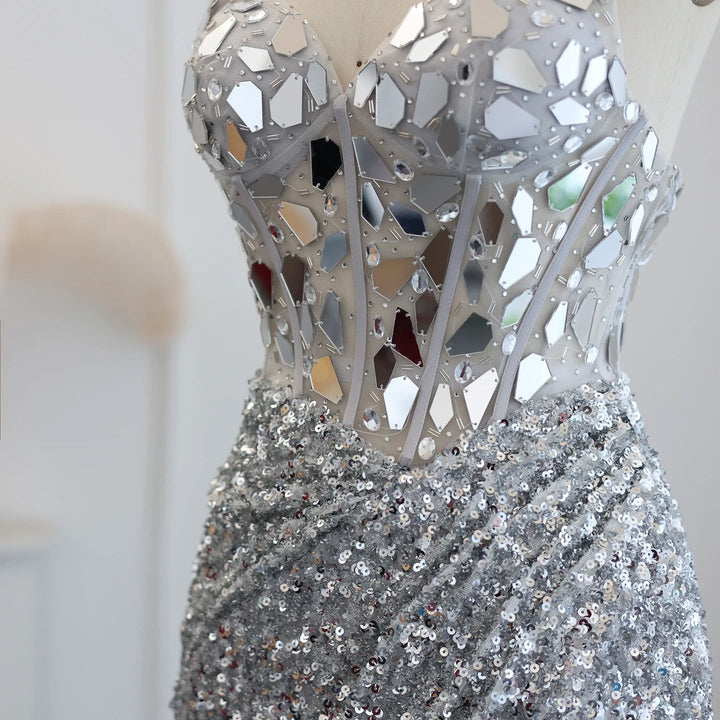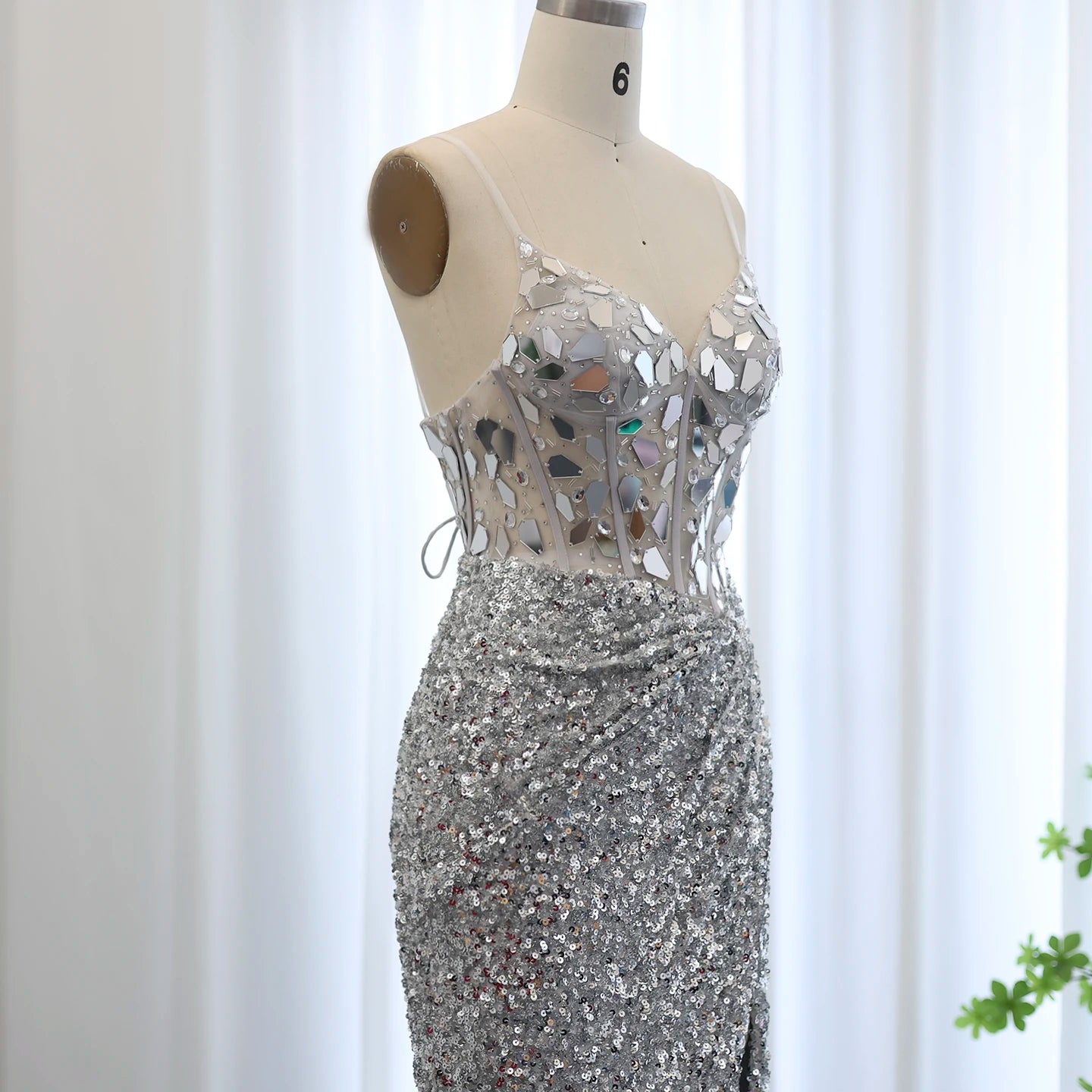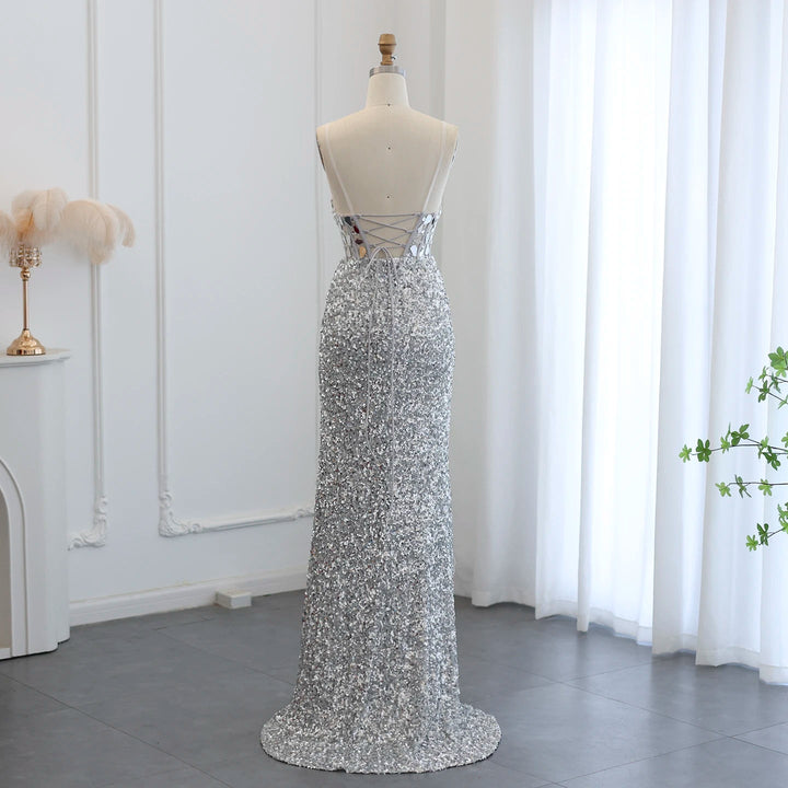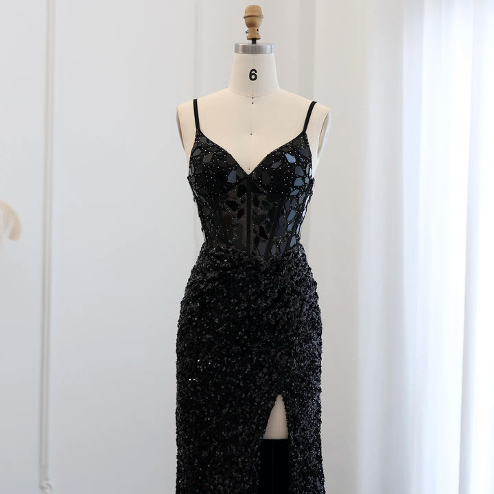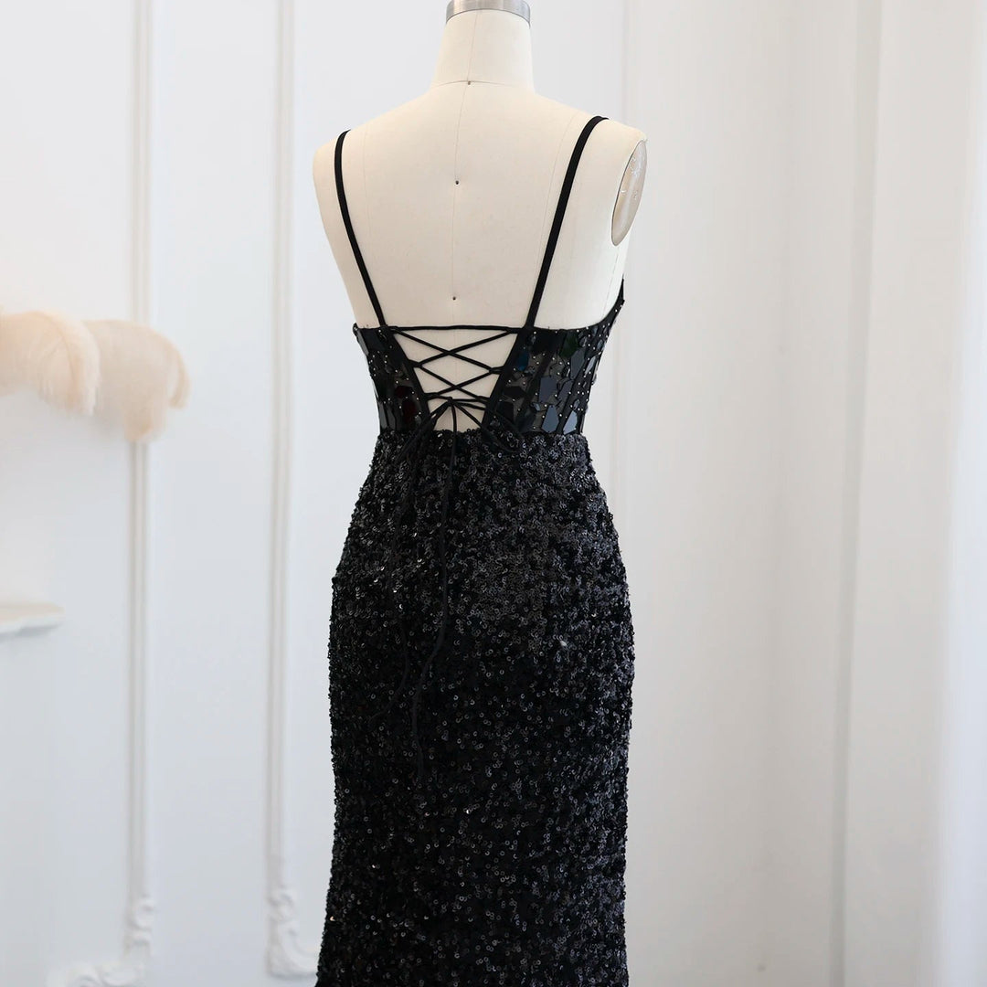 The Dreamy Vow evening gown features seductive spaghetti straps and sparkling sequins, creating a mermaid silhouette that elegantly hugs the body. The wine red color brings a touch of romance, while the black and silver accents add a sophisticated touch. Perfect for prom or any formal event.