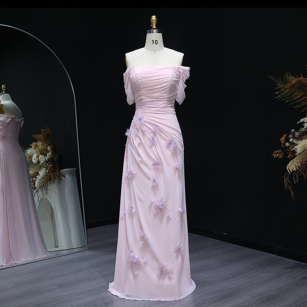 Elegant Pink Sequin 3D Floral Off Shoulder Evening Dress SS604