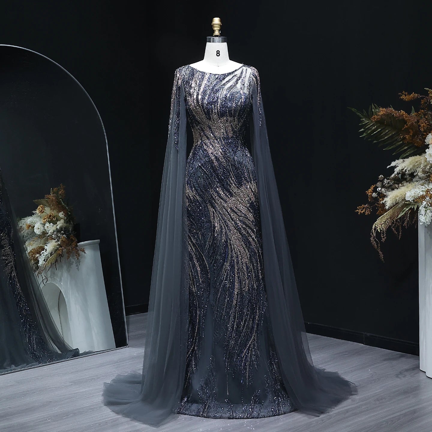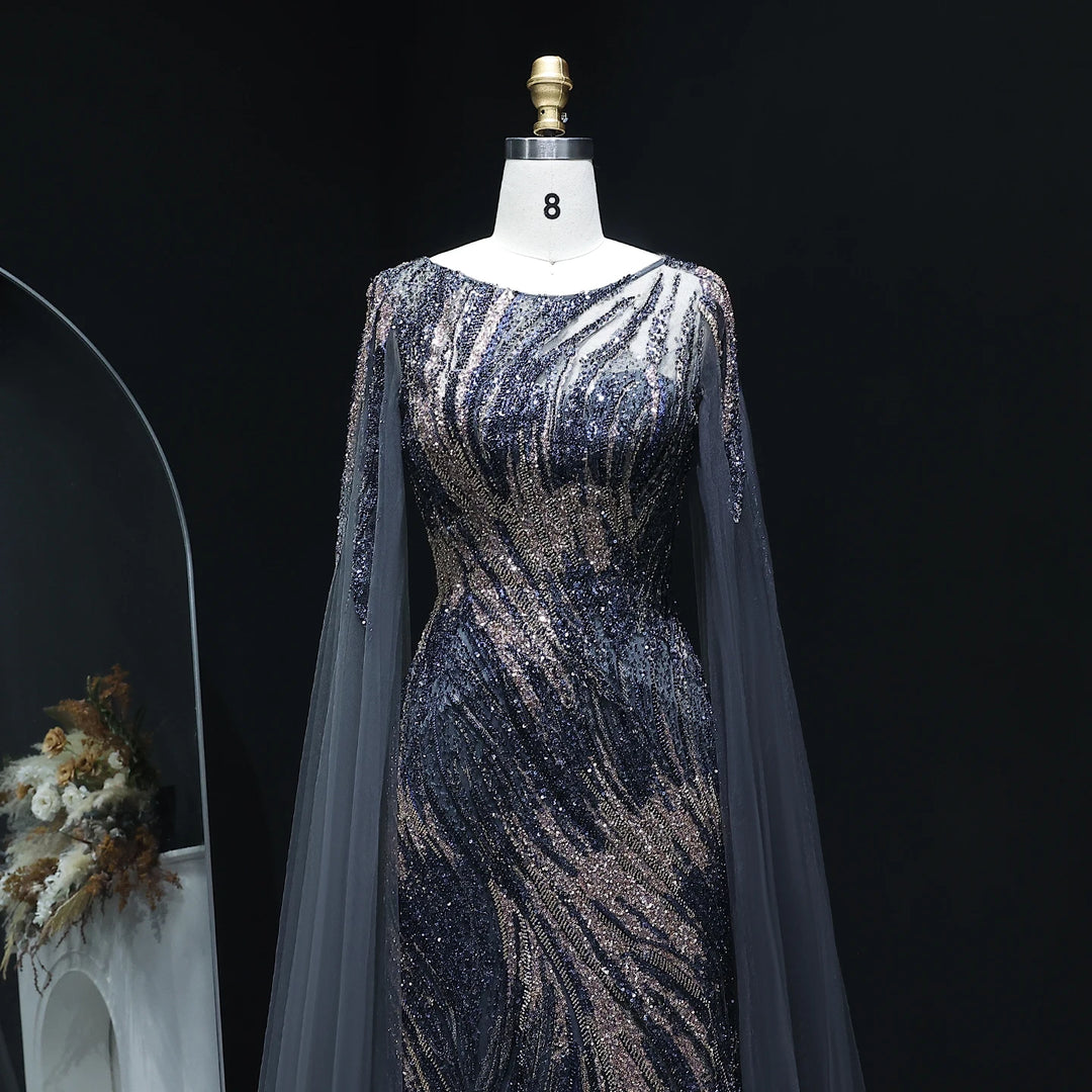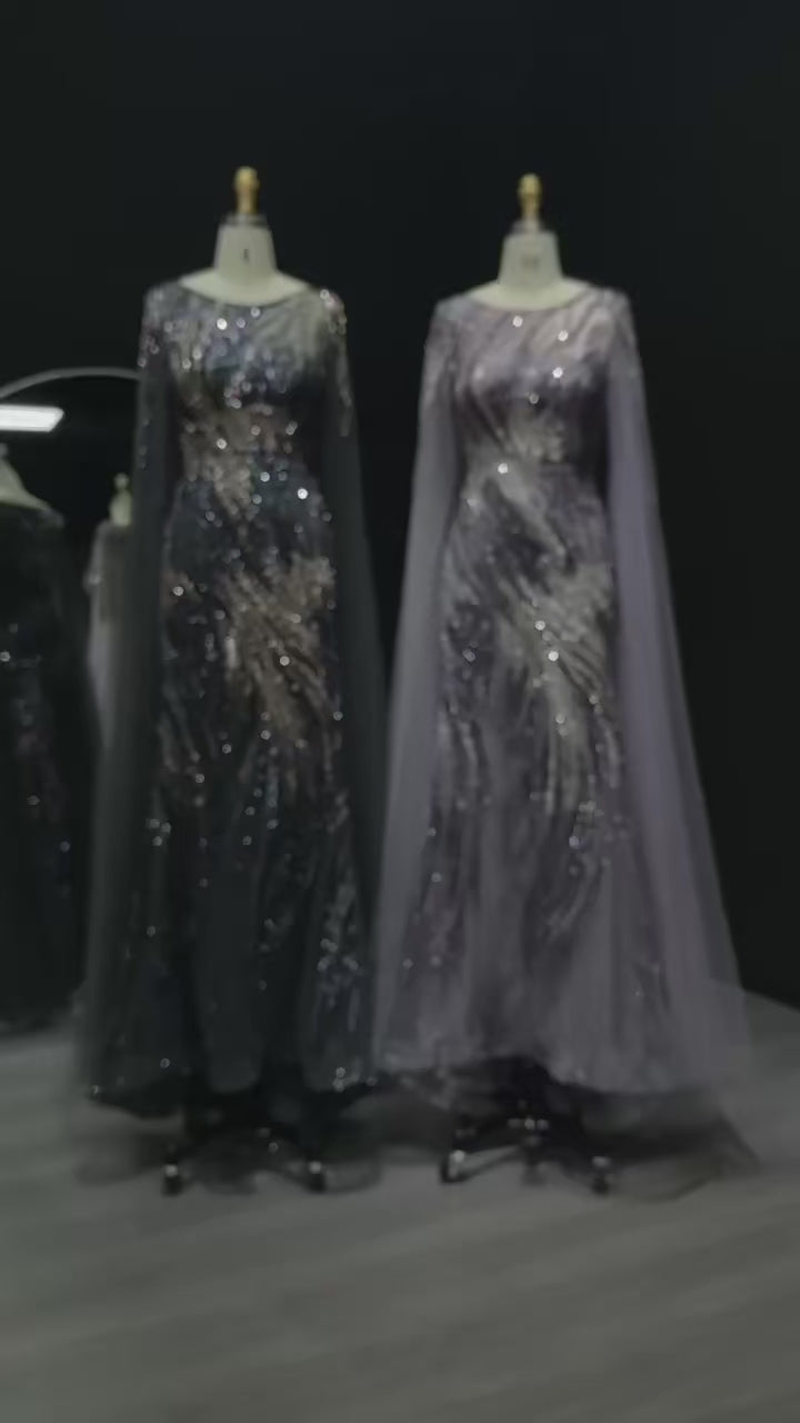 Indulge in luxury with our Dubai Women Elegant Purple Arabic Evening Dress. The rich color and intricate design make a statement at any event. The cape sleeves add a touch of elegance, perfect for a sophisticated look. Wearing this dress, you'll be the epitome of grace and style.