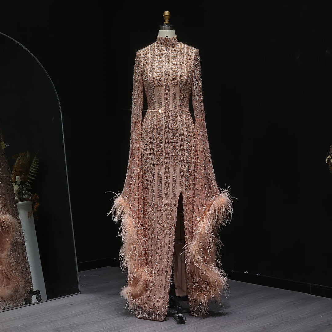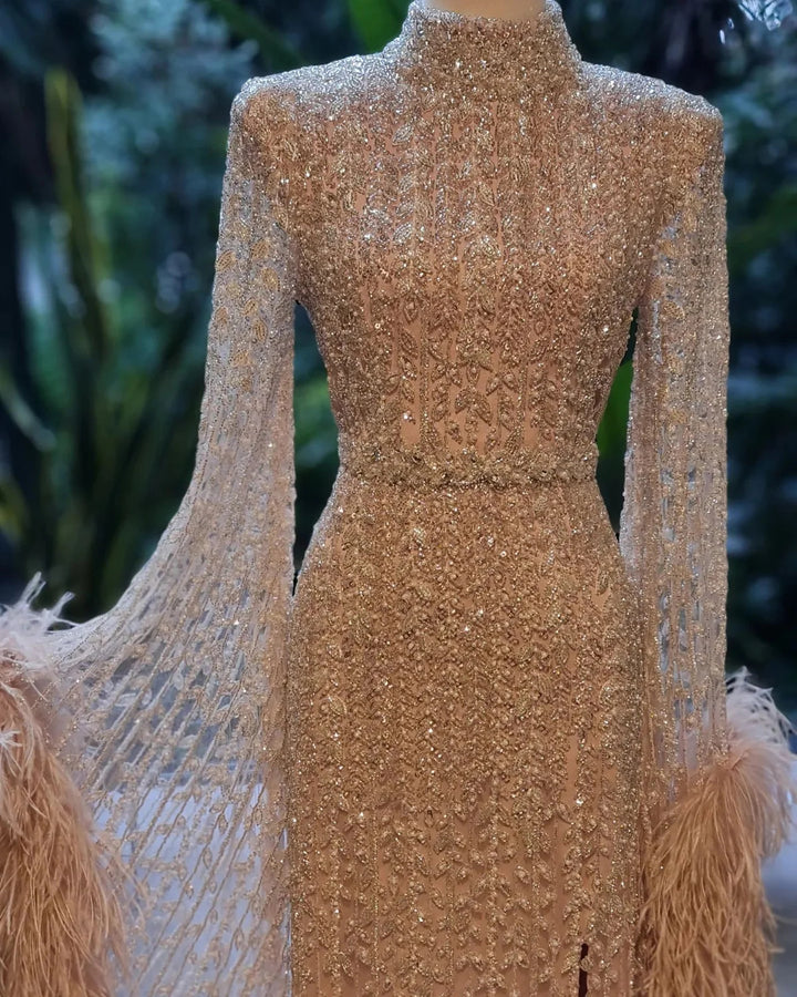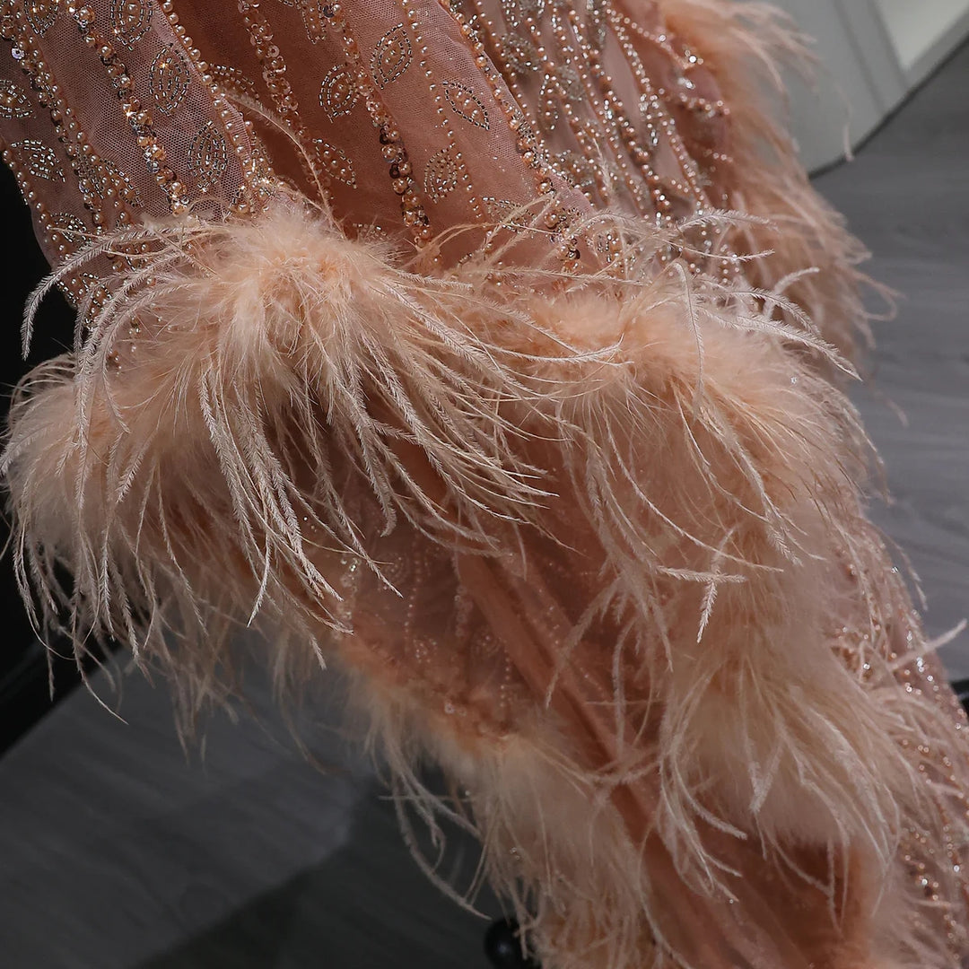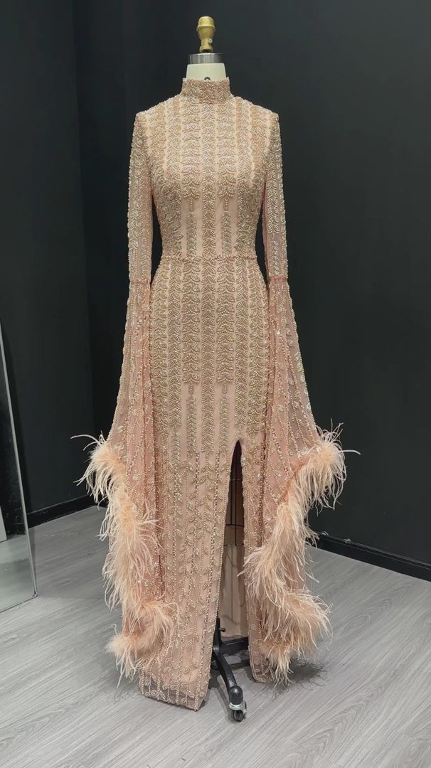 This elegant rose gold evening dress, featuring feathered cape sleeves, is the perfect choice for a stunning and sophisticated look. The delicate feathers add a touch of luxury to the dress, making it a must-have for any special occasion. Crafted with expert precision, this dress is sure to make a statement with its timeless and glamorous design.