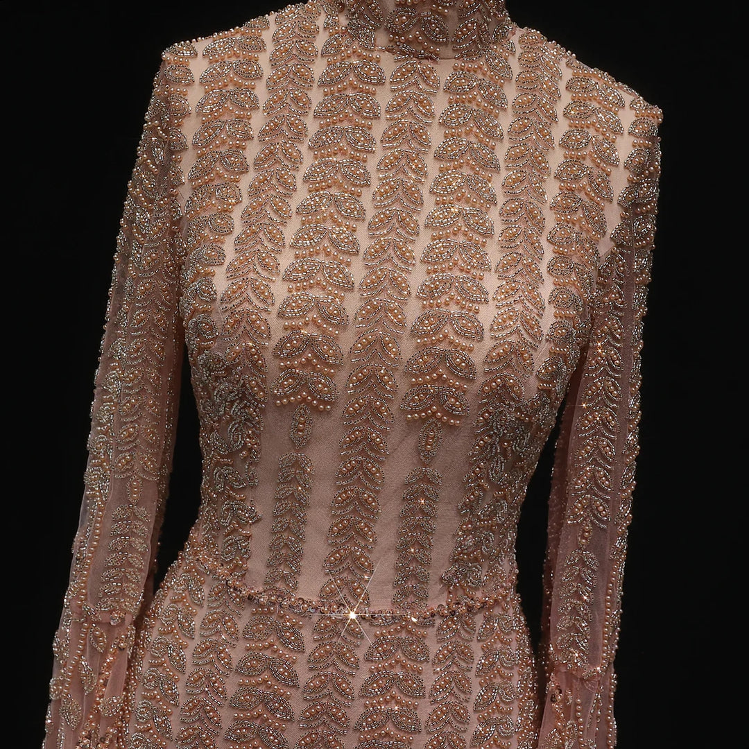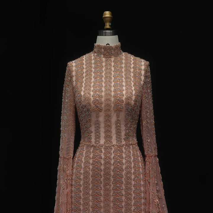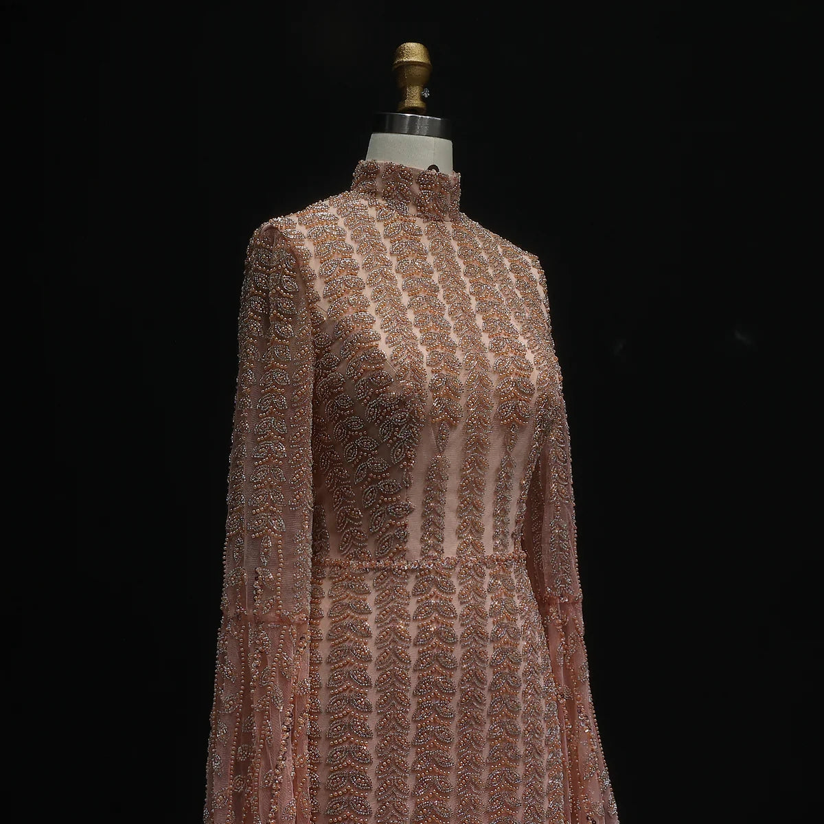 This elegant rose gold evening dress, featuring feathered cape sleeves, is the perfect choice for a stunning and sophisticated look. The delicate feathers add a touch of luxury to the dress, making it a must-have for any special occasion. Crafted with expert precision, this dress is sure to make a statement with its timeless and glamorous design.