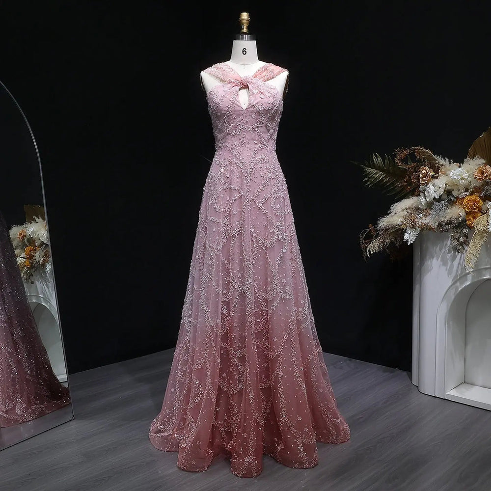 Elegant Gradient Pink Beaded Sequin Halter Prom Dress SS709