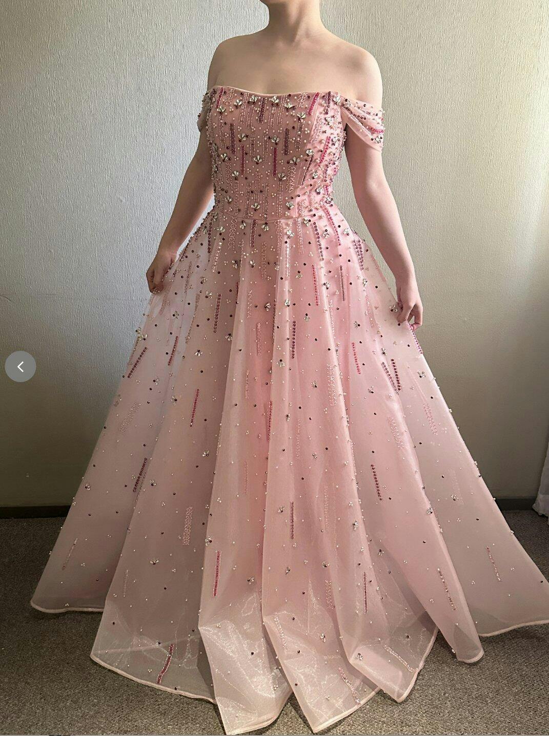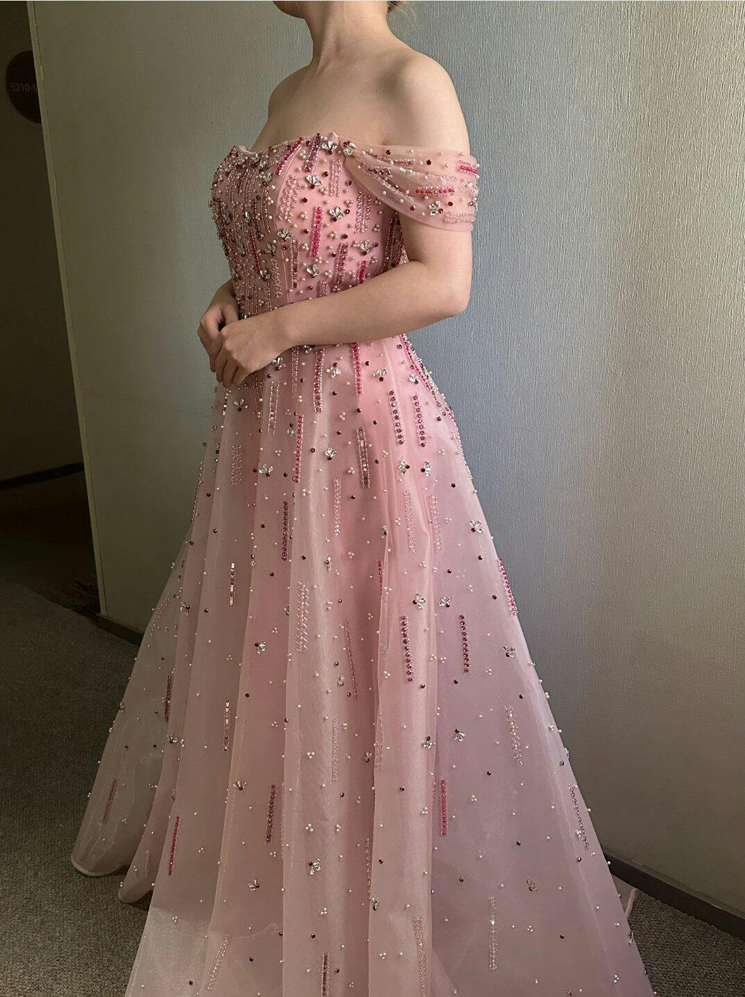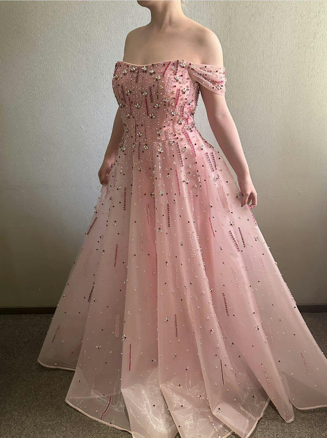 This Romantic Pink Off Shoulder Evening Dress combines elegance with intricate craftsmanship. Featuring delicate beaded details that subtly catch the light, its off-shoulder design enhances the neckline with a flattering silhouette. Perfect for formal events, this gown offers a timeless, sophisticated look that balances charm and grace effortlessly.