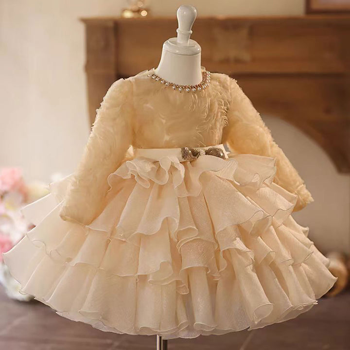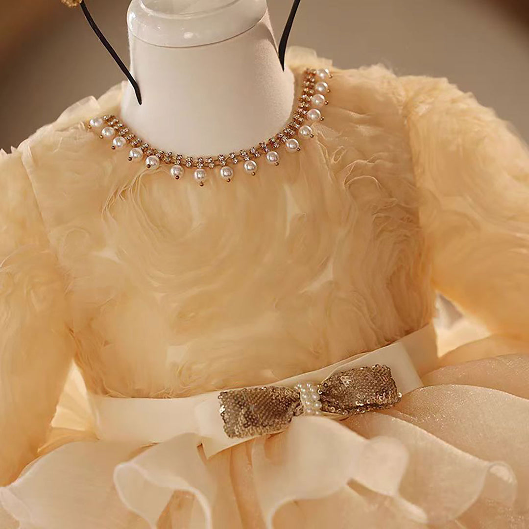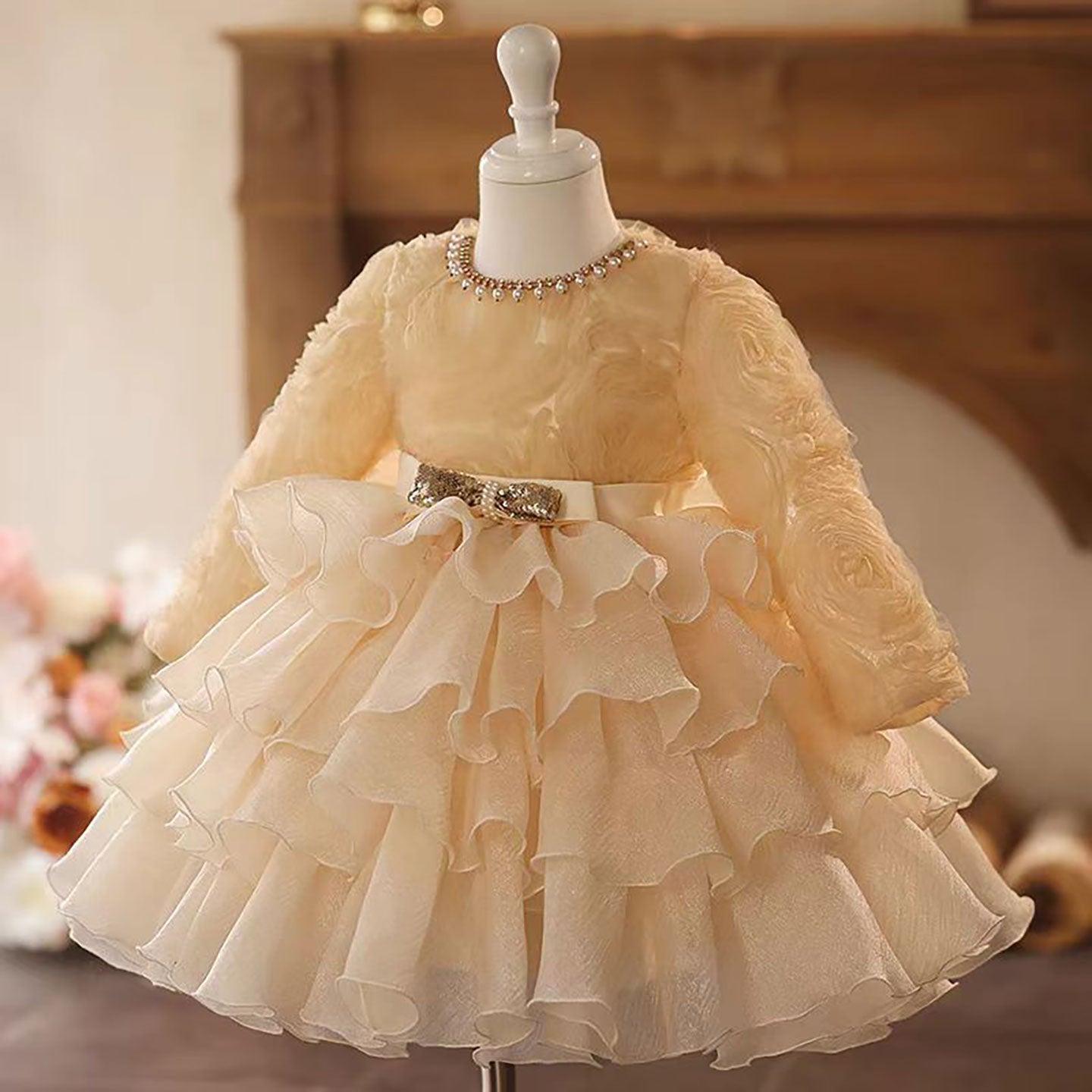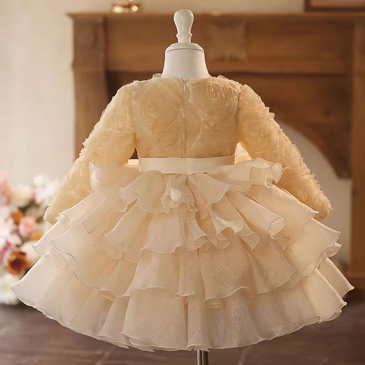 Champagne Tulle Girl Dress Long Sleeve Toddler Kids 1st Birthday Gown J465
