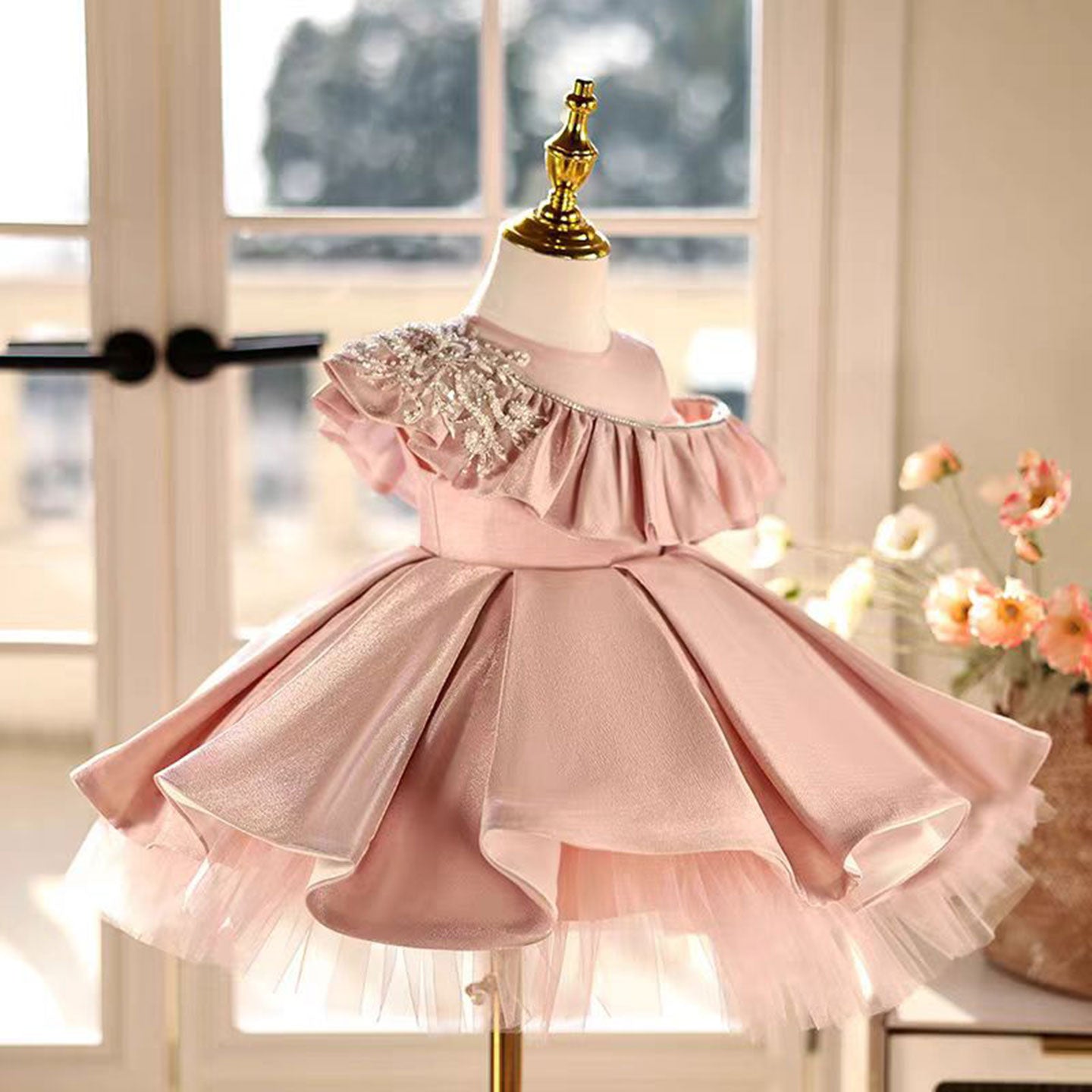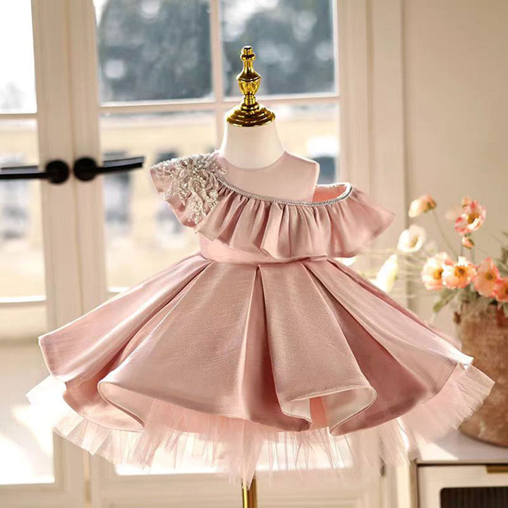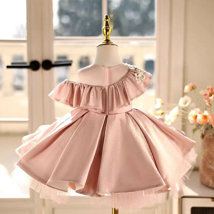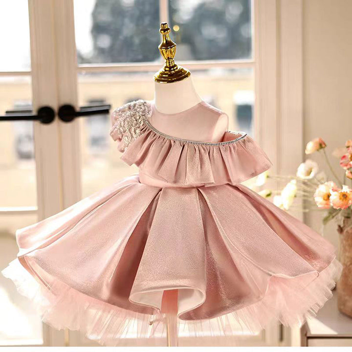 Lovely One-Shoulder Ruffled Satin Pearl Pink Girl Dress D014