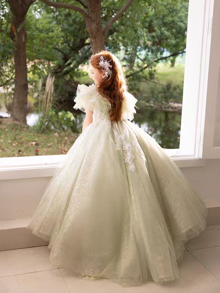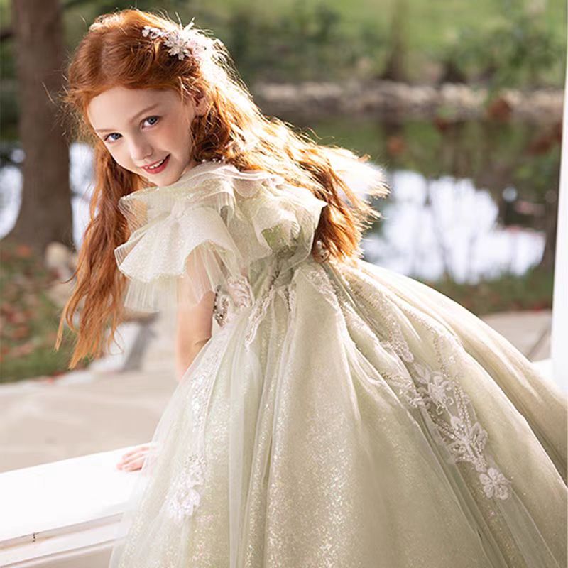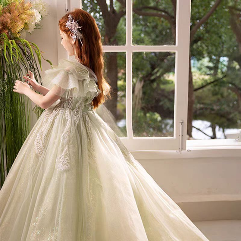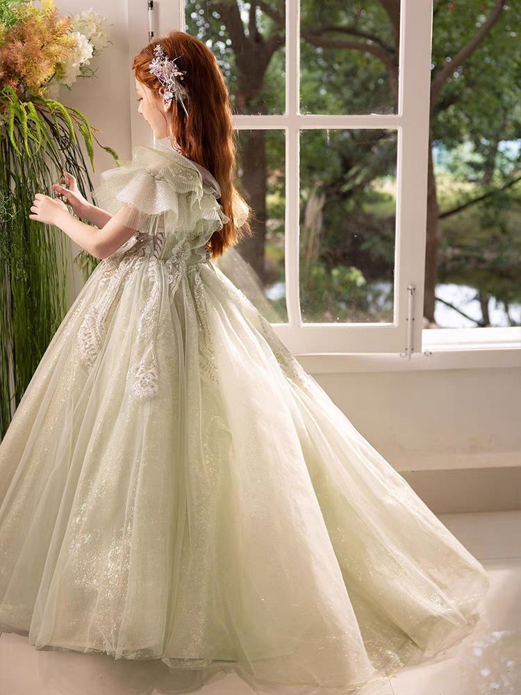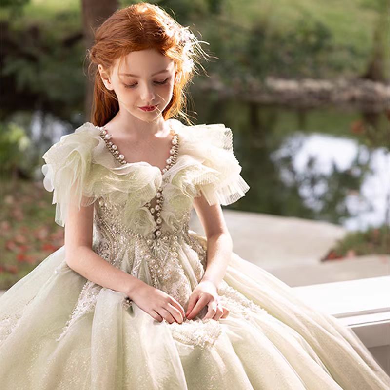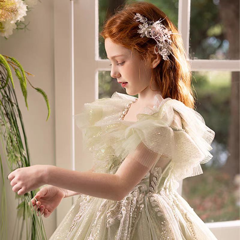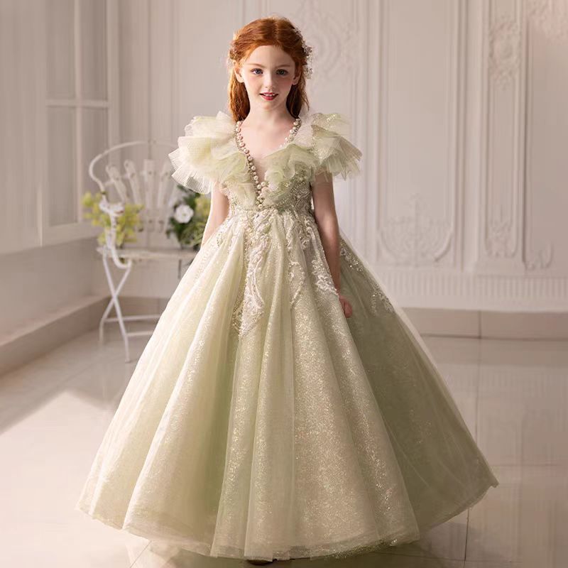Luxury Sage Green Girl Dress Beaded for kids Birthday Pageant Party J360
