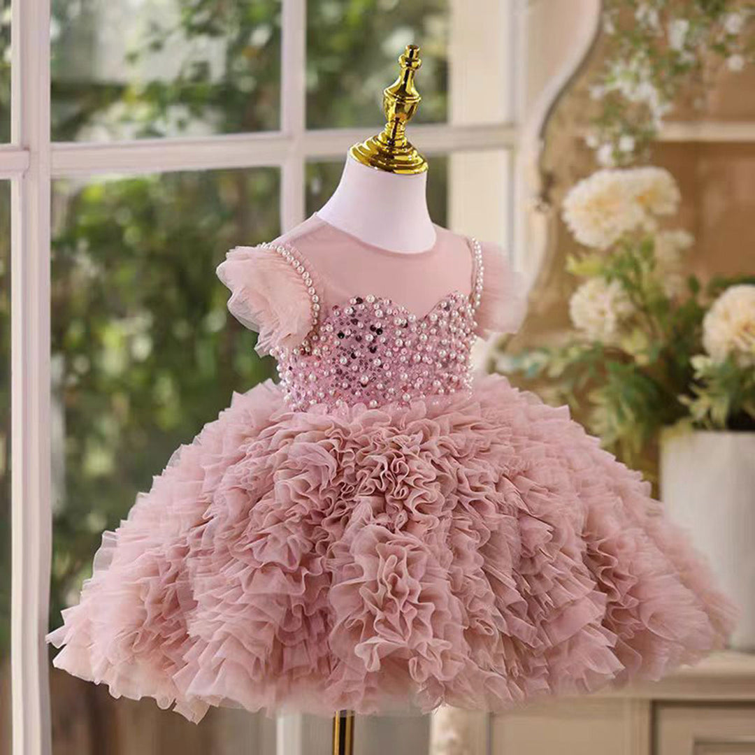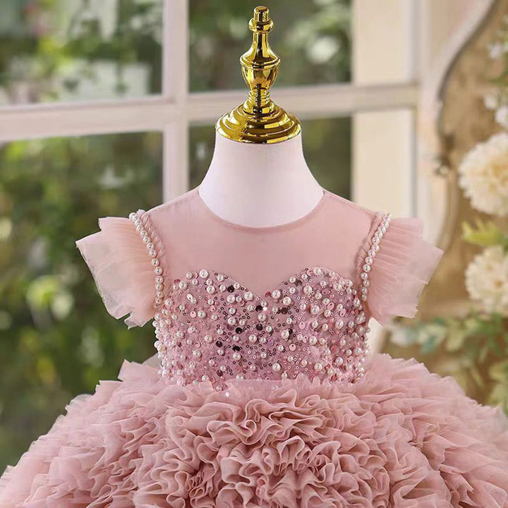 O-Neck Pearl Embellishment Tulle Pink Flower Girl Dress D011