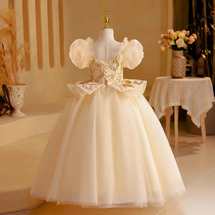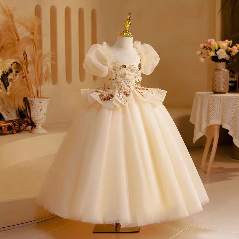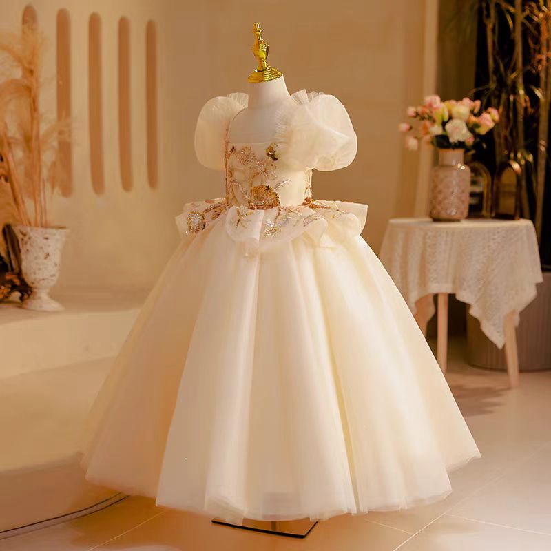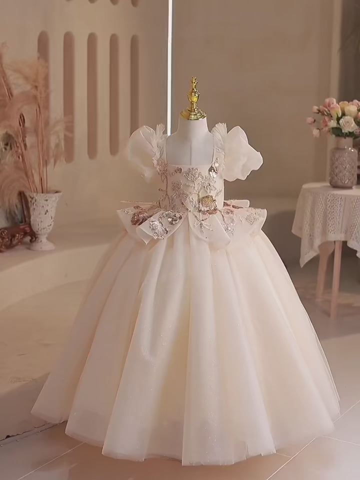 Elegant Beige Dubai Girl Dress Beading Arabic Princess Kids J243