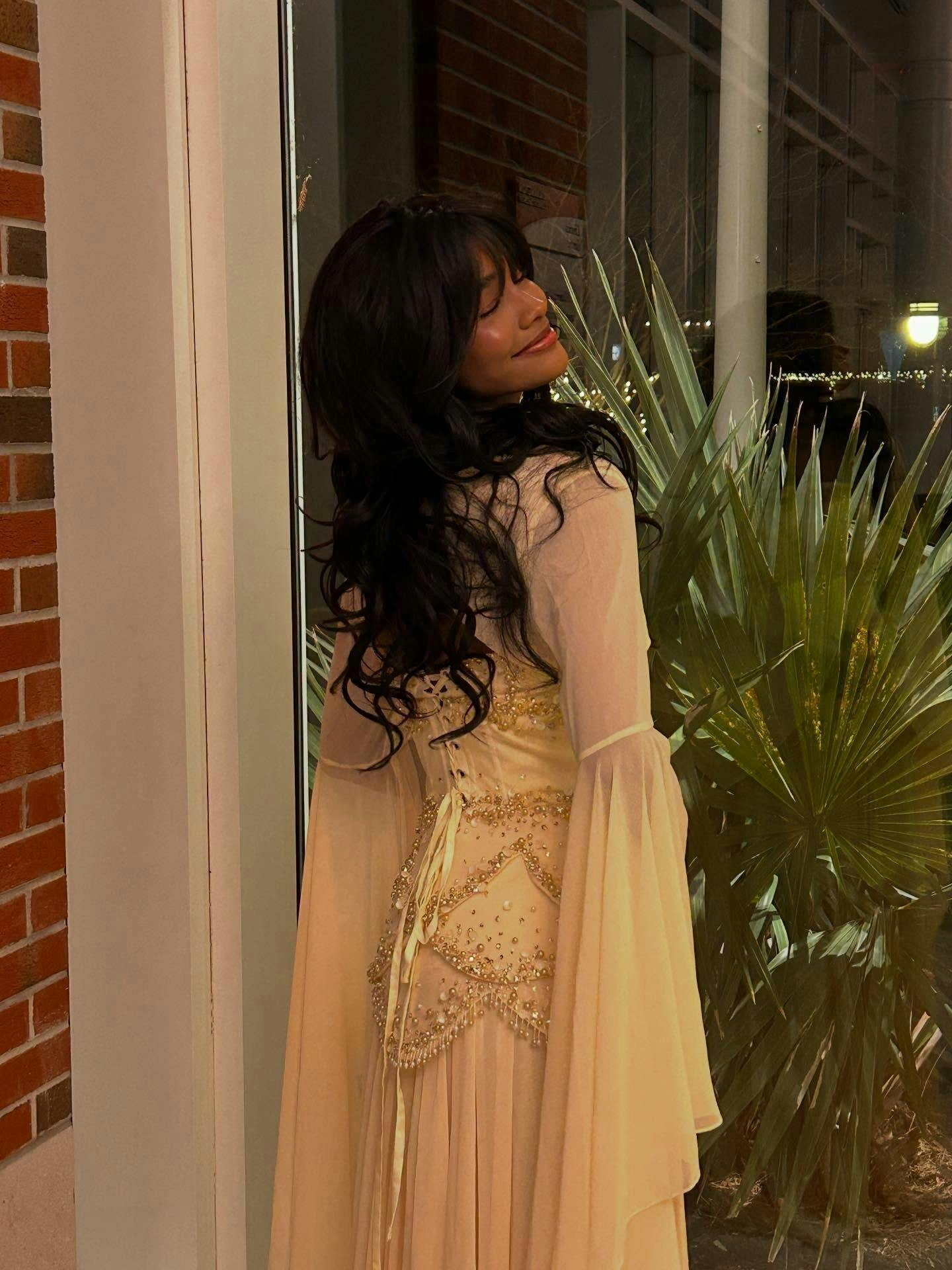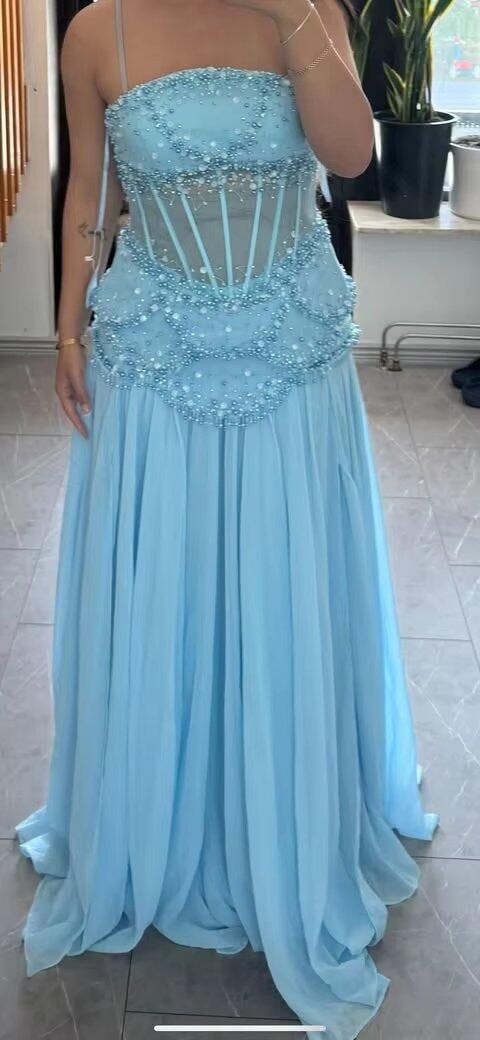 Luxury Pearls Tassel Blue Evening Dress with Flowing coat SS286