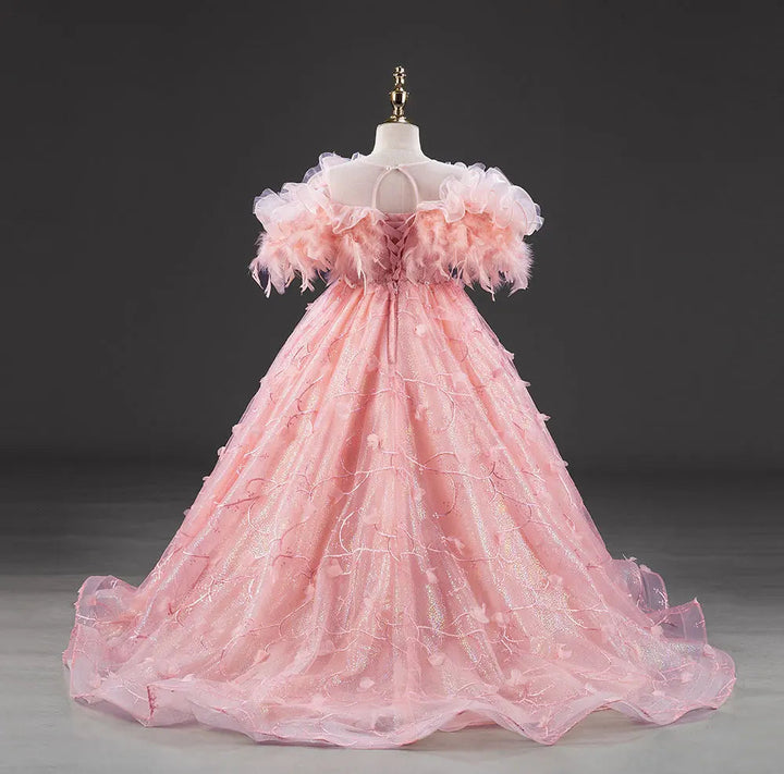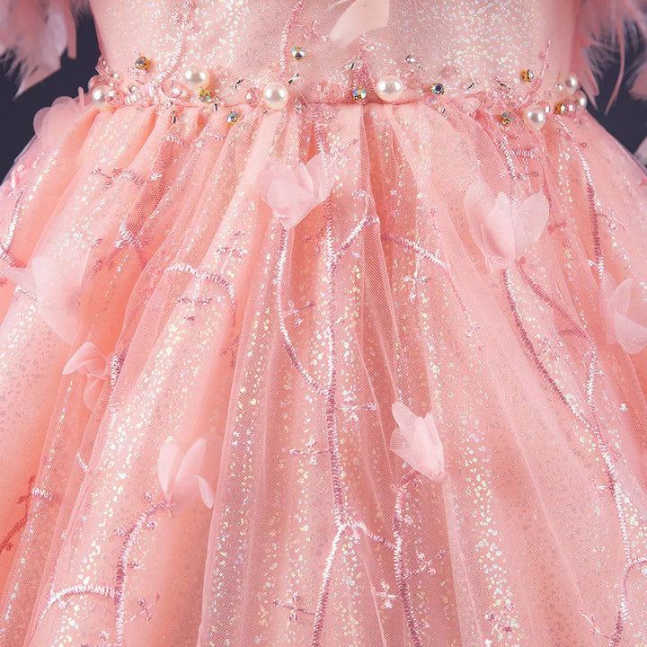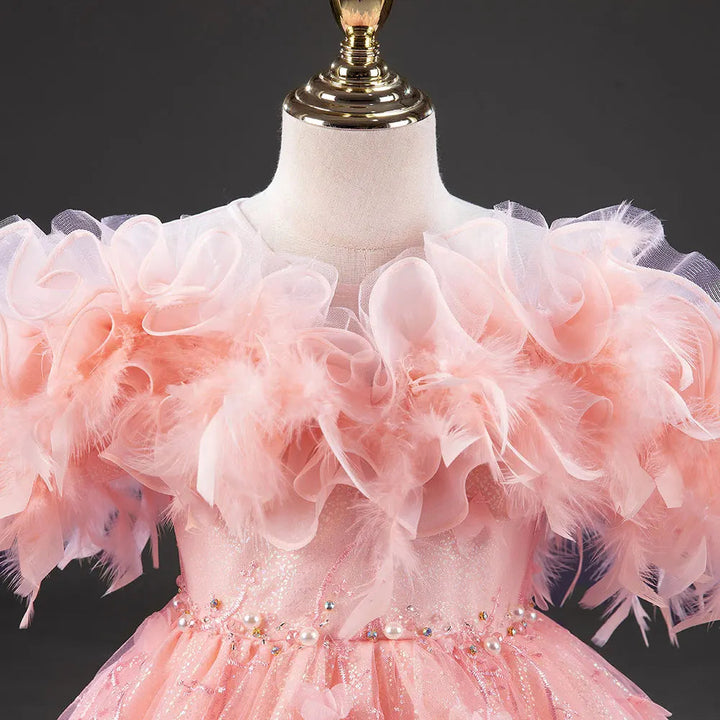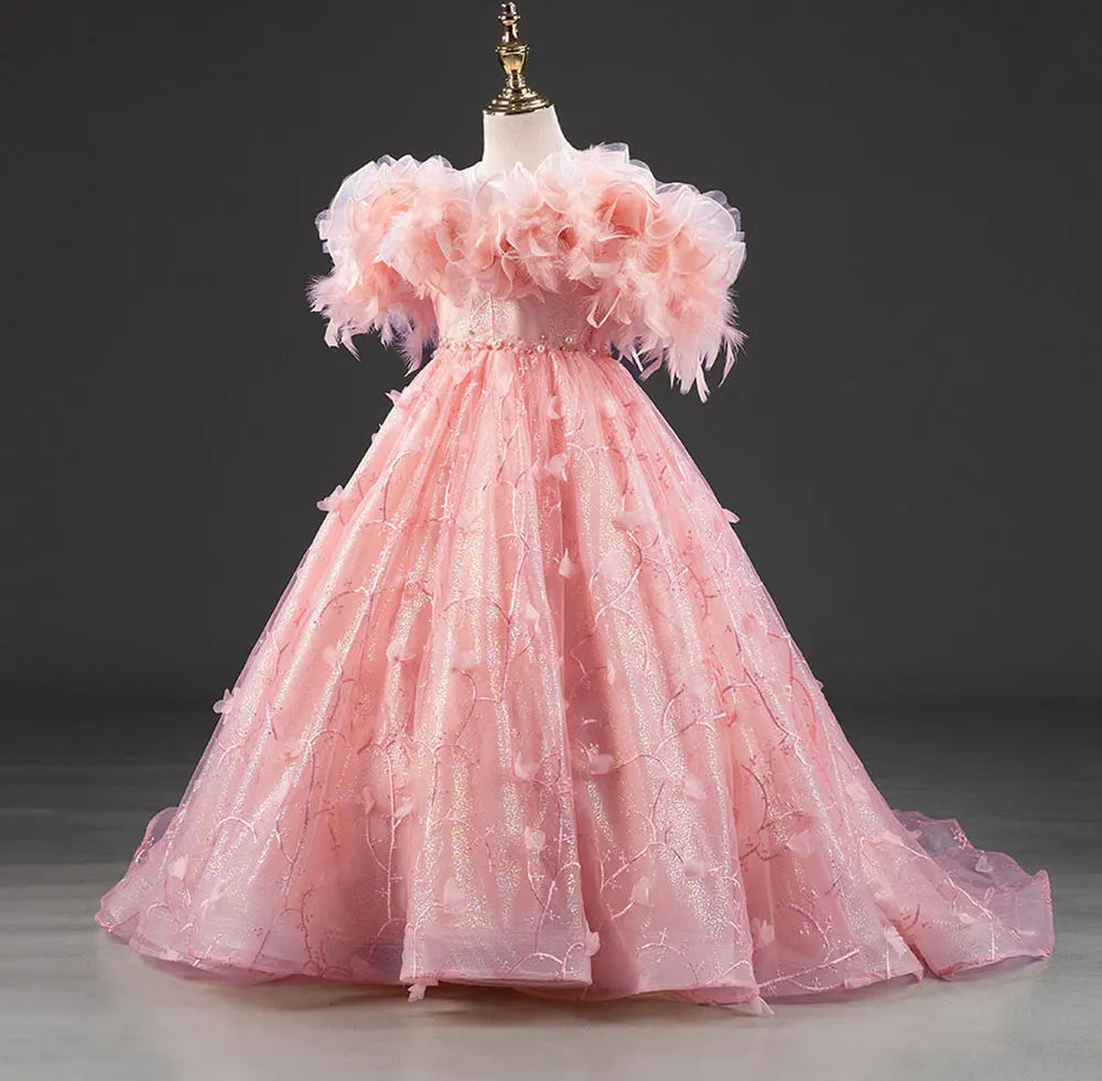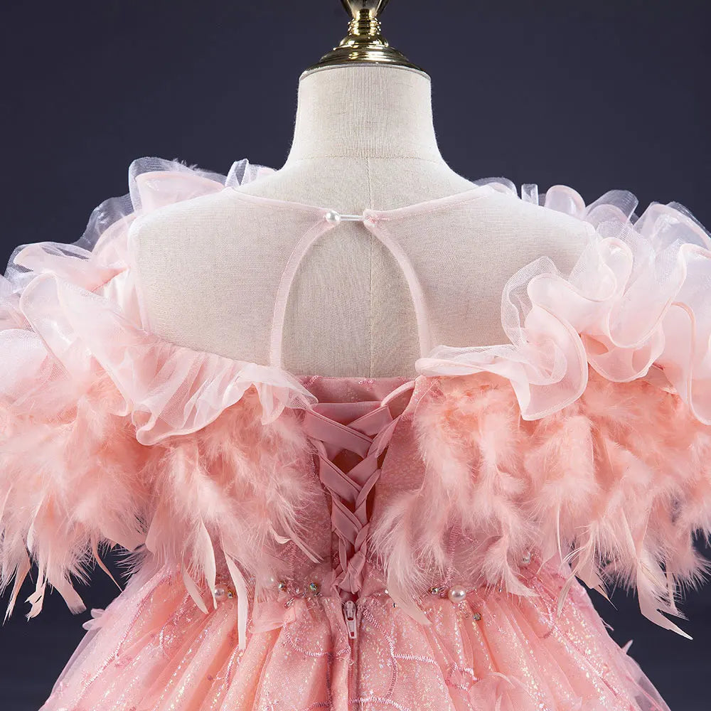 Pink Flower Girl Dresses with Feather Pearls Arabic Princess J015