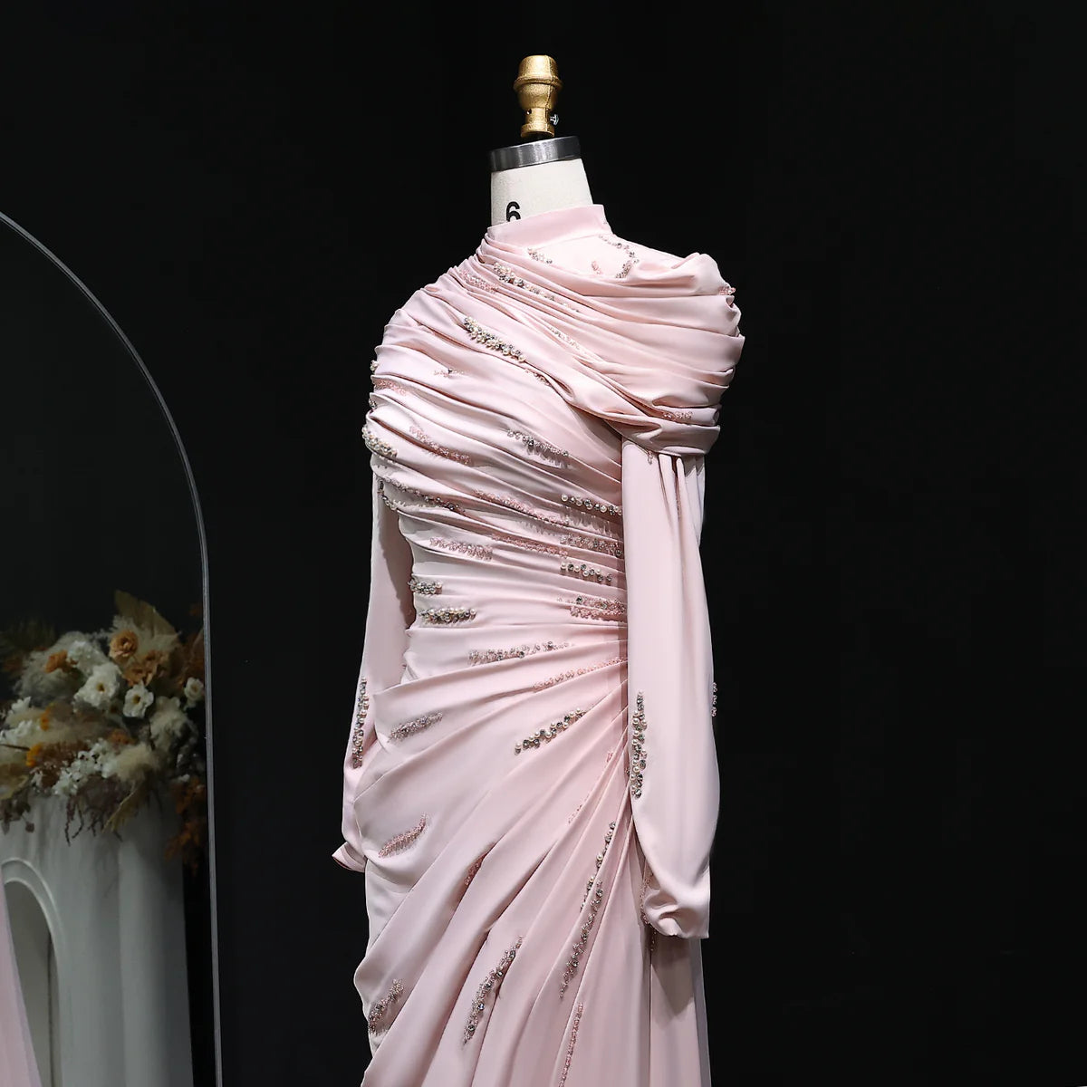 This pink mermaid evening dress combines sophistication with allure through its form-fitting silhouette that gracefully flares at the hem. Adorned with sparkling beads, it adds subtle radiance suitable for formal occasions. The carefully crafted ruffled layers enhance the dress’s texture and movement, creating an elegant presence. Perfect for events where refined style and confident poise are essential.