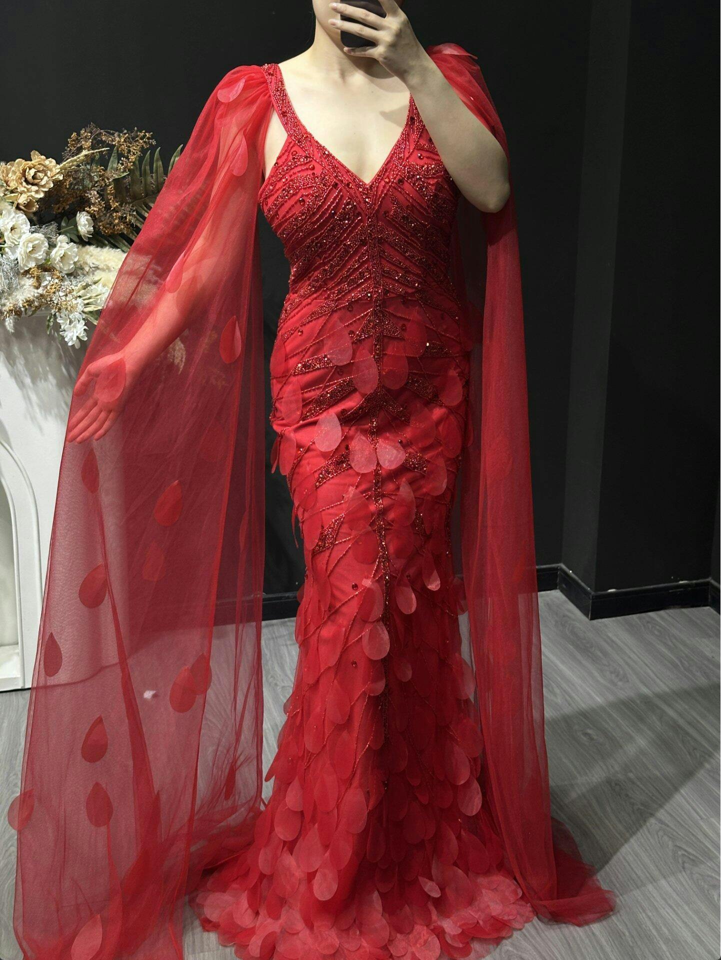 Glamorous Wine Red Feather Beaded Evening Dress Flowing Cape SS283