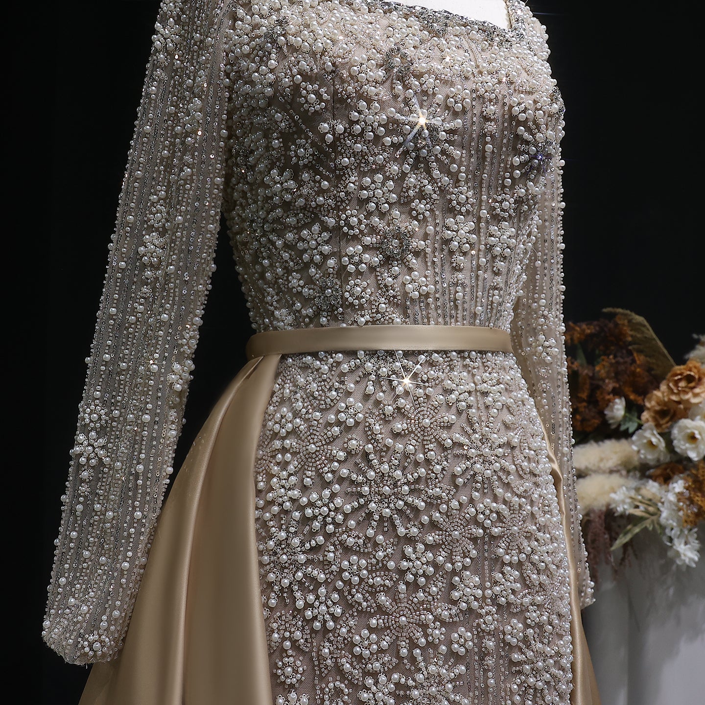 Experience unparalleled opulence with this champagne evening masterpiece, featuring exquisite beadwork that catches light with every movement. The layered overskirt design adds architectural interest and dimension, elevating the silhouette with professional polish. Meticulous hand-beading across the bodice and skirt demonstrates superior craftsmanship, while the champagne palette provides a universally flattering canvas that complements diverse complexions. The structured overskirt creates a dramatic yet refined aesthetic, perfect for prestigious galas, formal ceremonies, and high-profile events. This investment piece combines luxurious materials with impeccable construction, ensuring both comfort and confidence throughout the evening. The interplay of beaded embellishment and flowing layers creates a show-stopping presence that commands attention while maintaining sophisticated restraint.