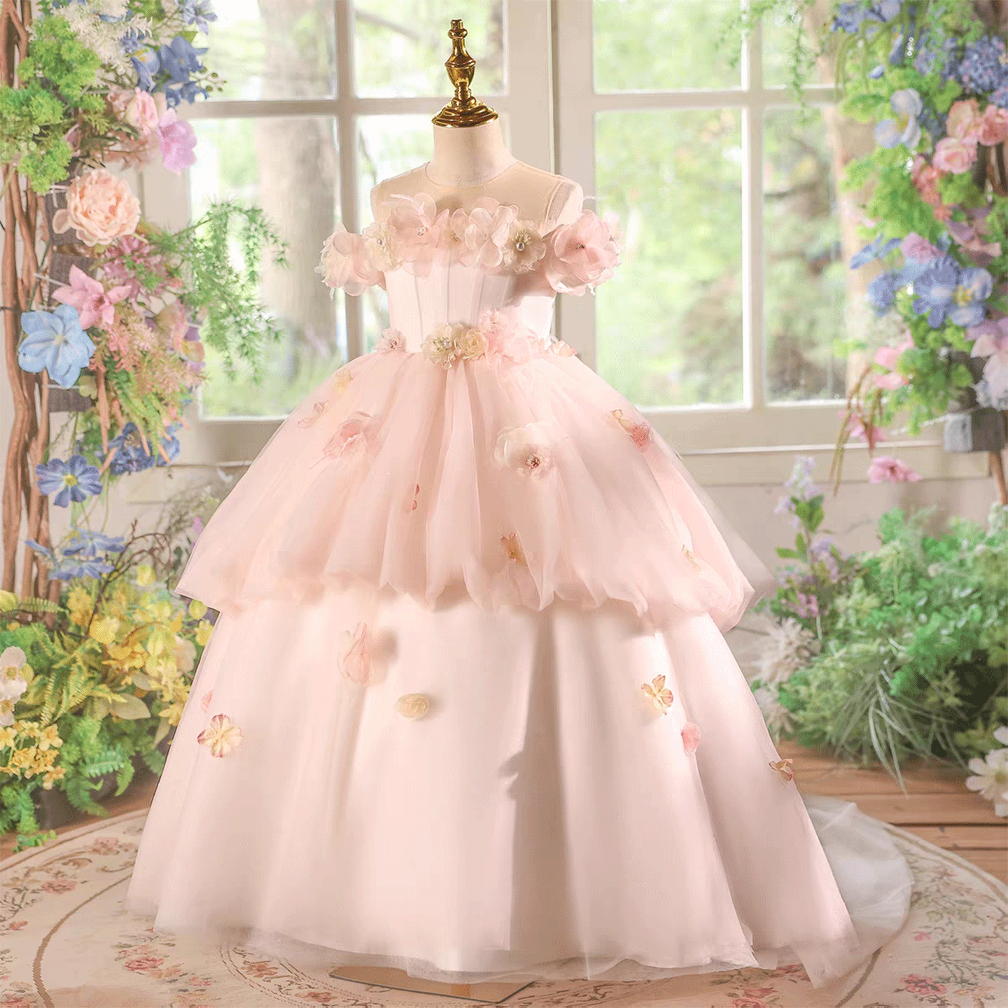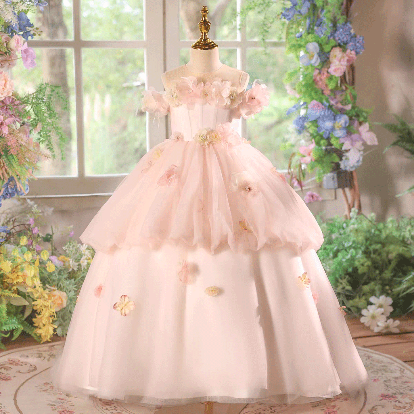 Pink Flower Girl Dress with Tiered Tulle Layers for Wedding Birthday J614