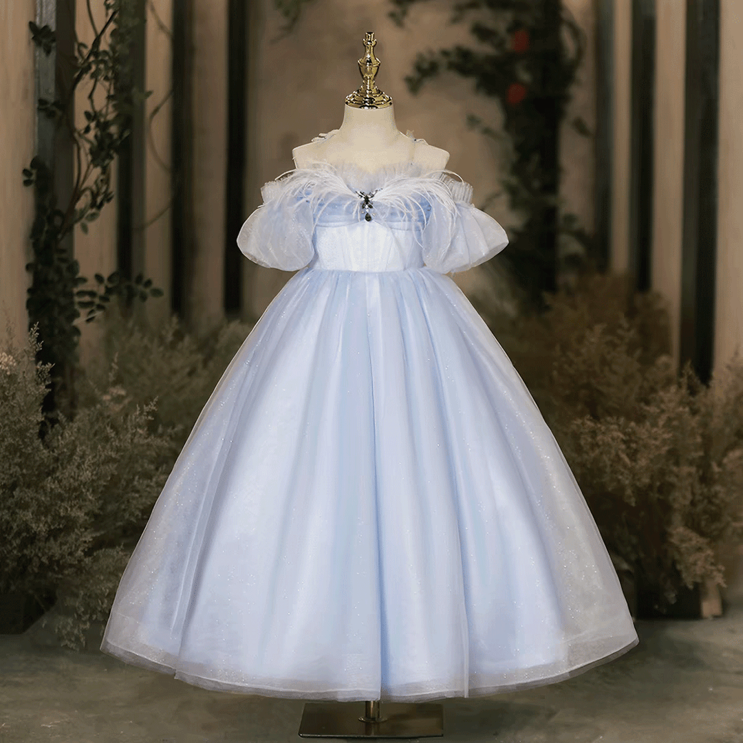Blue Tulle Flower Girl Dress with Feather Kids Princess Ball Gown J617