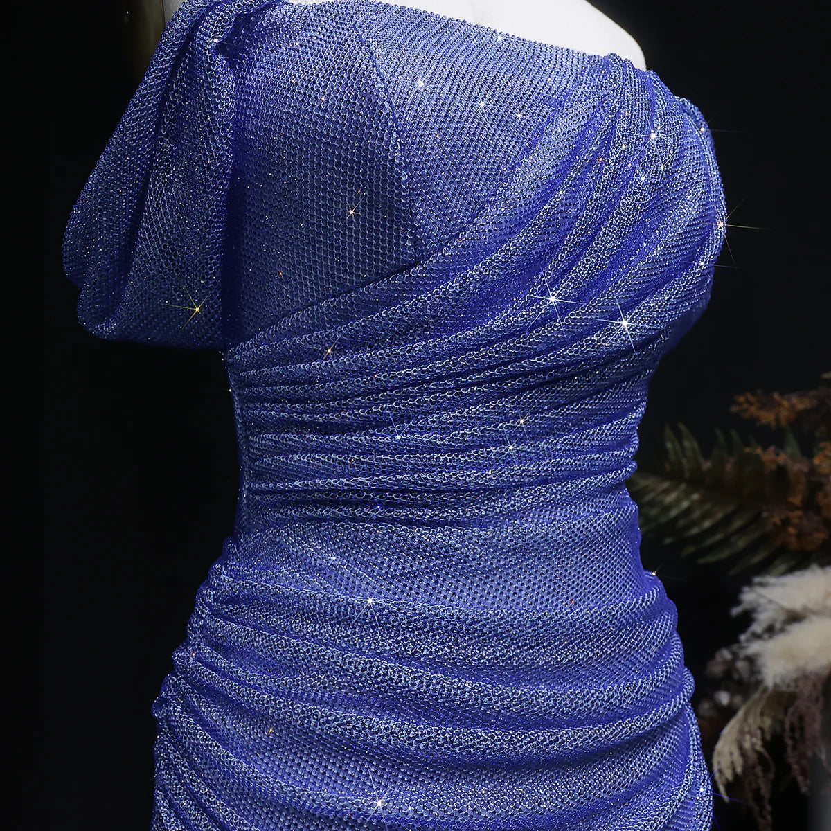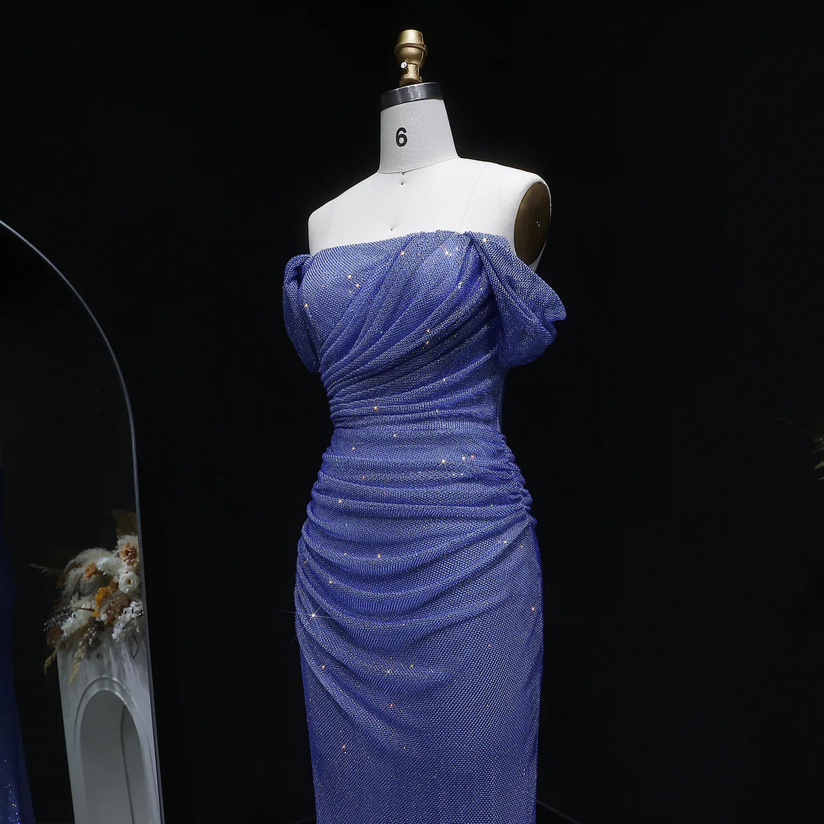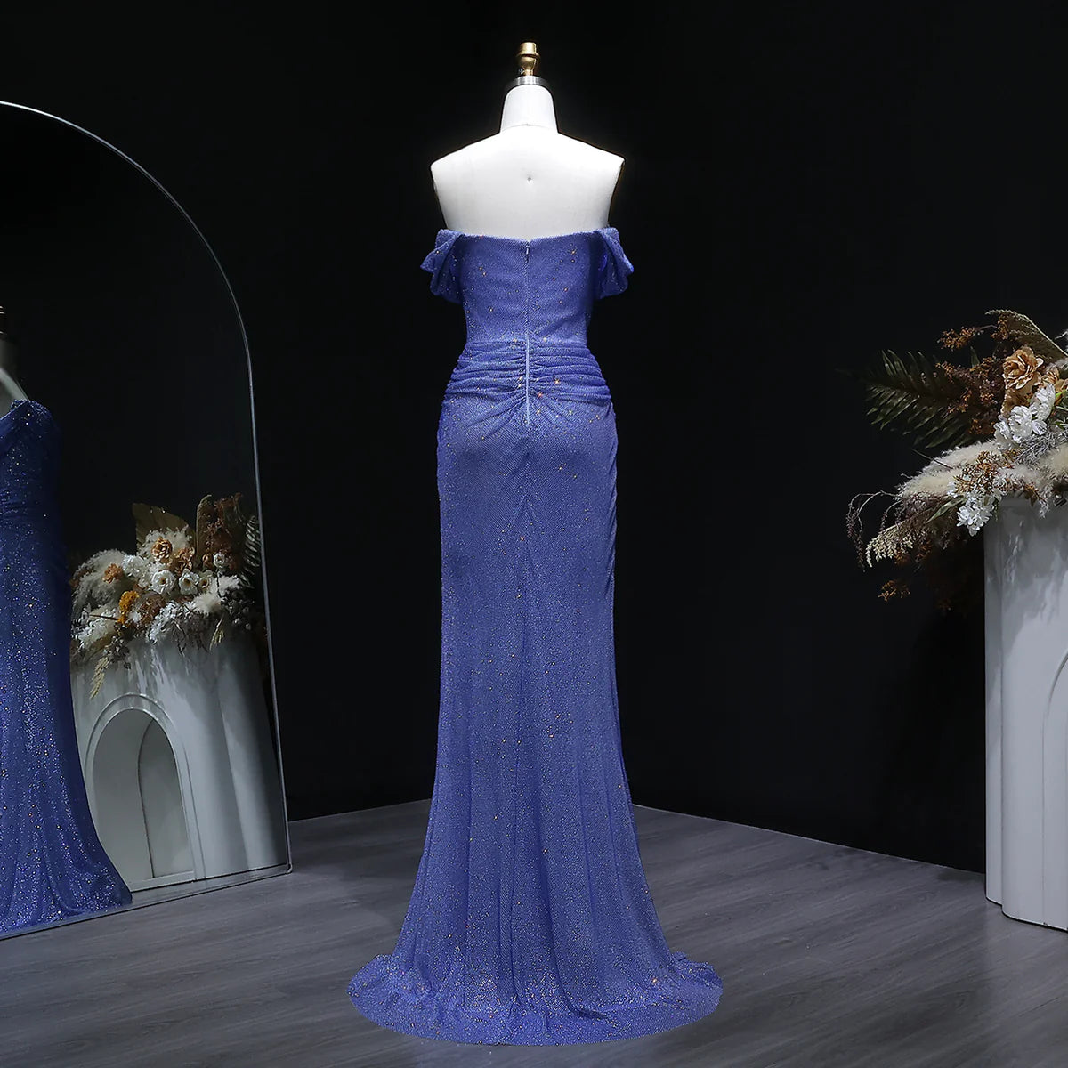 This striking blue evening dress combines contemporary design with timeless sophistication. Strategic ruching along the silhouette creates dimension and flatters your natural curves while the off-shoulder cut exudes modern elegance. The luxurious fabric drapes beautifully, offering both visual interest and comfortable movement. Ideal for formal events, galas, or upscale celebrations, this dress makes a confident statement without compromising refinement. The carefully considered construction ensures you'll feel as stunning as you look throughout the evening.