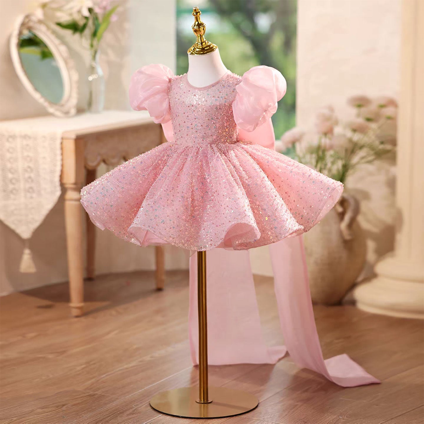 Sparkling Pink Flower Girl Dress with Puffy Sleeves Knee Length D111