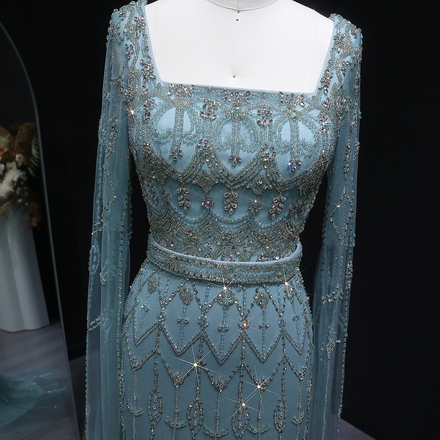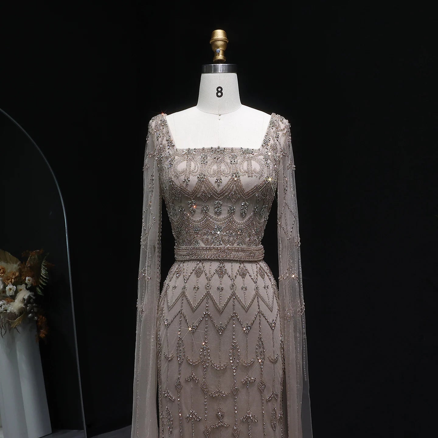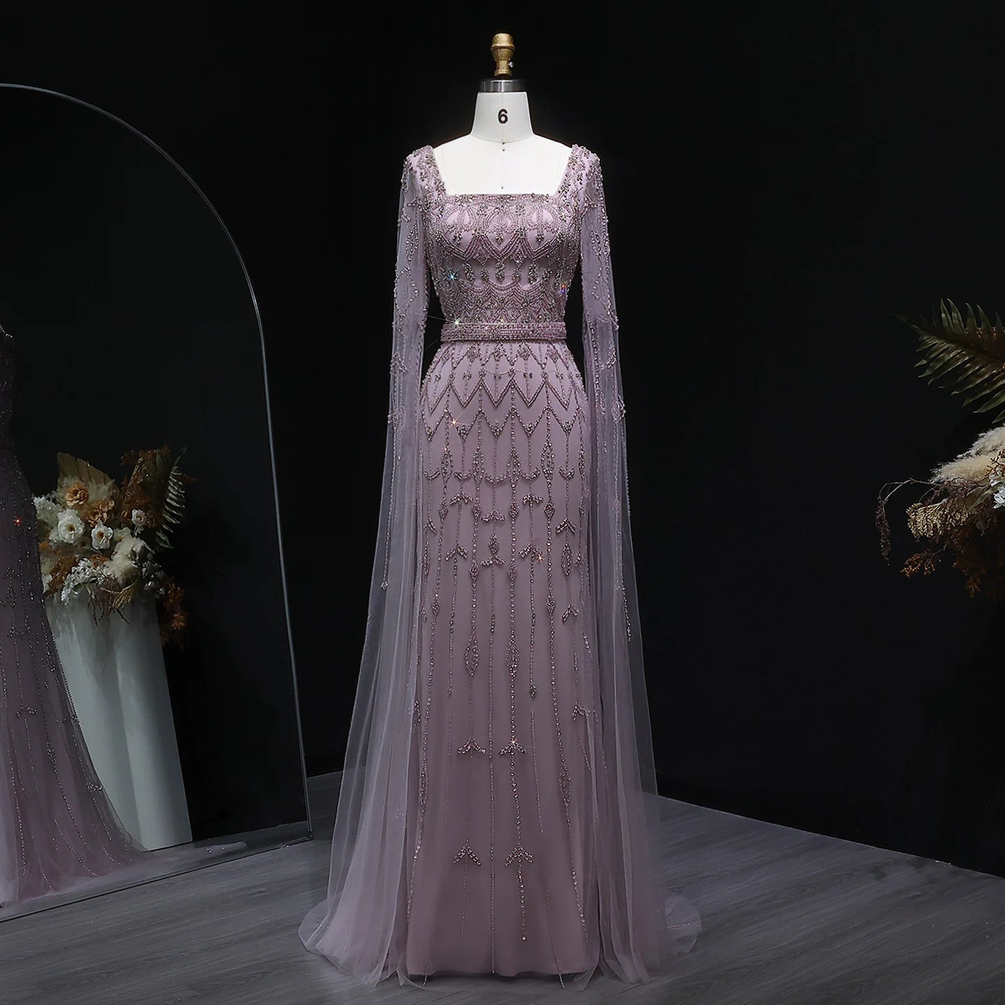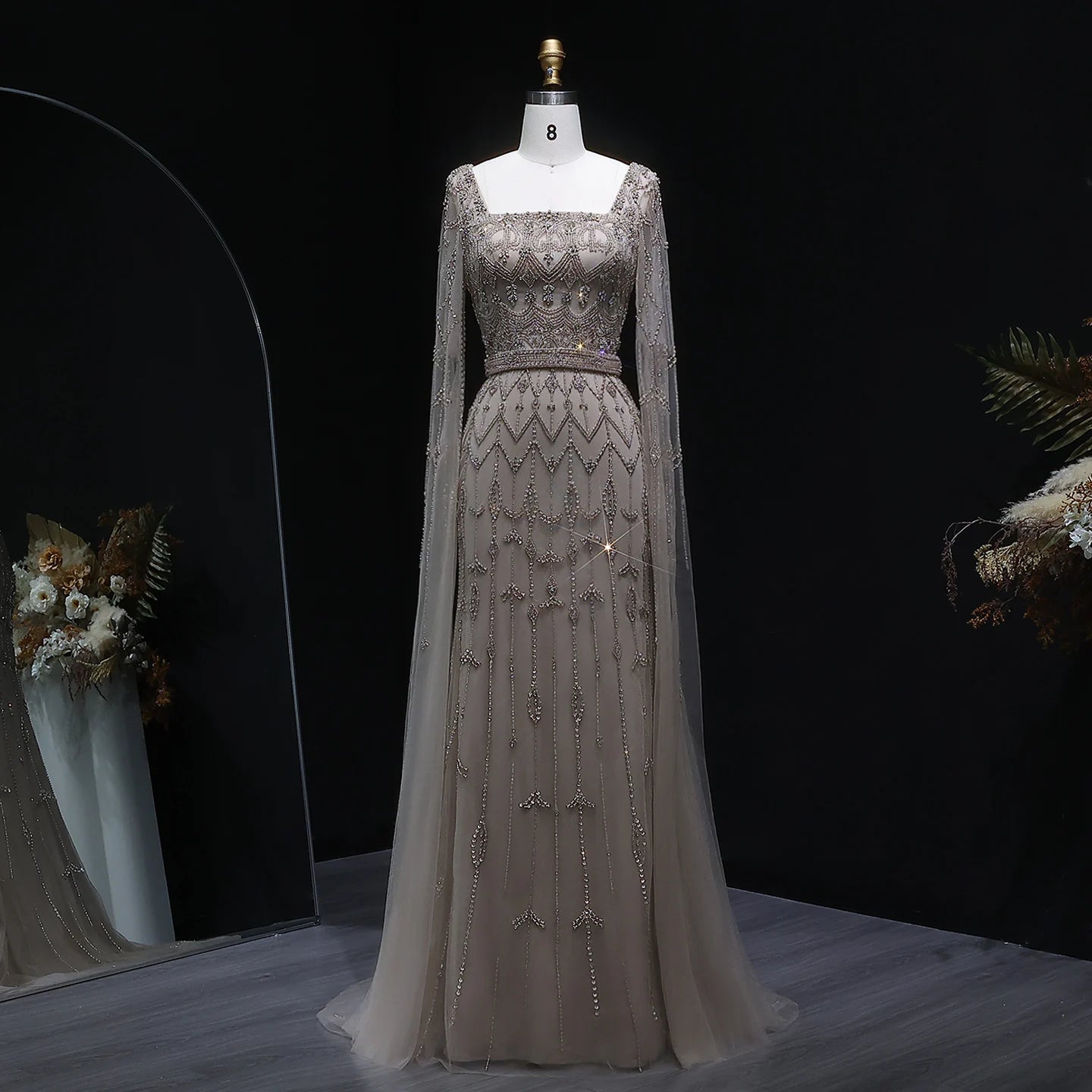 Elegant Beaded Evening Dress with Flowing Cape Sleeves SS089