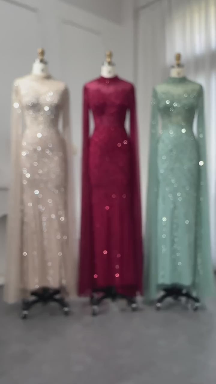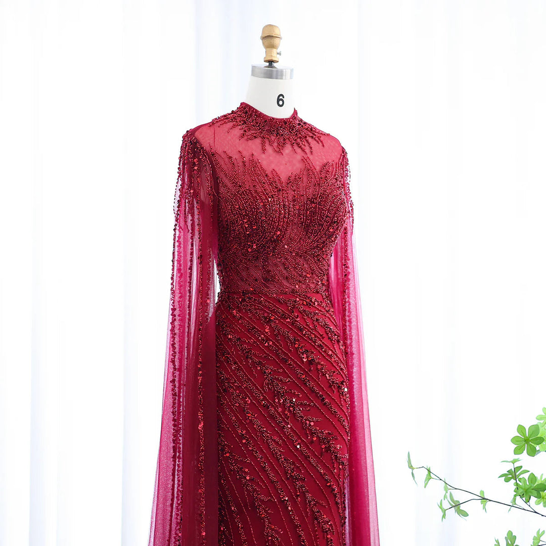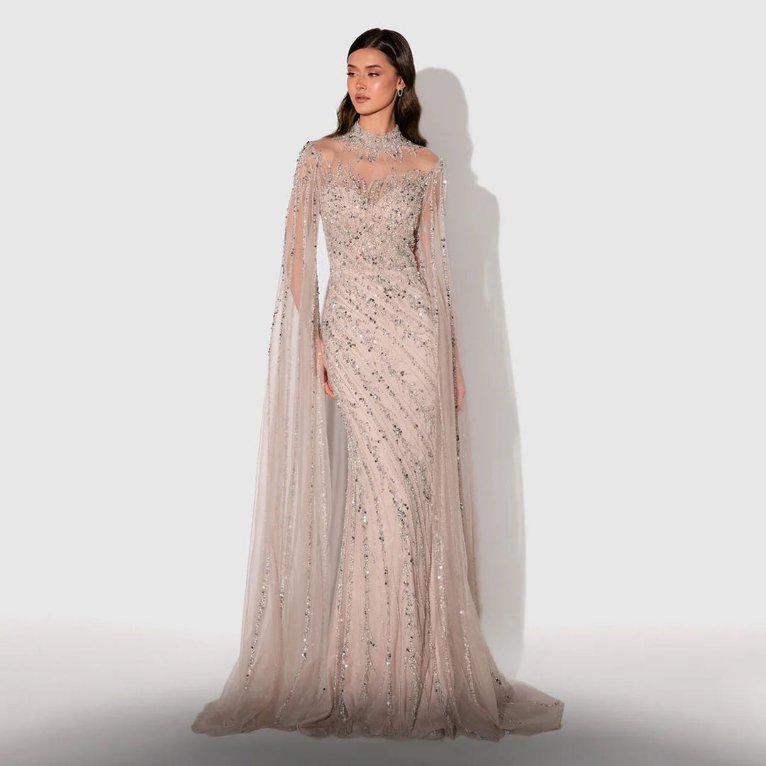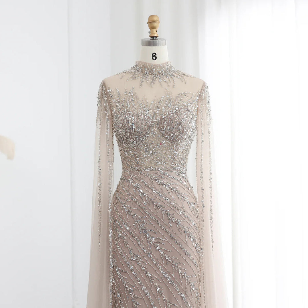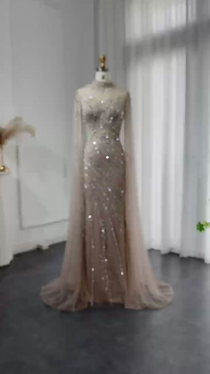 Luxury Black Nude Mermaid Evening Dresses with Cape Sleeves SS162