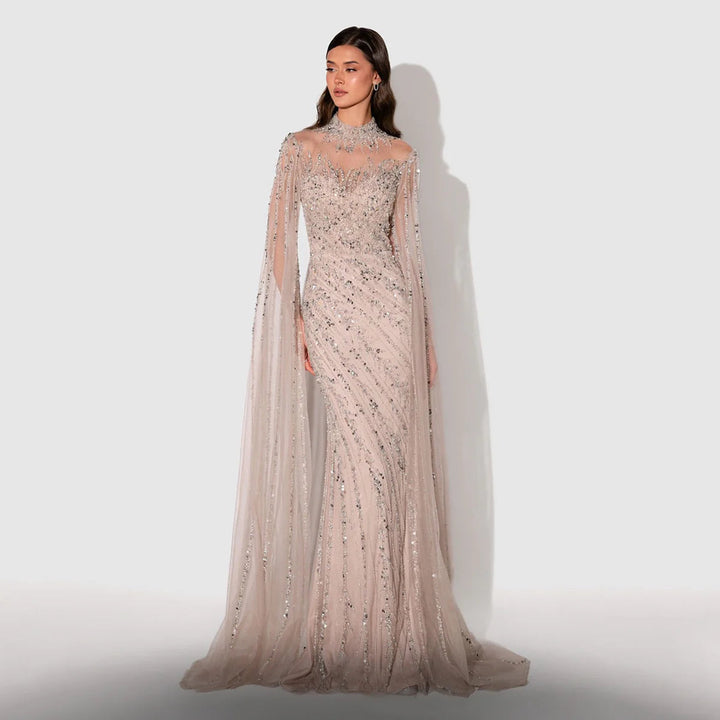 Indulge in pure luxury and sophistication with our Dreamy Vow Mermaid Evening Dress. Featuring a stunning black and nude color scheme and elegant cape sleeves, this dress is perfect for any special occasion. The high neck adds a touch of elegance, making you stand out from the crowd. Elevate your style with our SS162 design.
