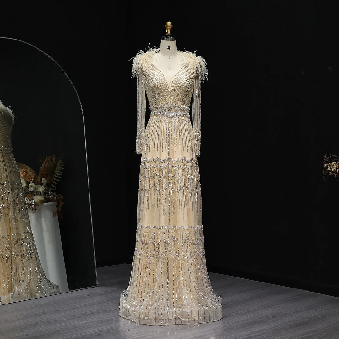 Glamorous Champagne Beaded Prom Dress with Long Sleeves SS632