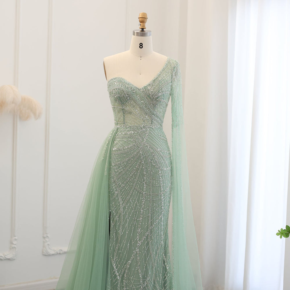 Luxury Mint Green Satin Crystal Cape Evening Dress SS503
