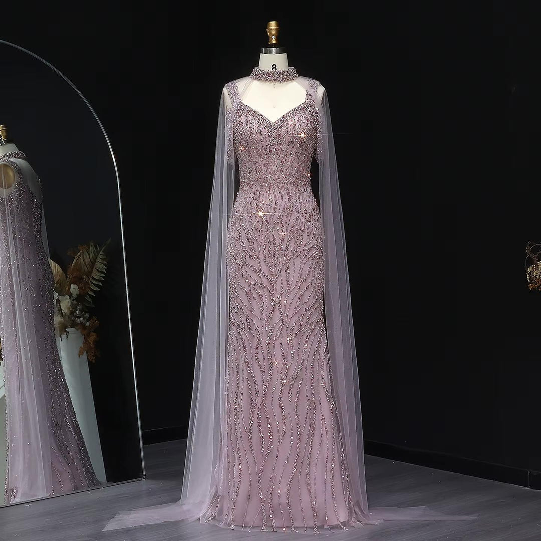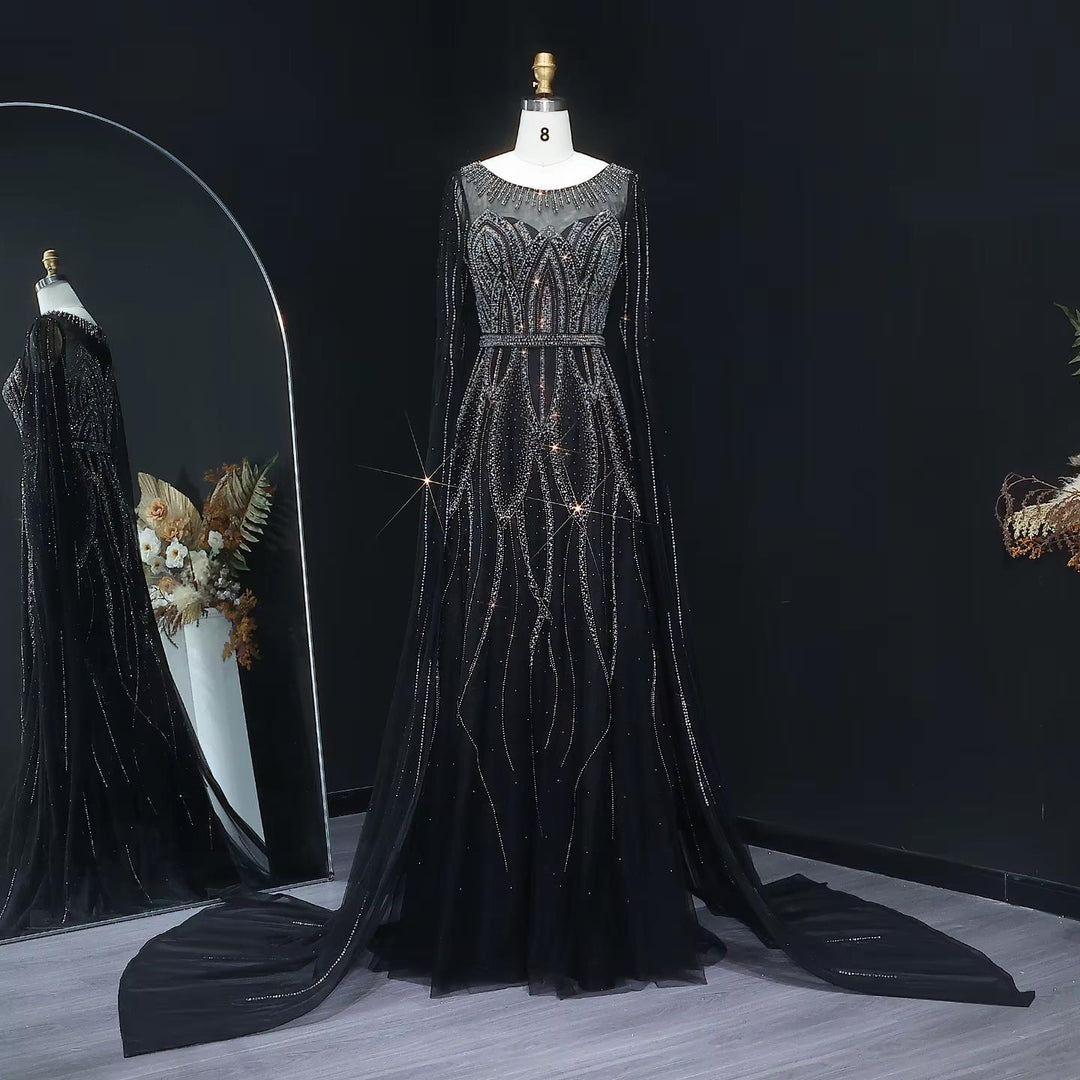 Luxury Crystal Embellished Cape Long Sleeve Evening Dress SS009