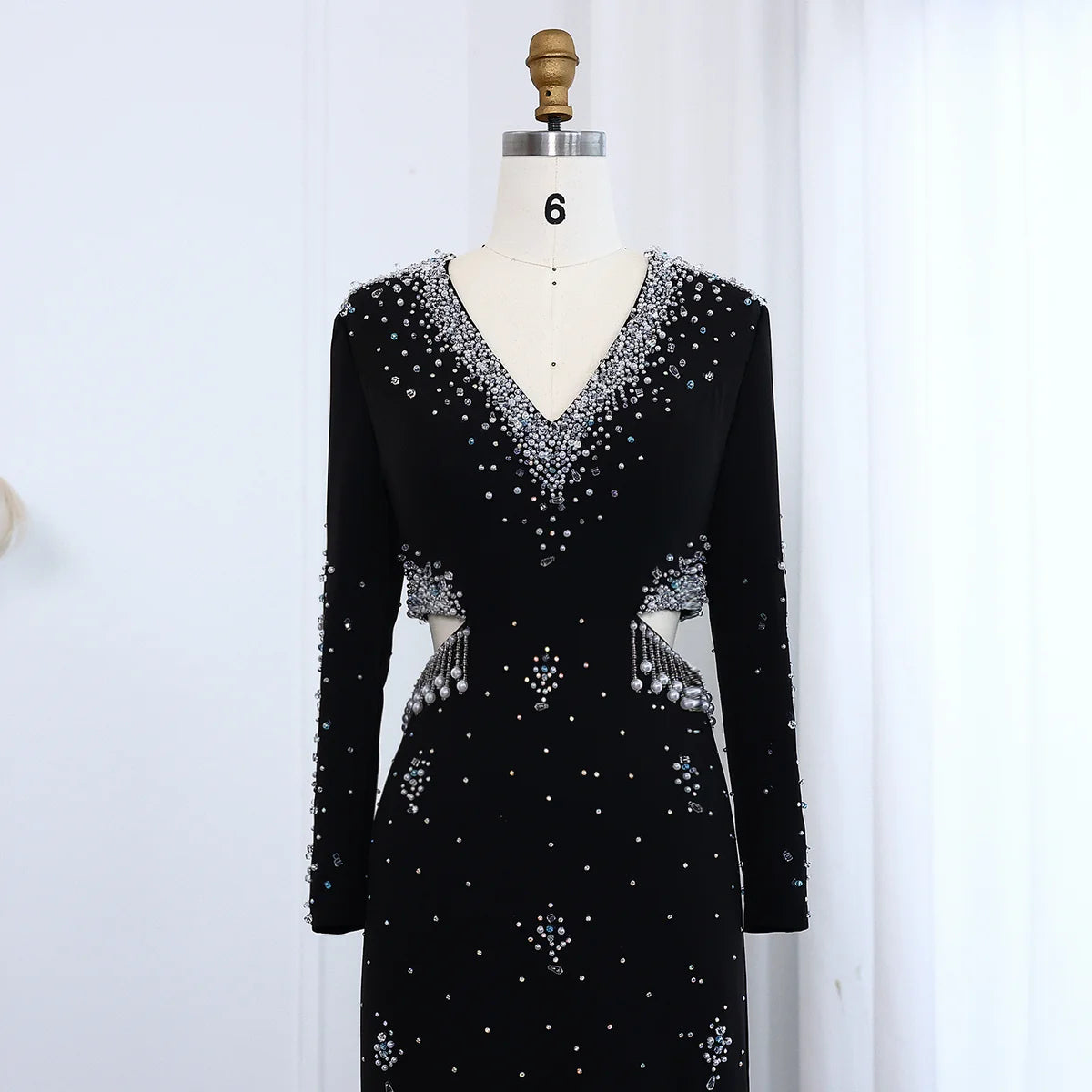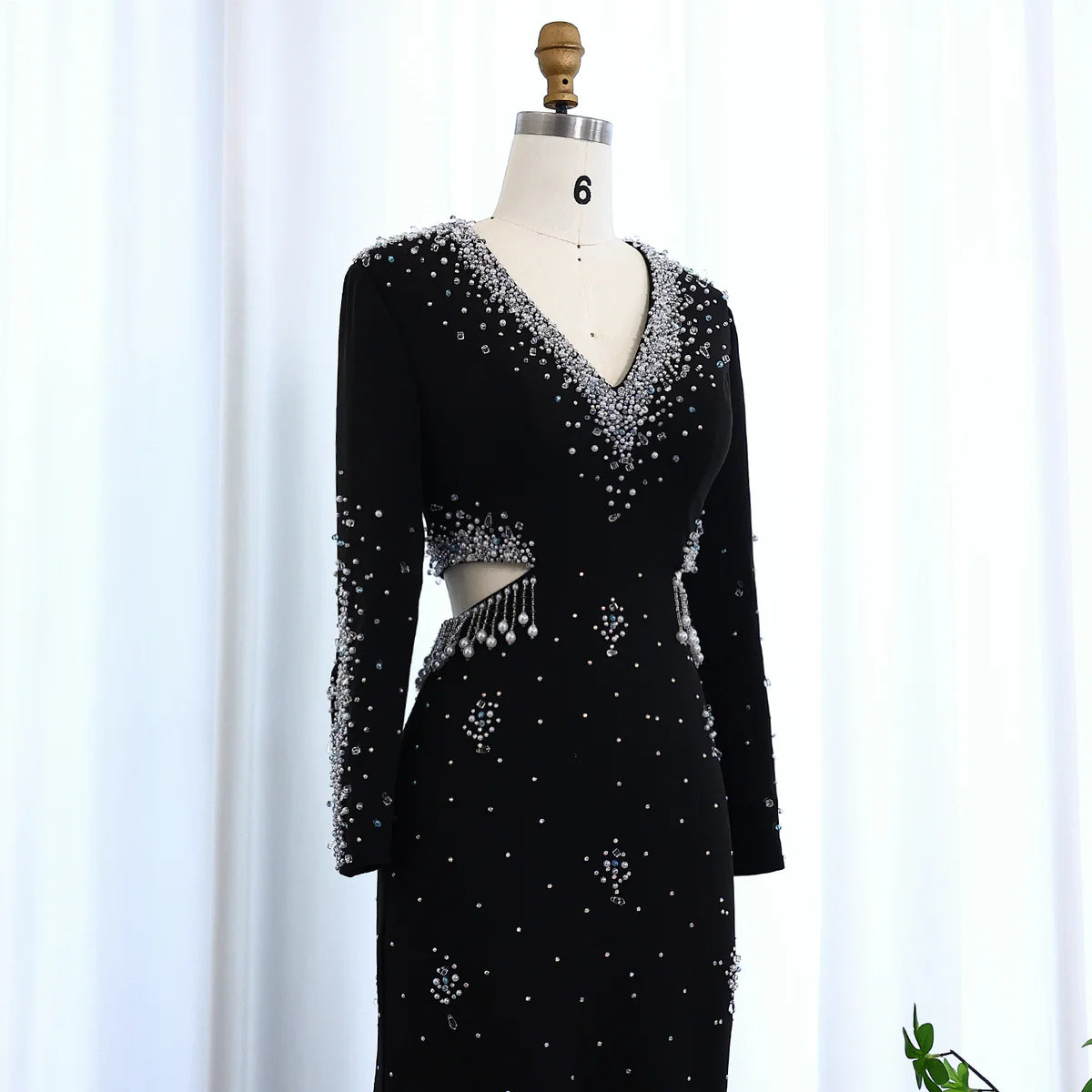Elegant Black Pearl-Embellished Long Sleeve Prom Dress XD019