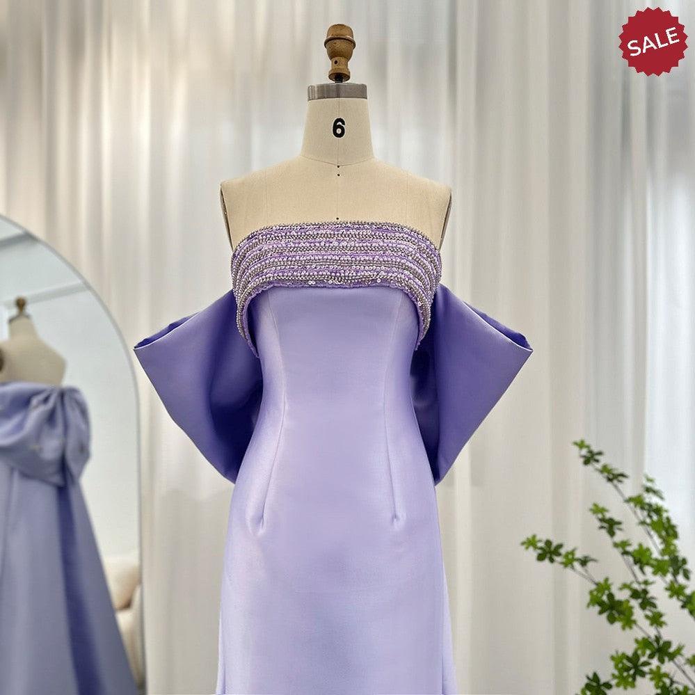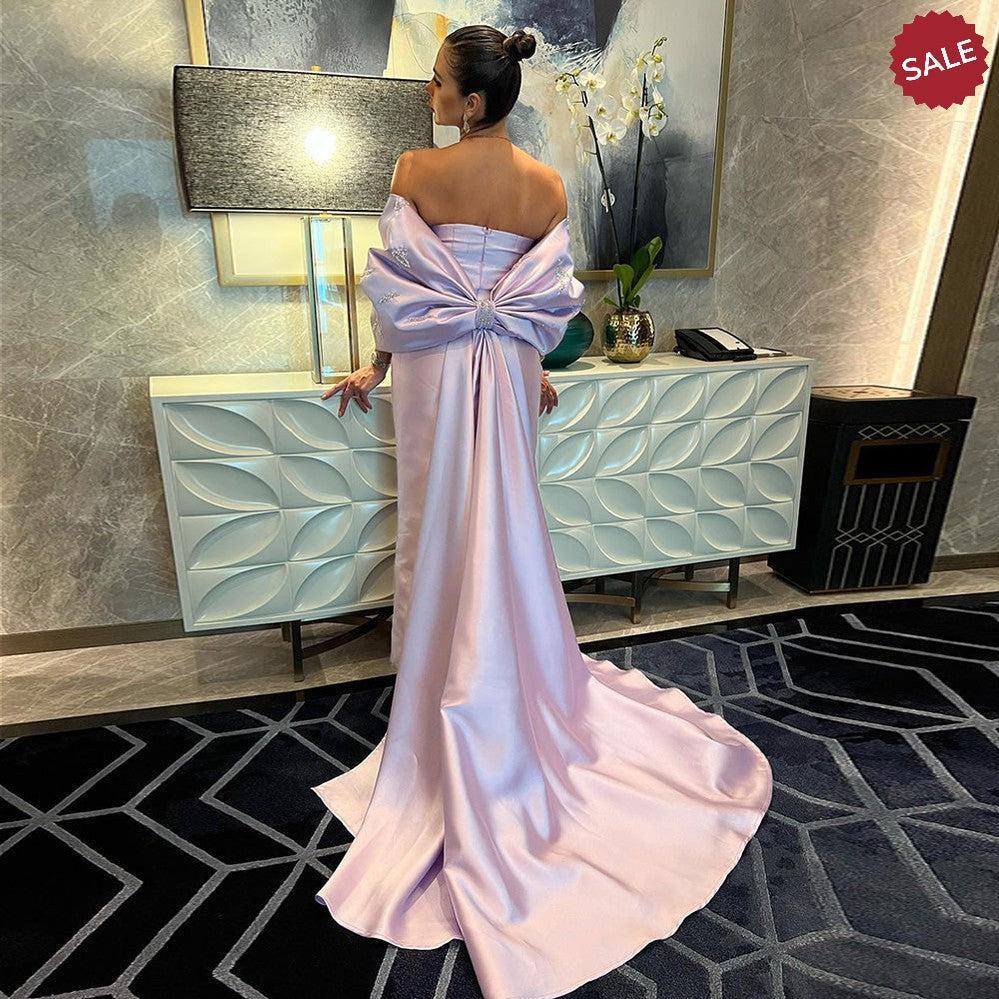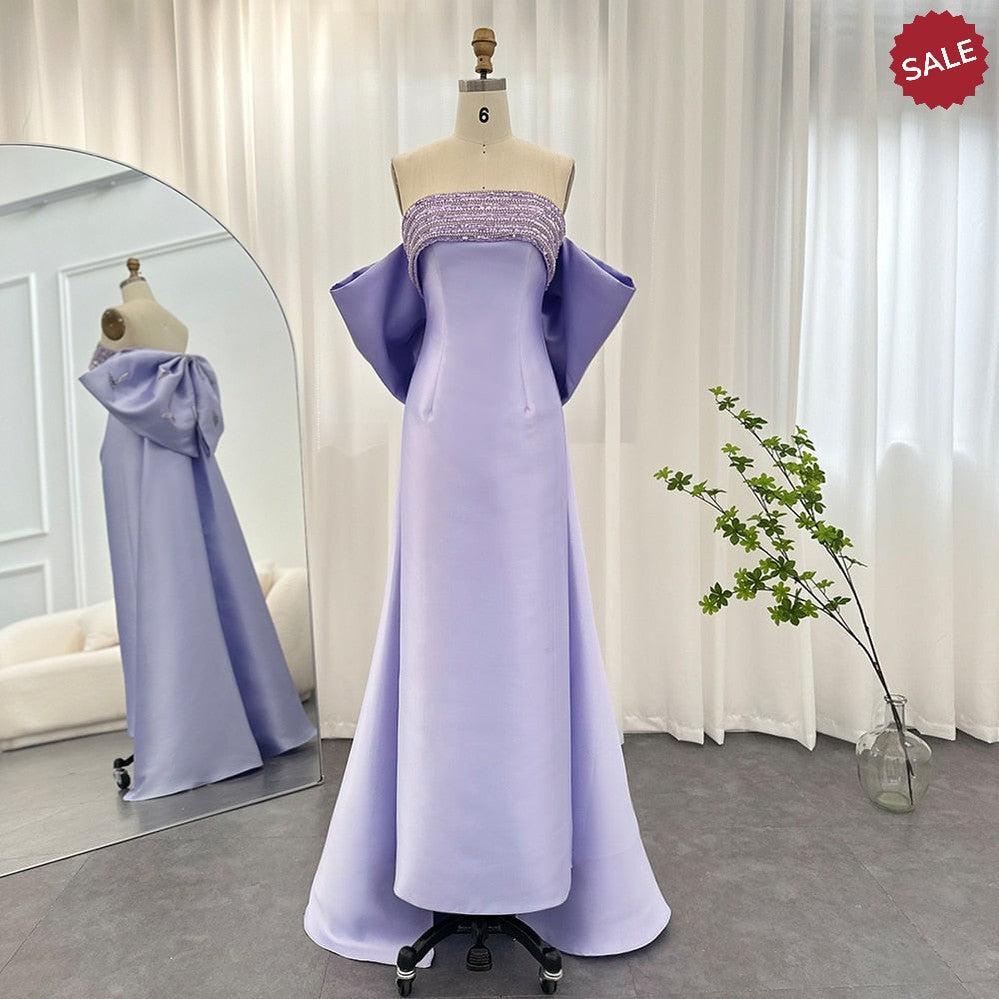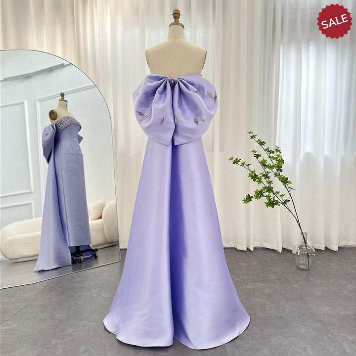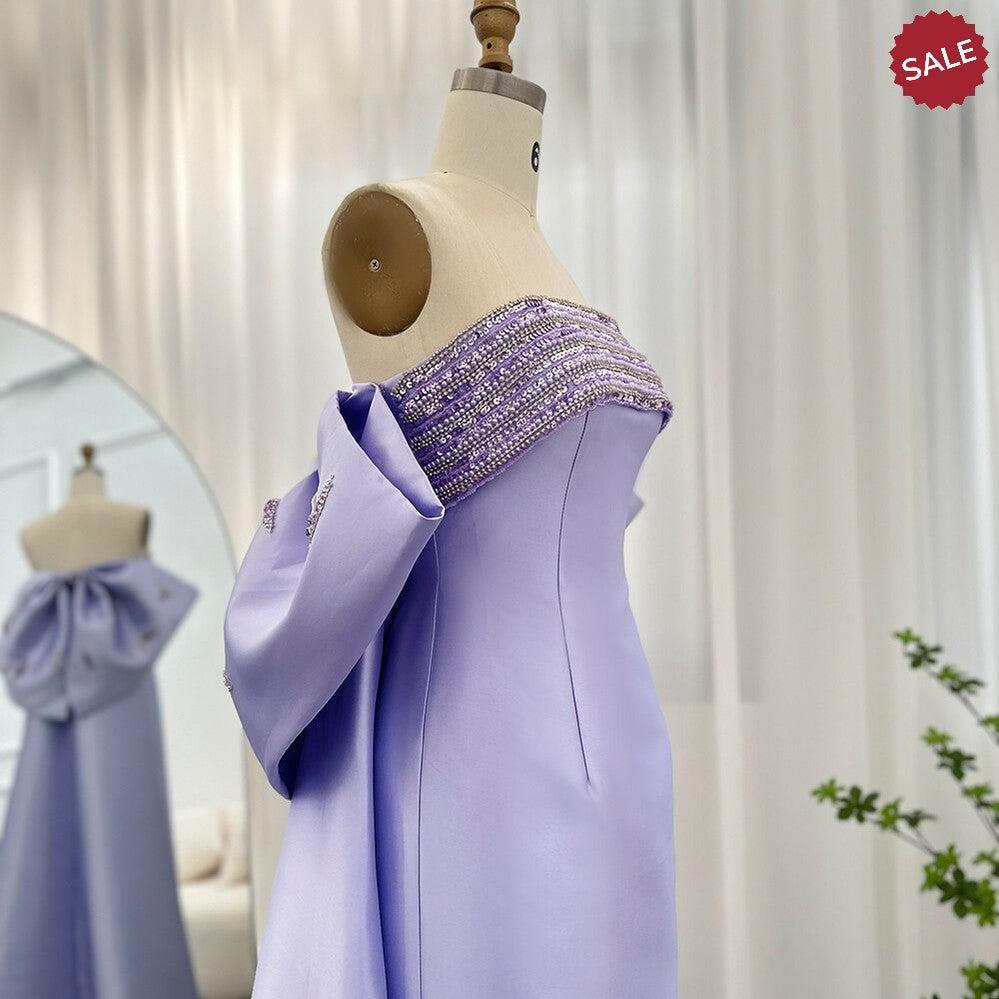 Elevate your evening look with Luxury Dubai Lilac Arabic Evening Dress. The elegant cape and intricate beading add a touch of glamour, while the bow detail exudes sophistication. Perfect for formal events or weddings, this dress is sure to make a statement.