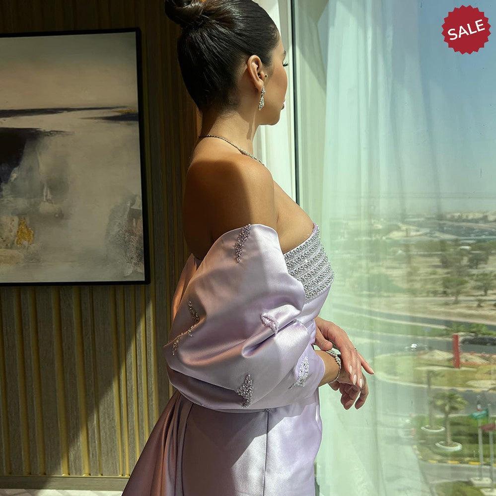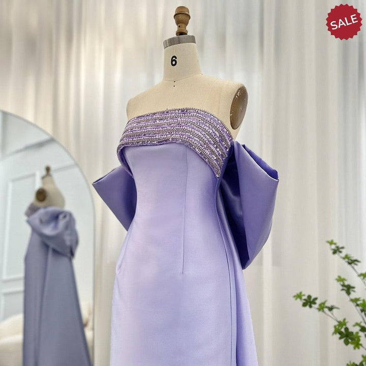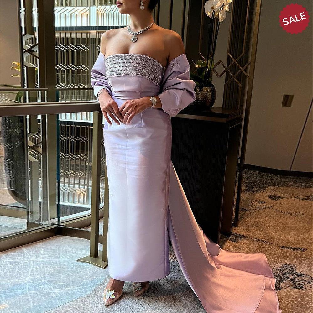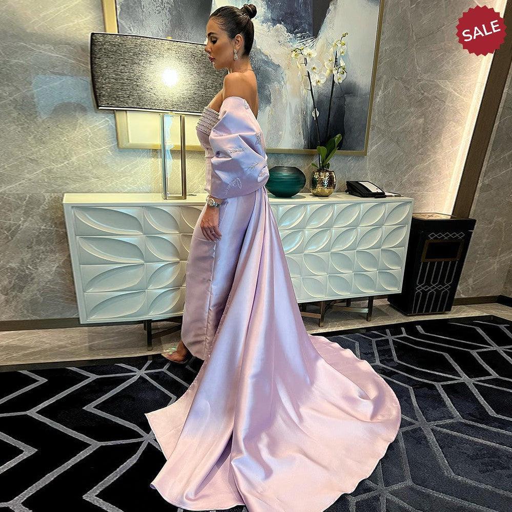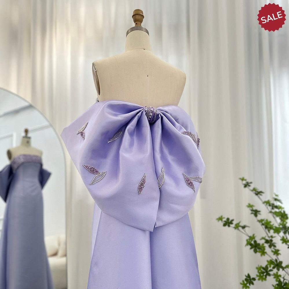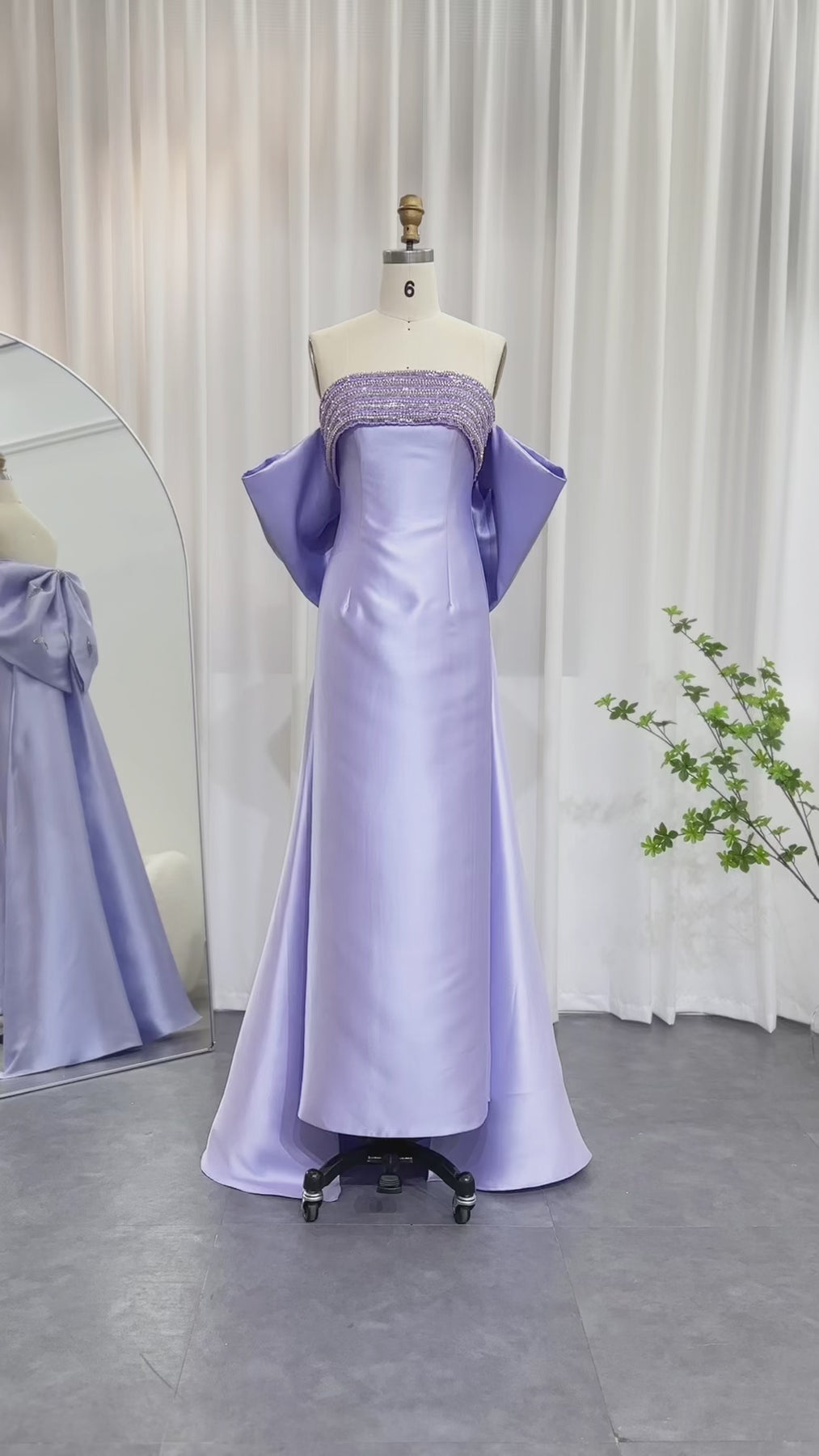 Elevate your evening look with Luxury Dubai Lilac Arabic Evening Dress. The elegant cape and intricate beading add a touch of glamour, while the bow detail exudes sophistication. Perfect for formal events or weddings, this dress is sure to make a statement.