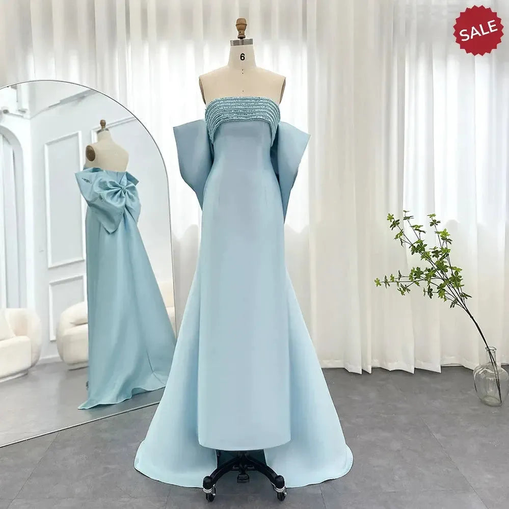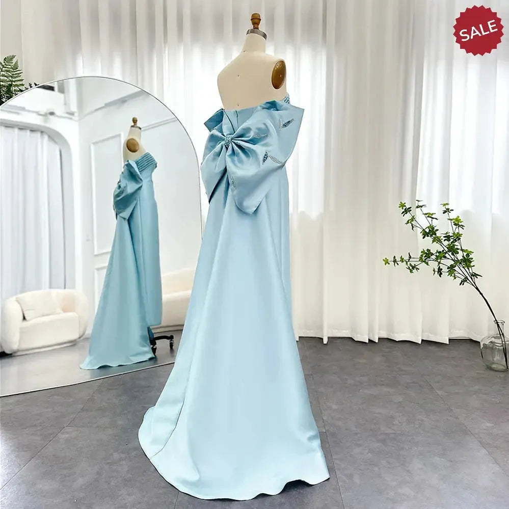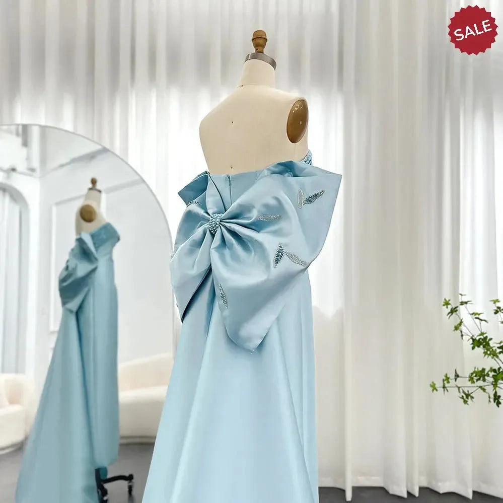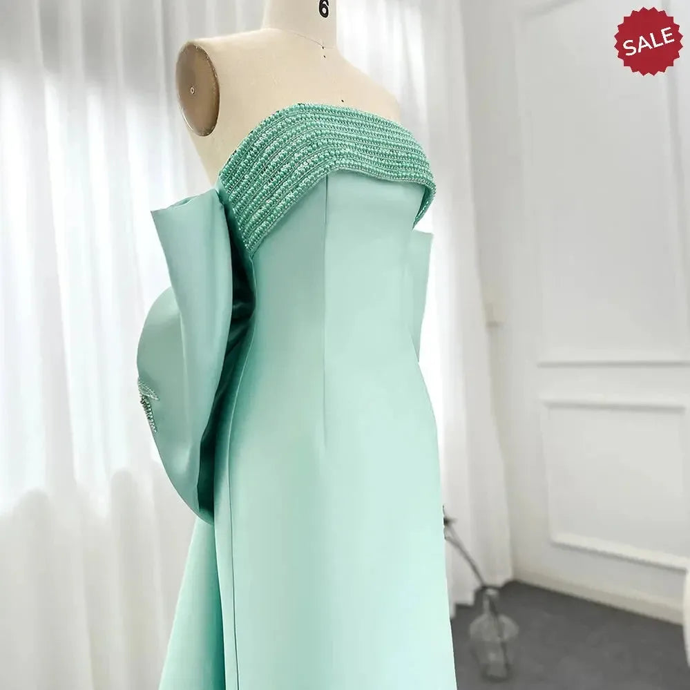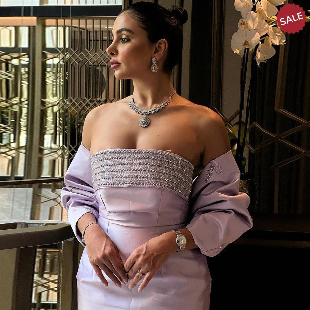 Elevate your evening look with Luxury Dubai Lilac Arabic Evening Dress. The elegant cape and intricate beading add a touch of glamour, while the bow detail exudes sophistication. Perfect for formal events or weddings, this dress is sure to make a statement.